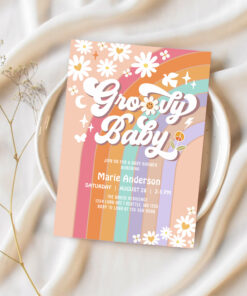 Pink Daisy Rainbow Hippie 70S Retro Baby Shower Invitation