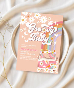 Pink Daisy Rainbow Hippie Groovy Van Baby Shower Invitation