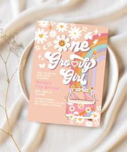 Pink One Groovy Year Daisy Rainbow 1st Birthday Invitation