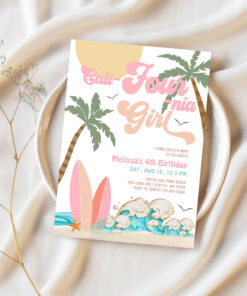 Pink Peach Cali Four Nia Girl Surfing 4th Birthday Invitation