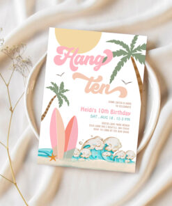 Pink Peach Girl Hang Ten Surfing Birthday Party Invitation