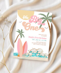 Pink Peach Girl The Big One Surfing 1st Birthday Invitation