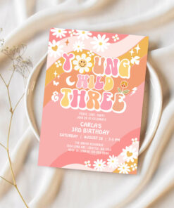 Young Wild And Three Groovy Pink Peach Birthday Invitation