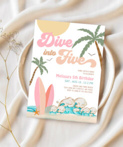 Dive Into Five Girl Surfing 5th Birthday Party Invitation