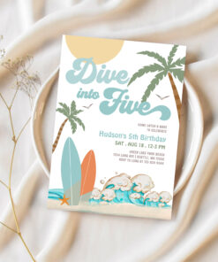 Dive Into Five Surfing Boy 5th Birthday Party Invitation