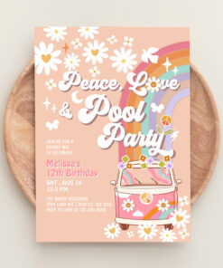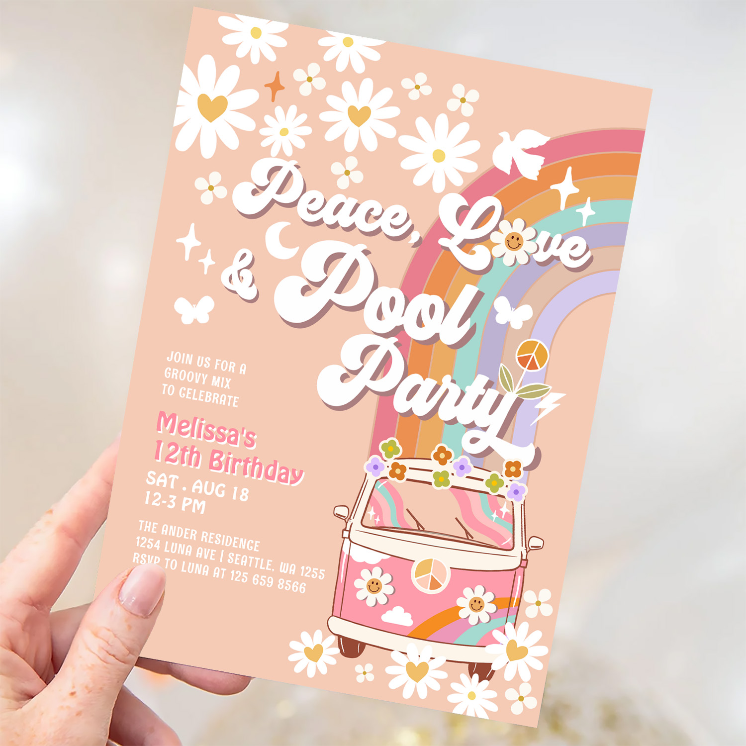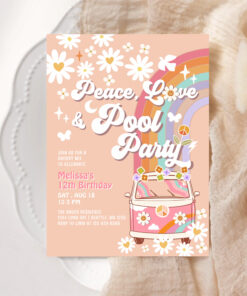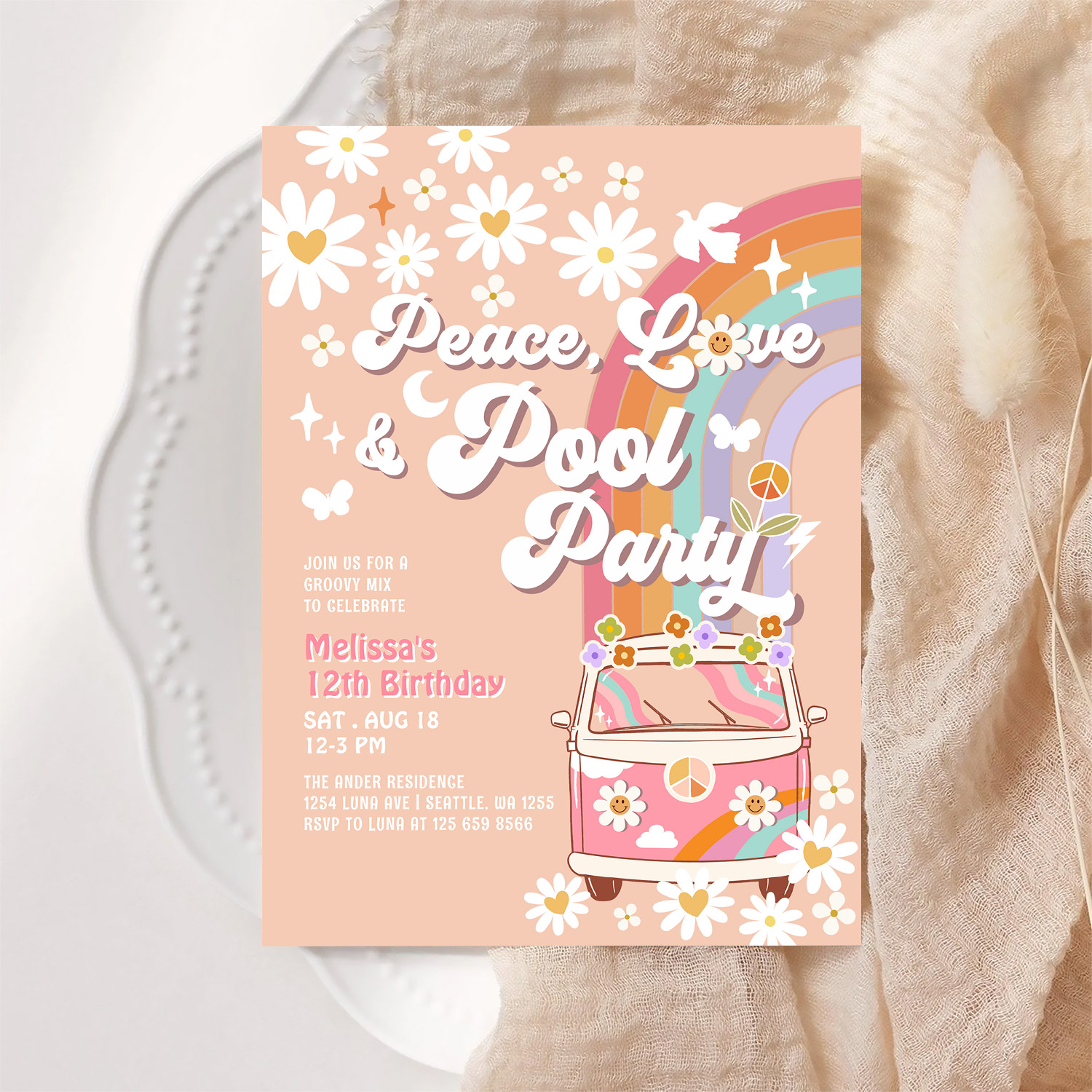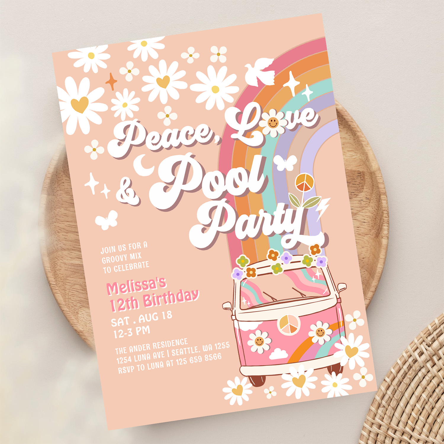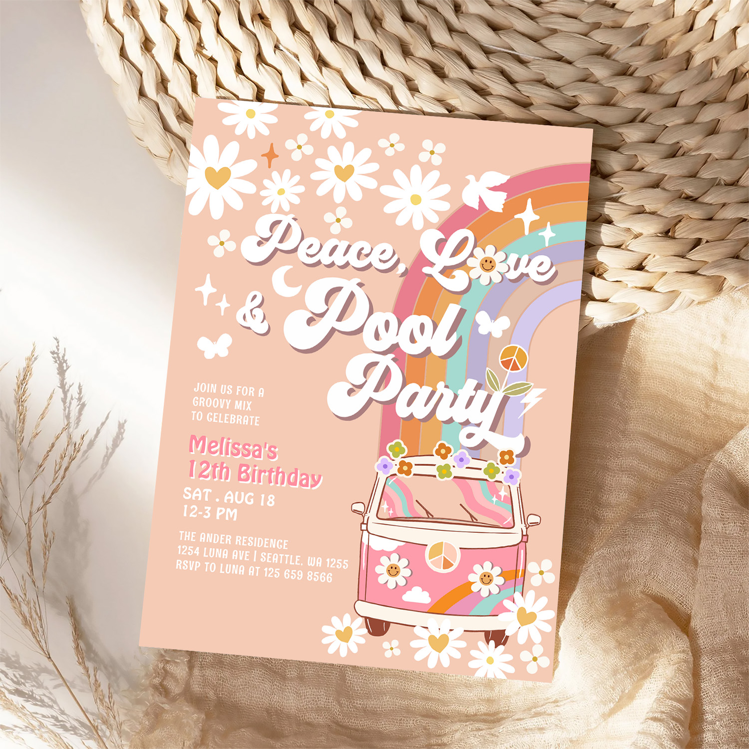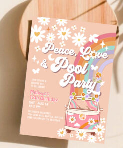 Any Age Pink Peace Love Pool Party Groovy Birthday Invitation