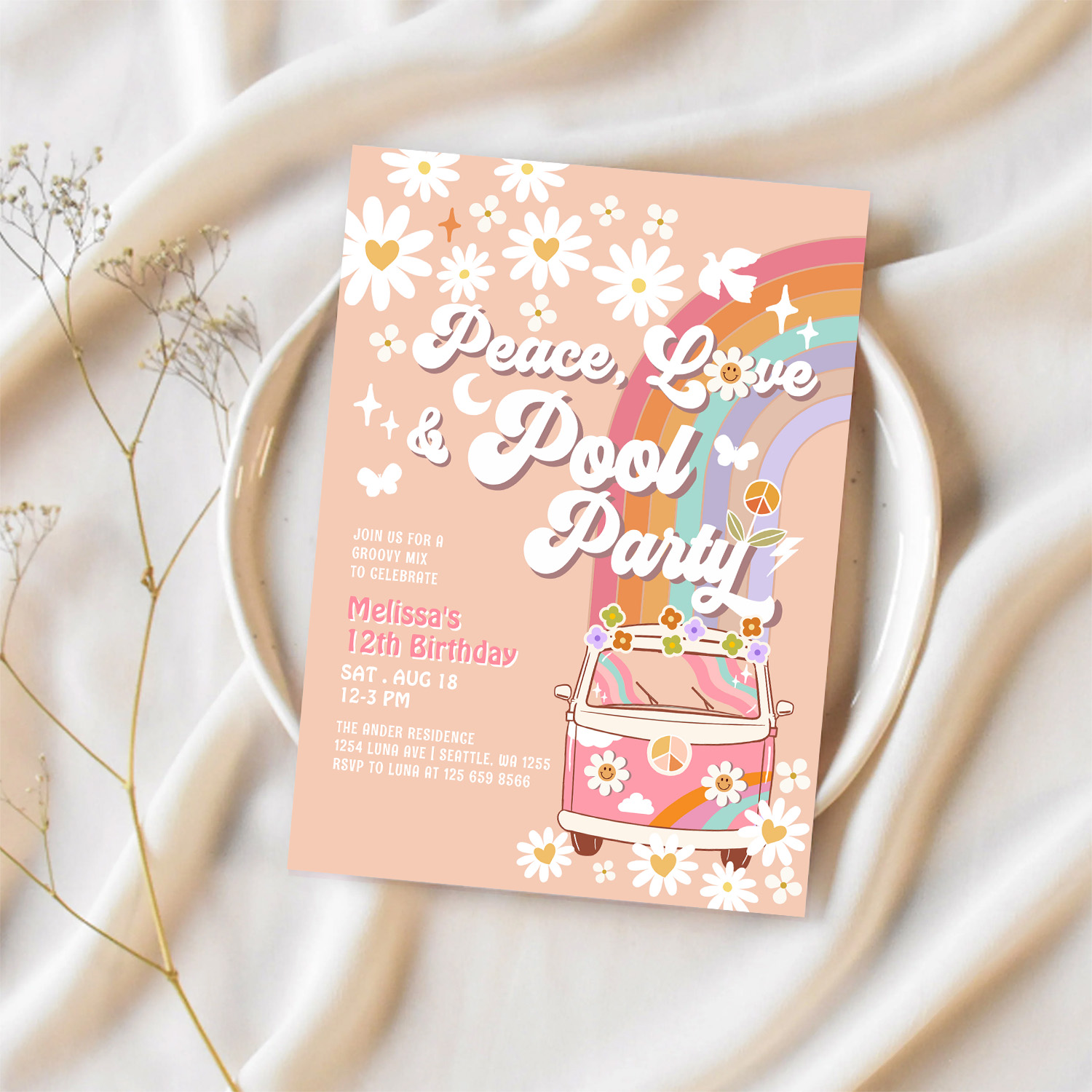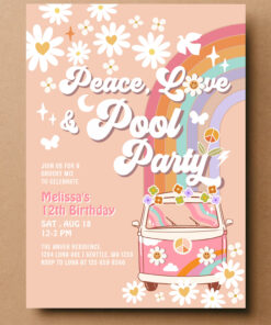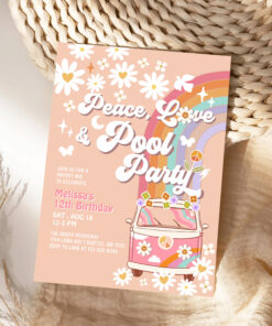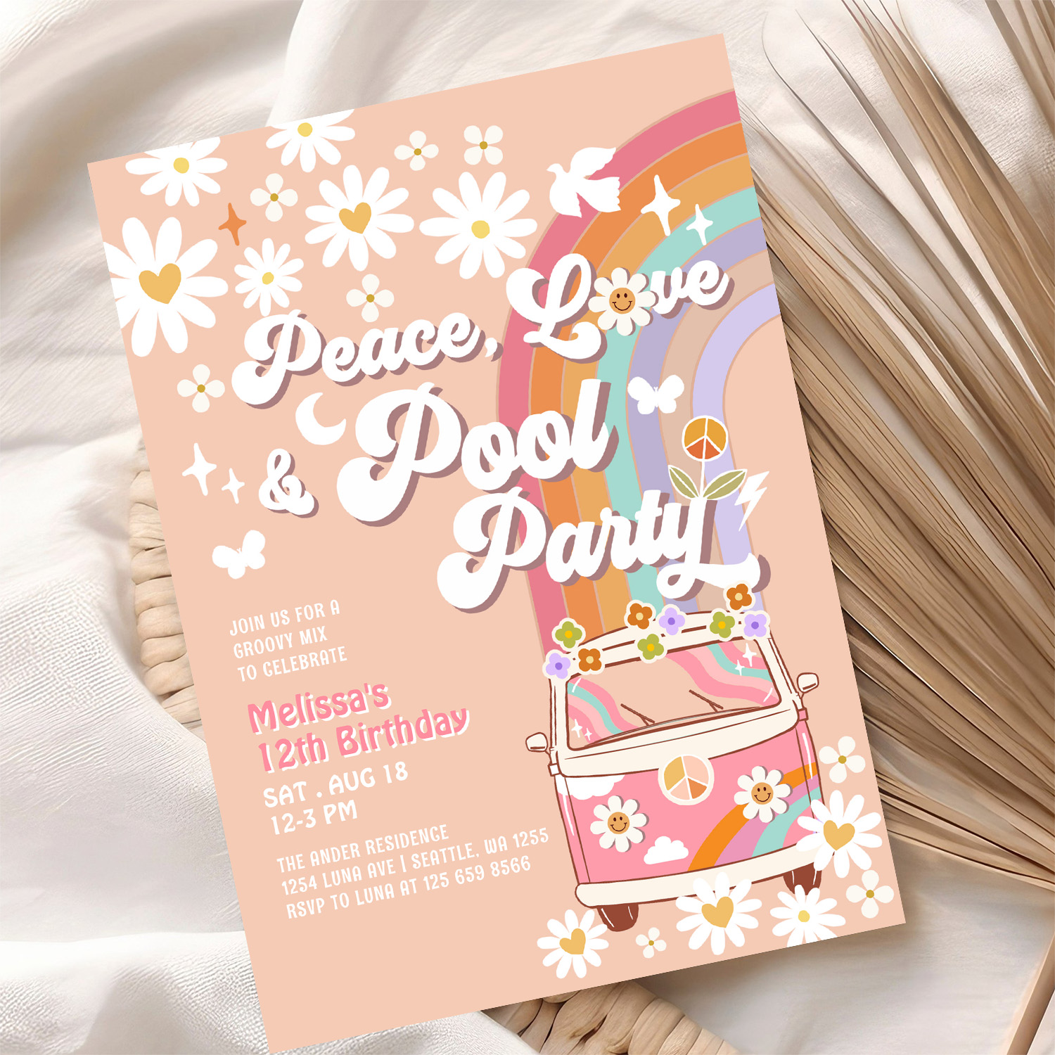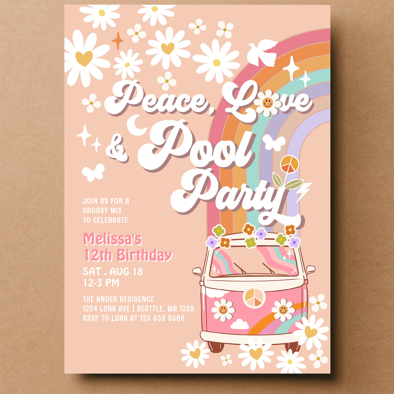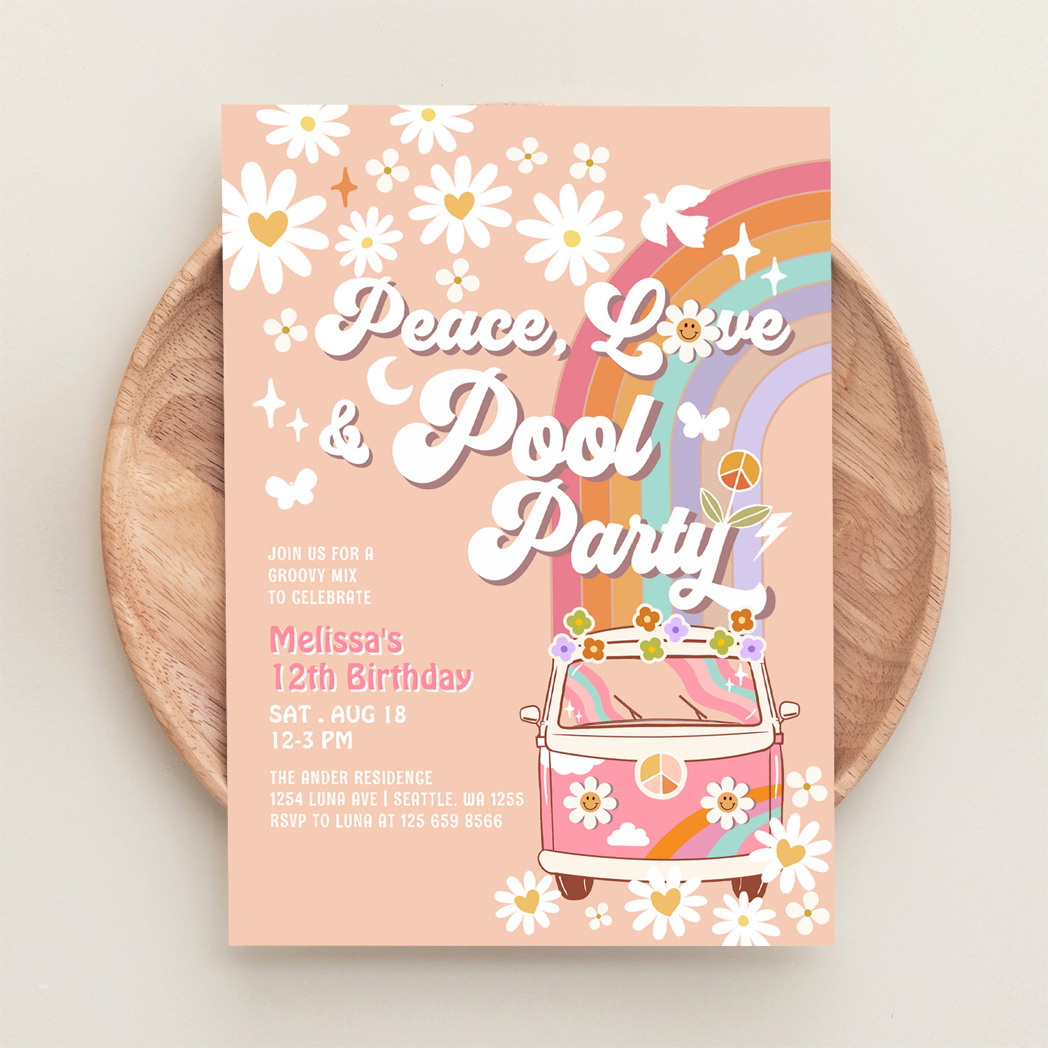 Any Age Pink Peace Love Pool Party Groovy Birthday Invitation