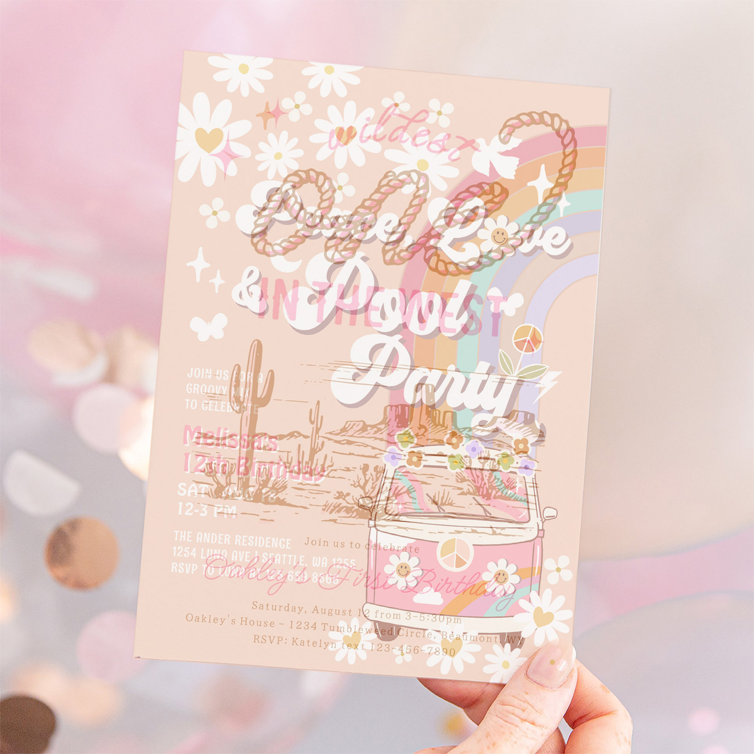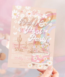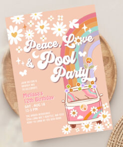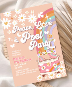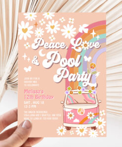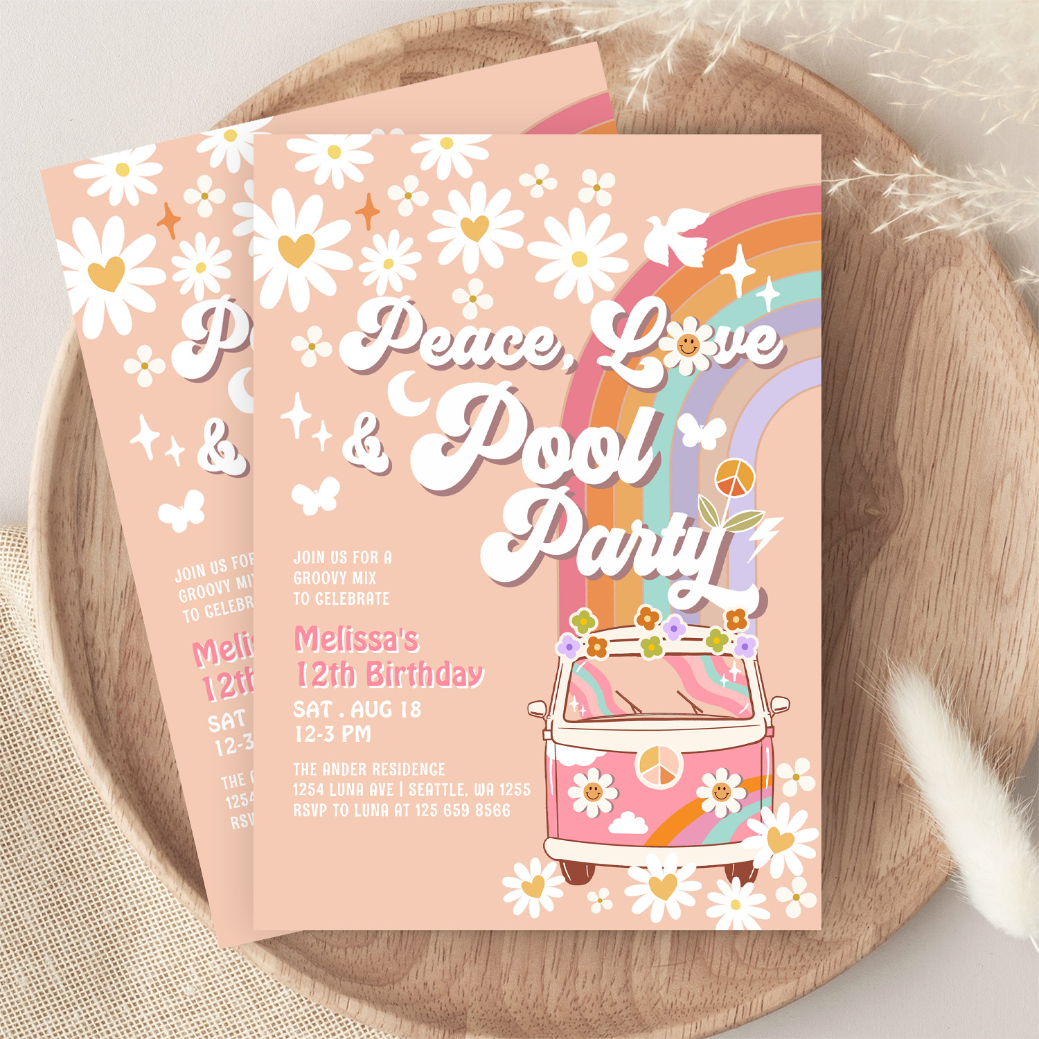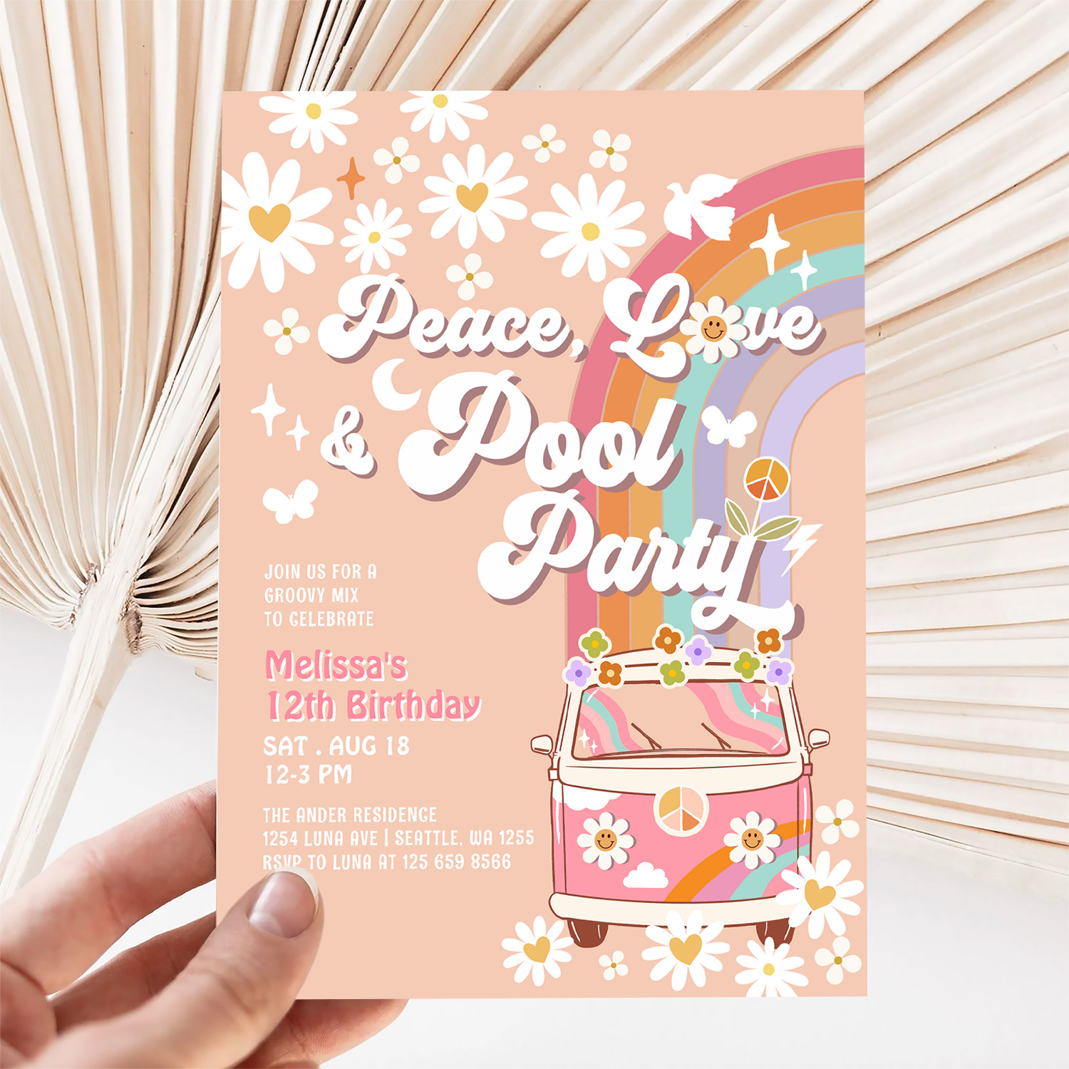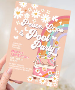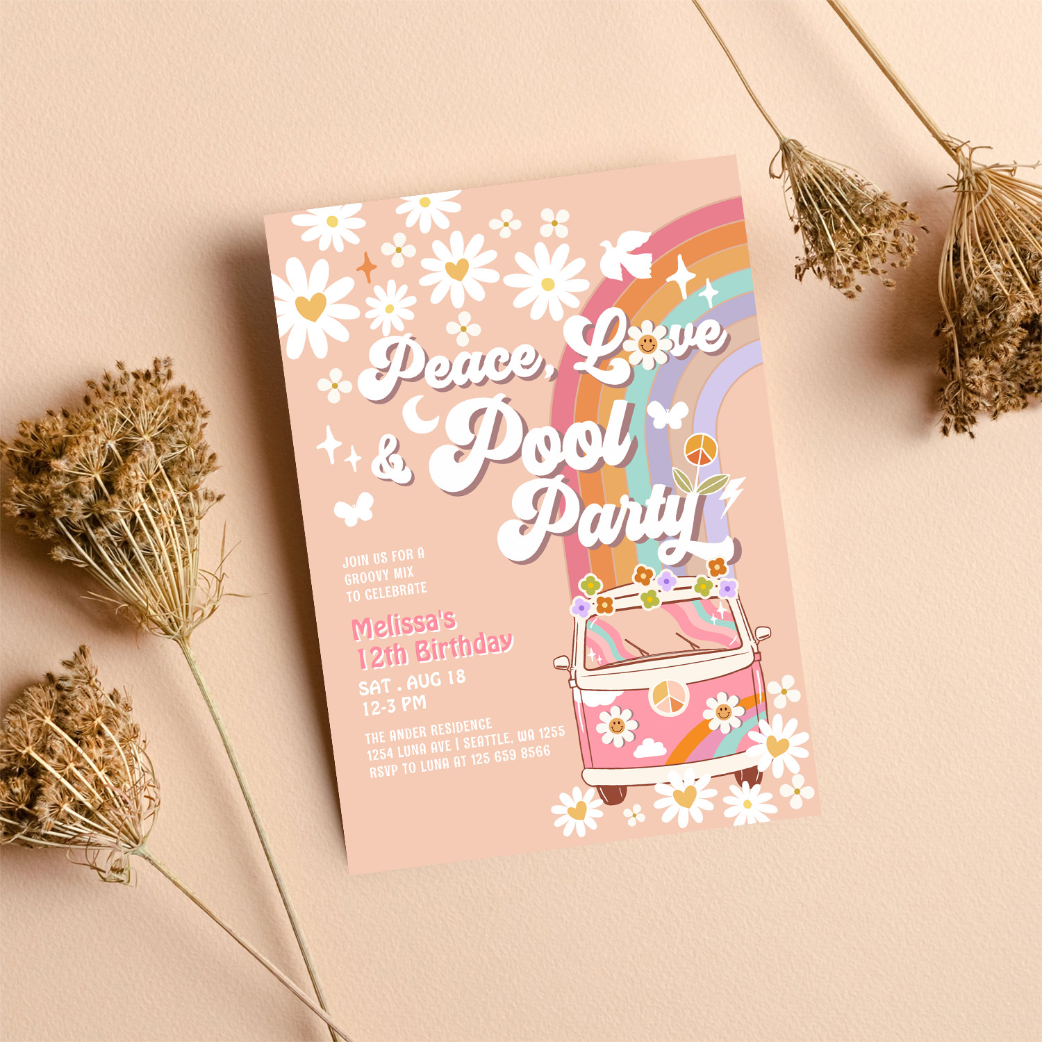 Any Age Pink Peace Love Pool Party Groovy Birthday Invitation