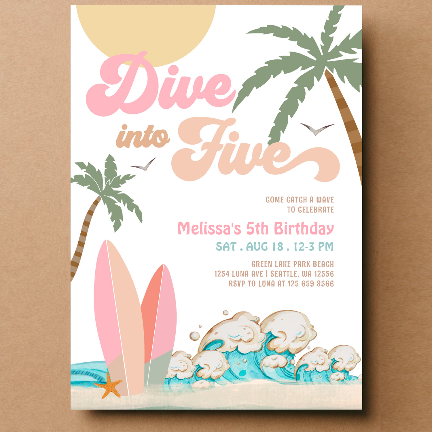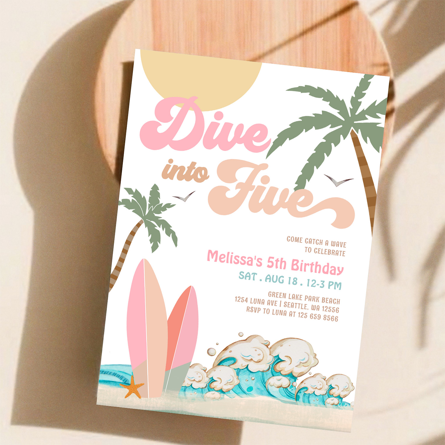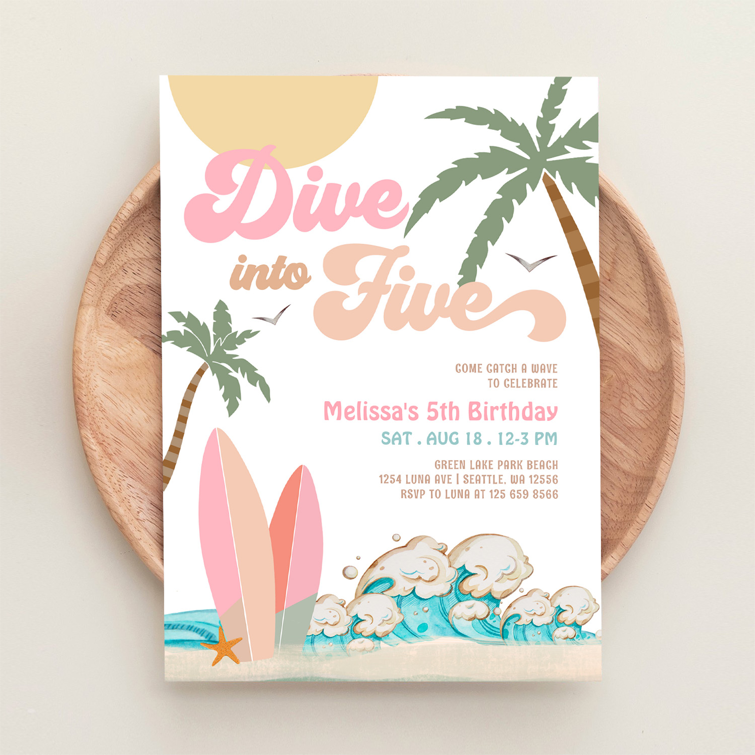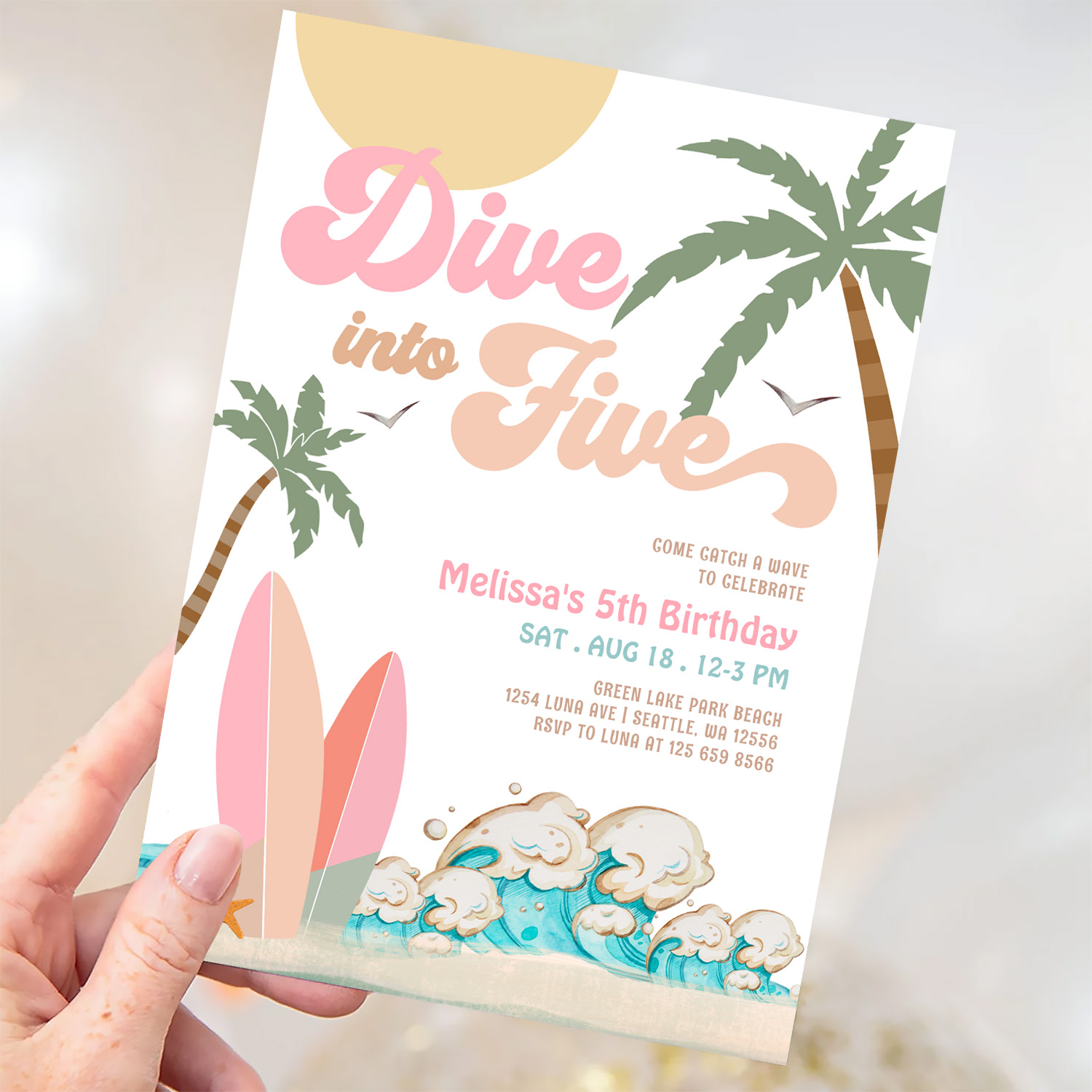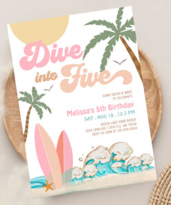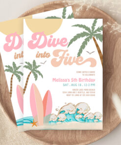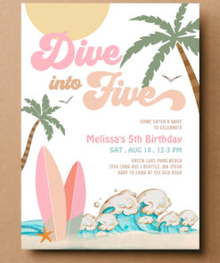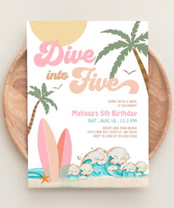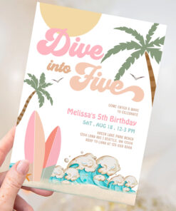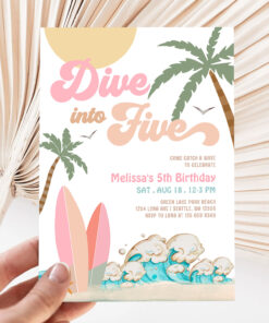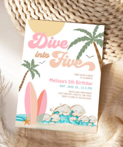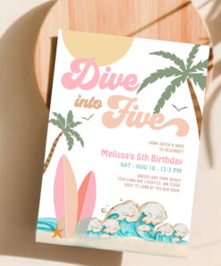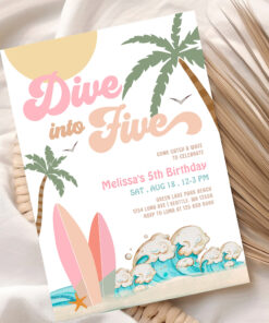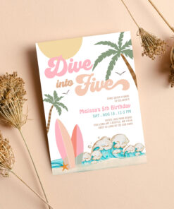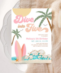 Dive Into Five Girl Surfing 5th Birthday Party Invitation