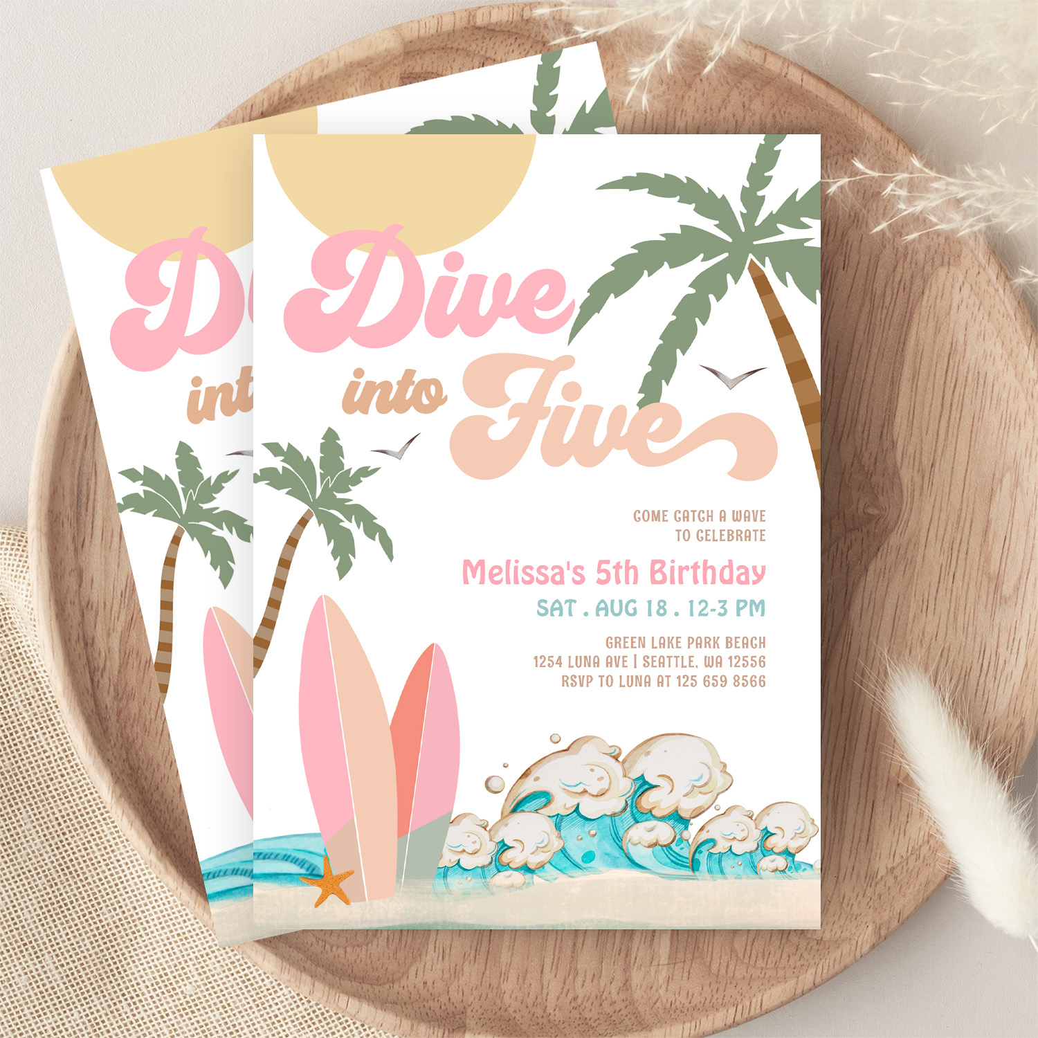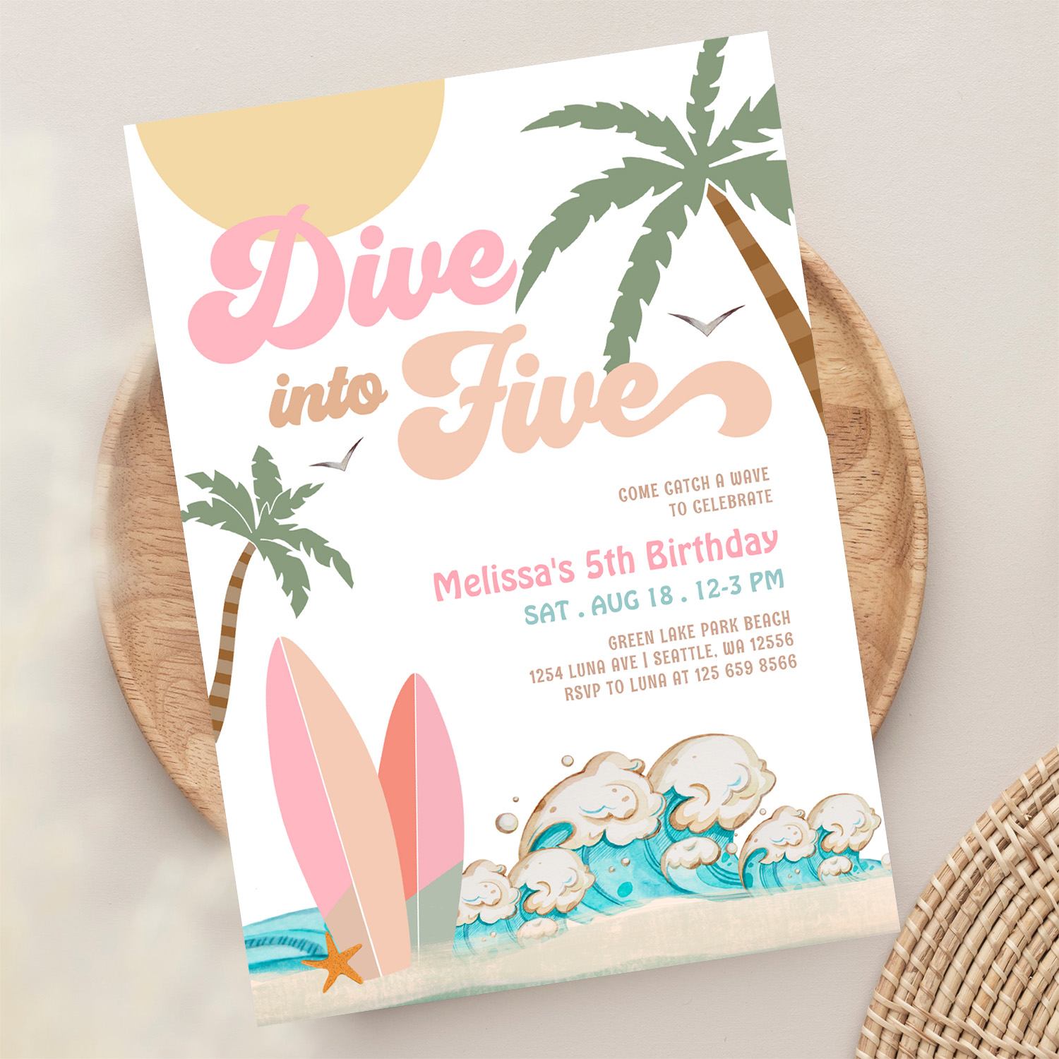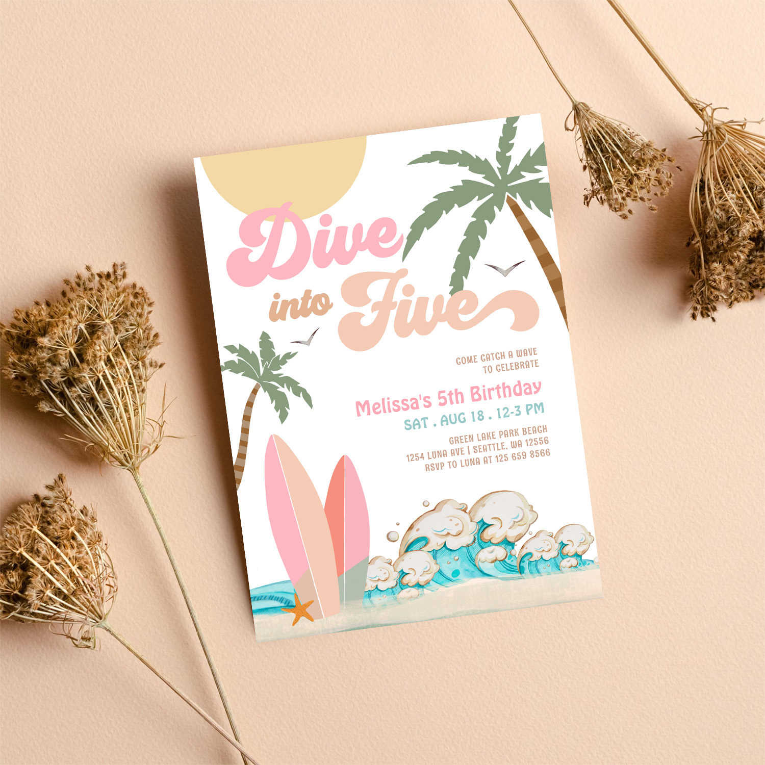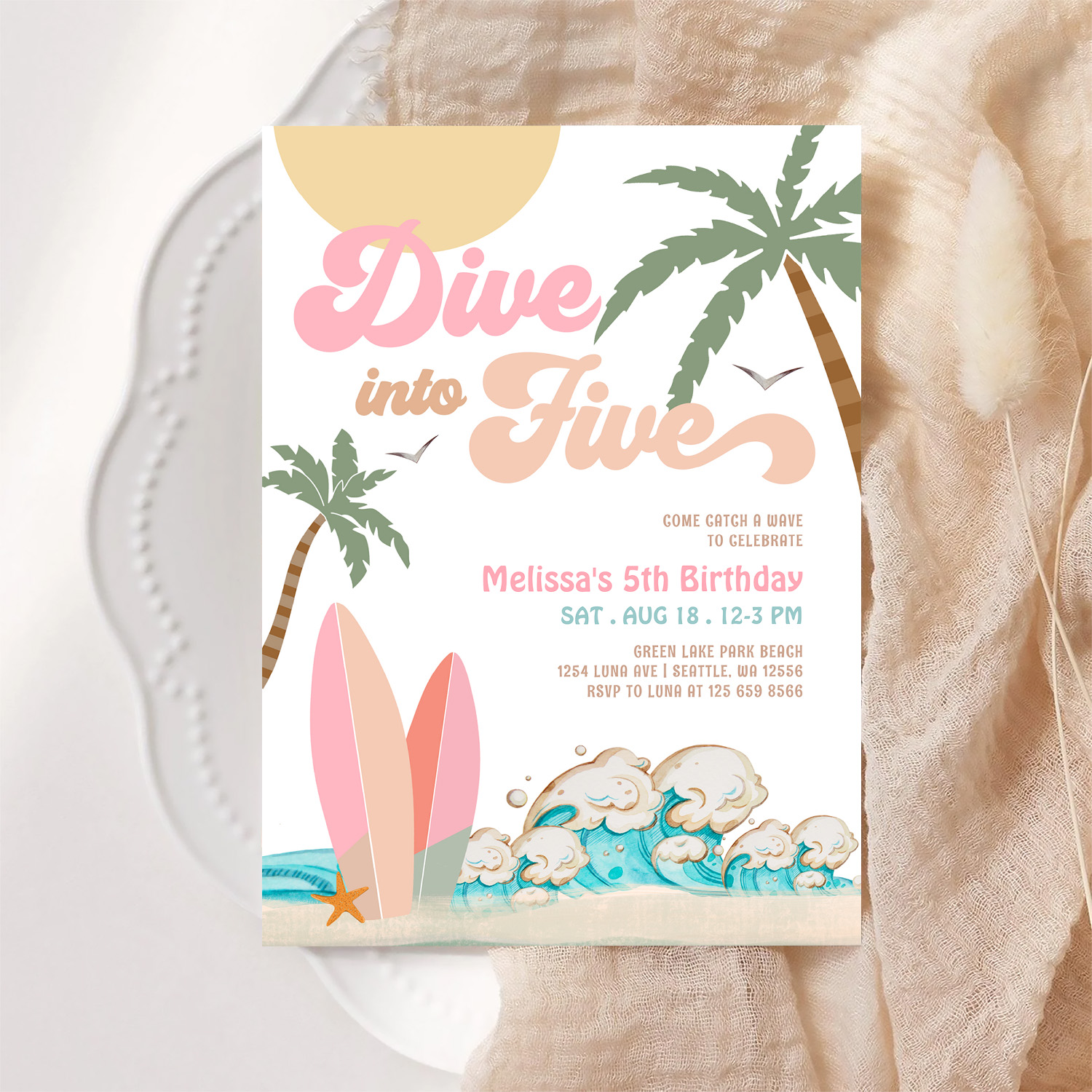 Dive Into Five Girl Surfing 5th Birthday Party Invitation