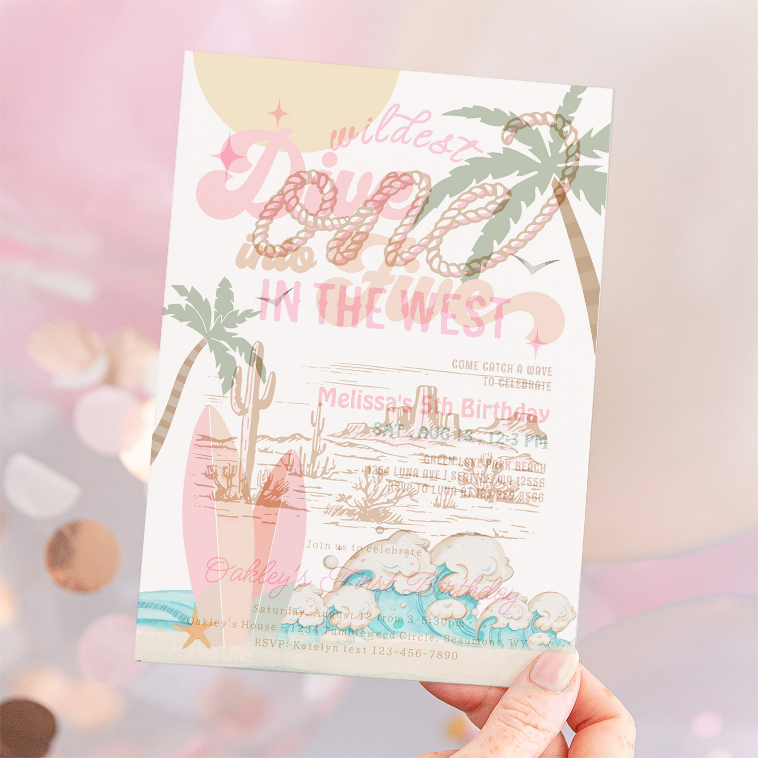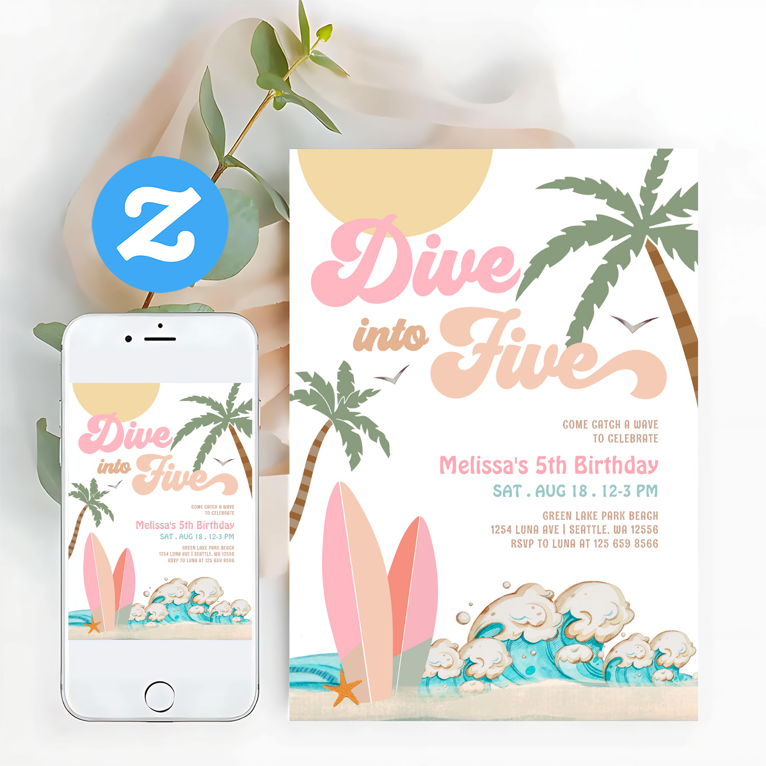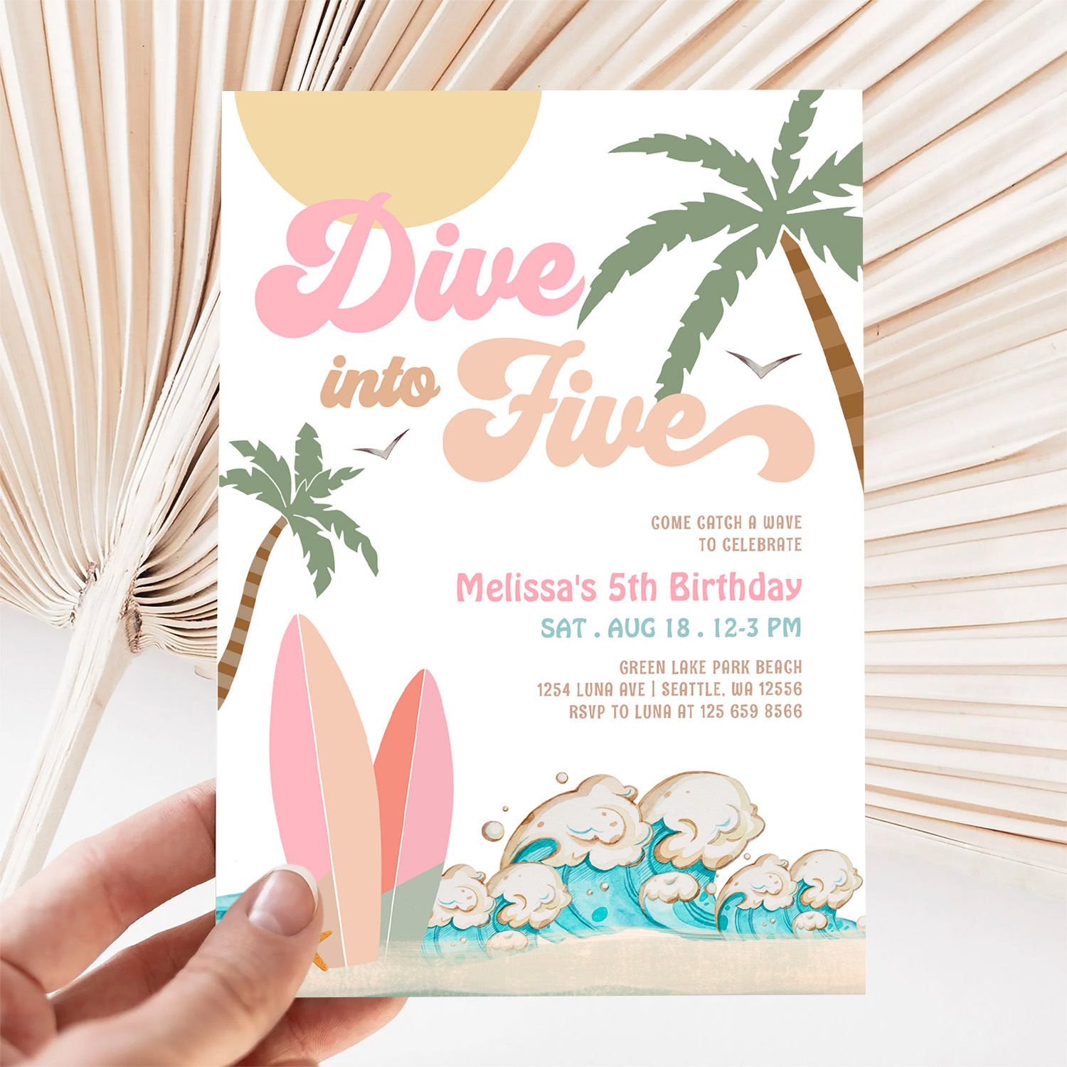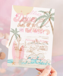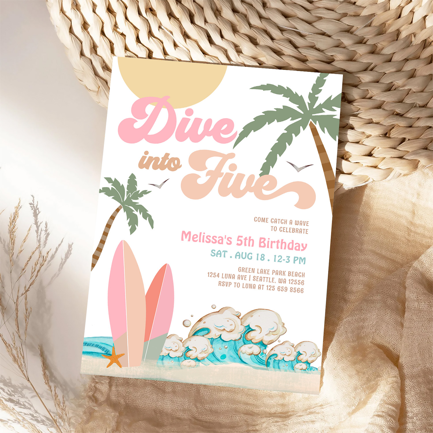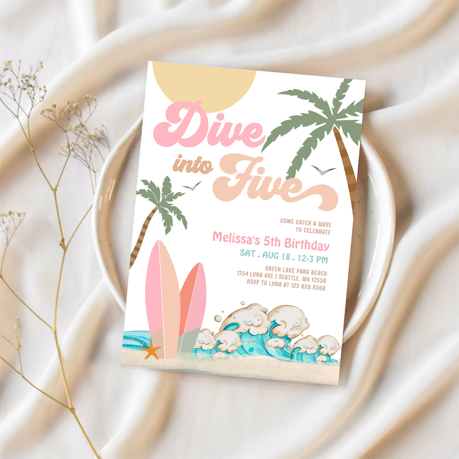 Dive Into Five Girl Surfing 5th Birthday Party Invitation