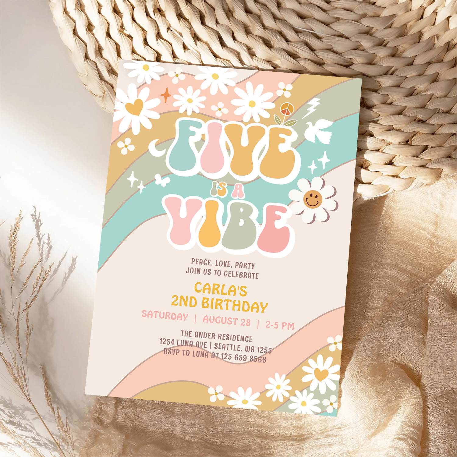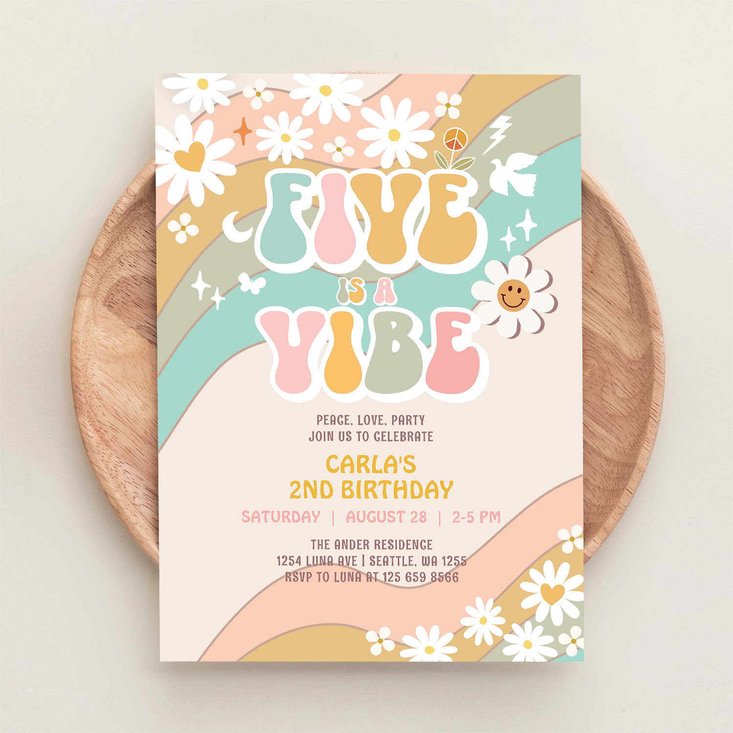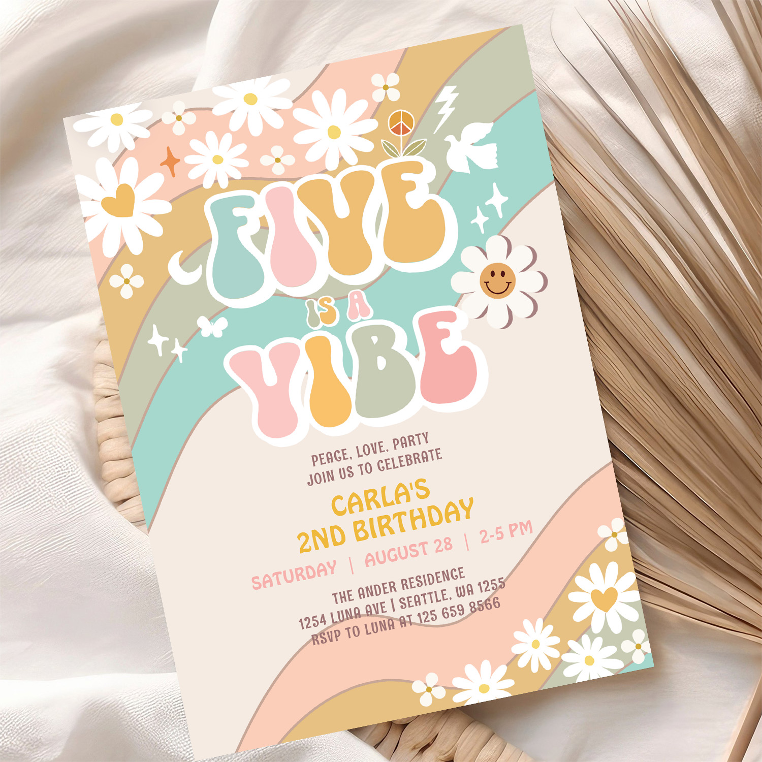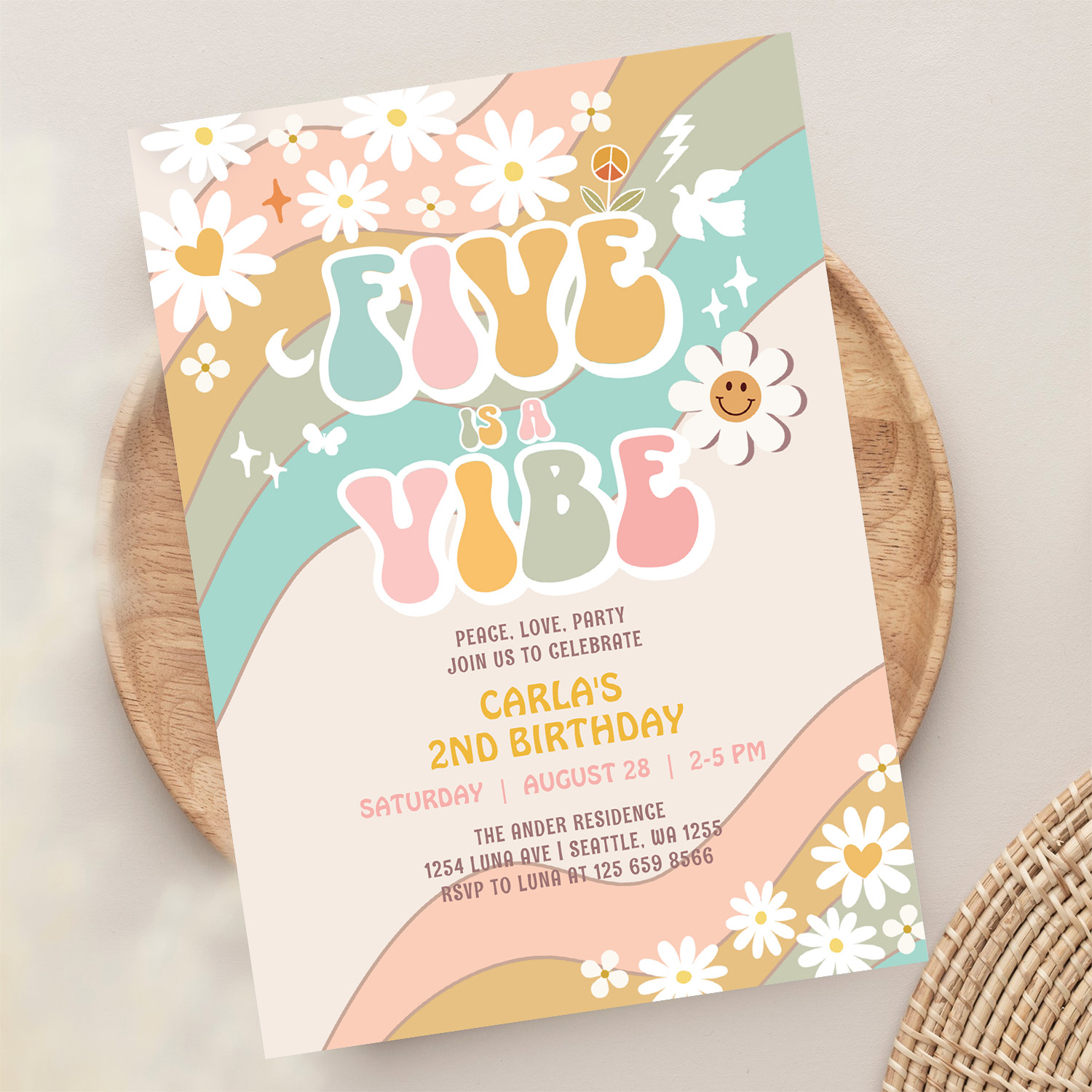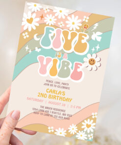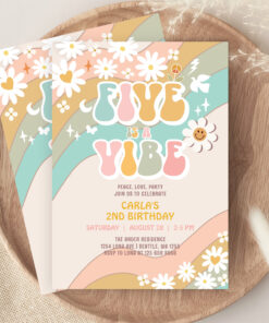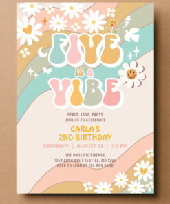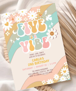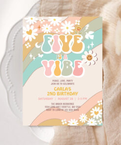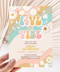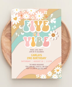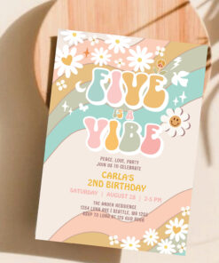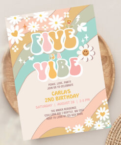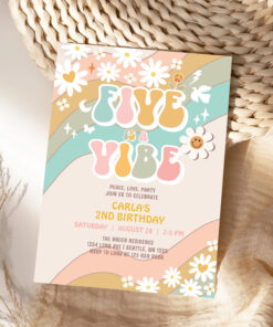 Five Is A Vibe Daisy Hippie Groovy Retro Birthday Invitation