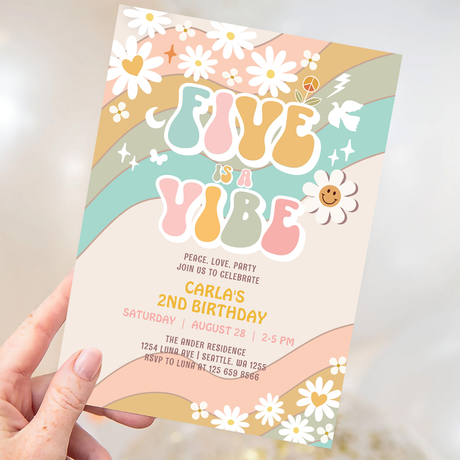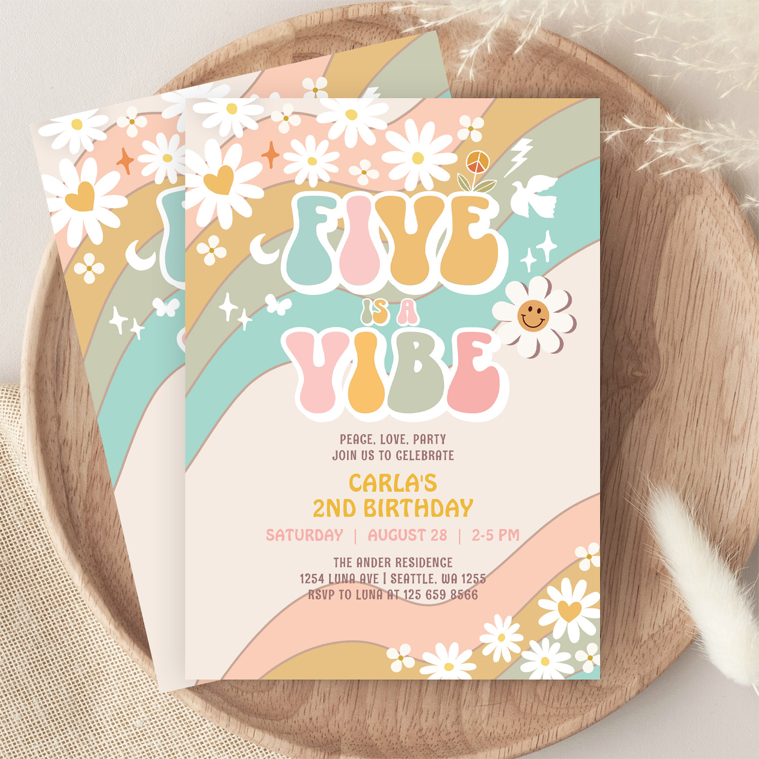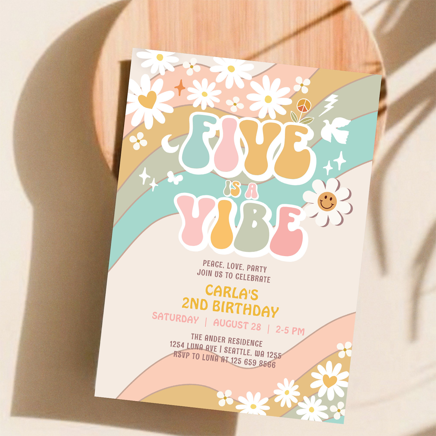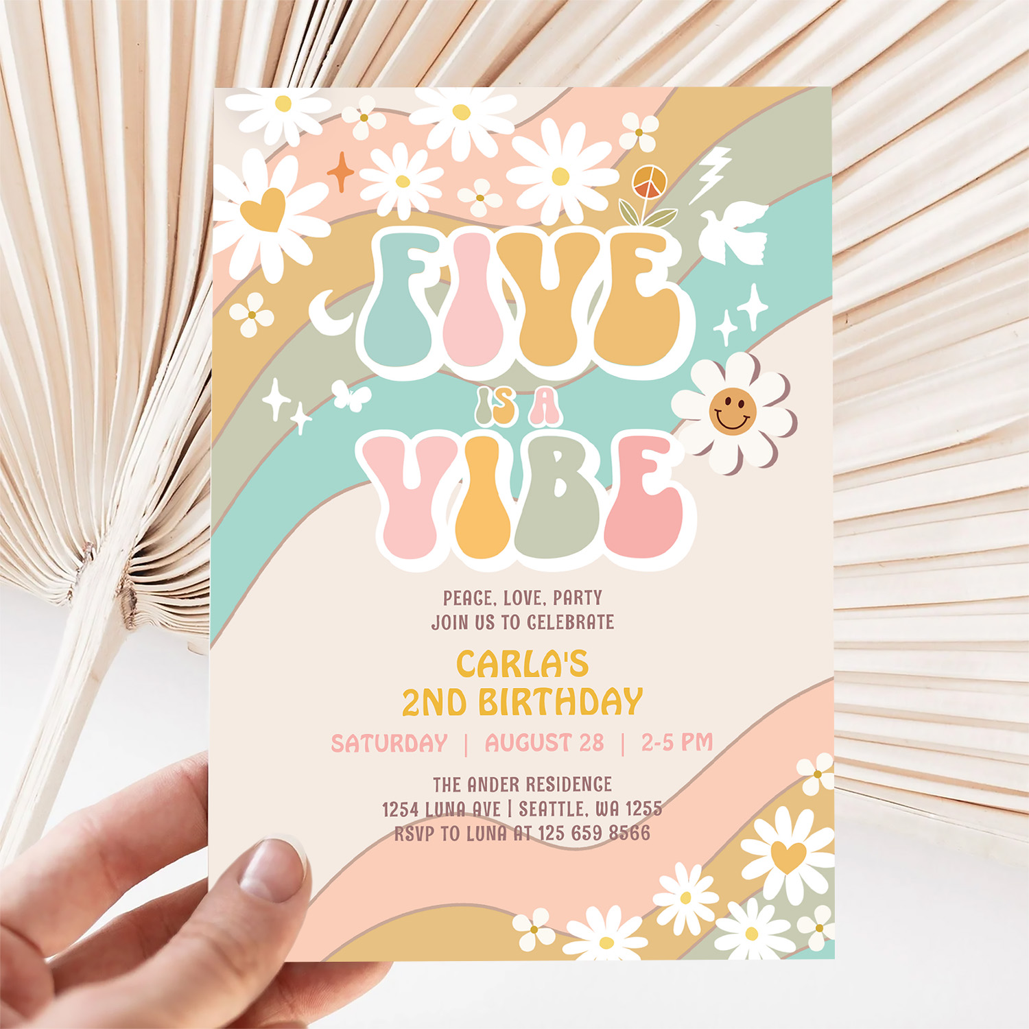 Five Is A Vibe Daisy Hippie Groovy Retro Birthday Invitation
