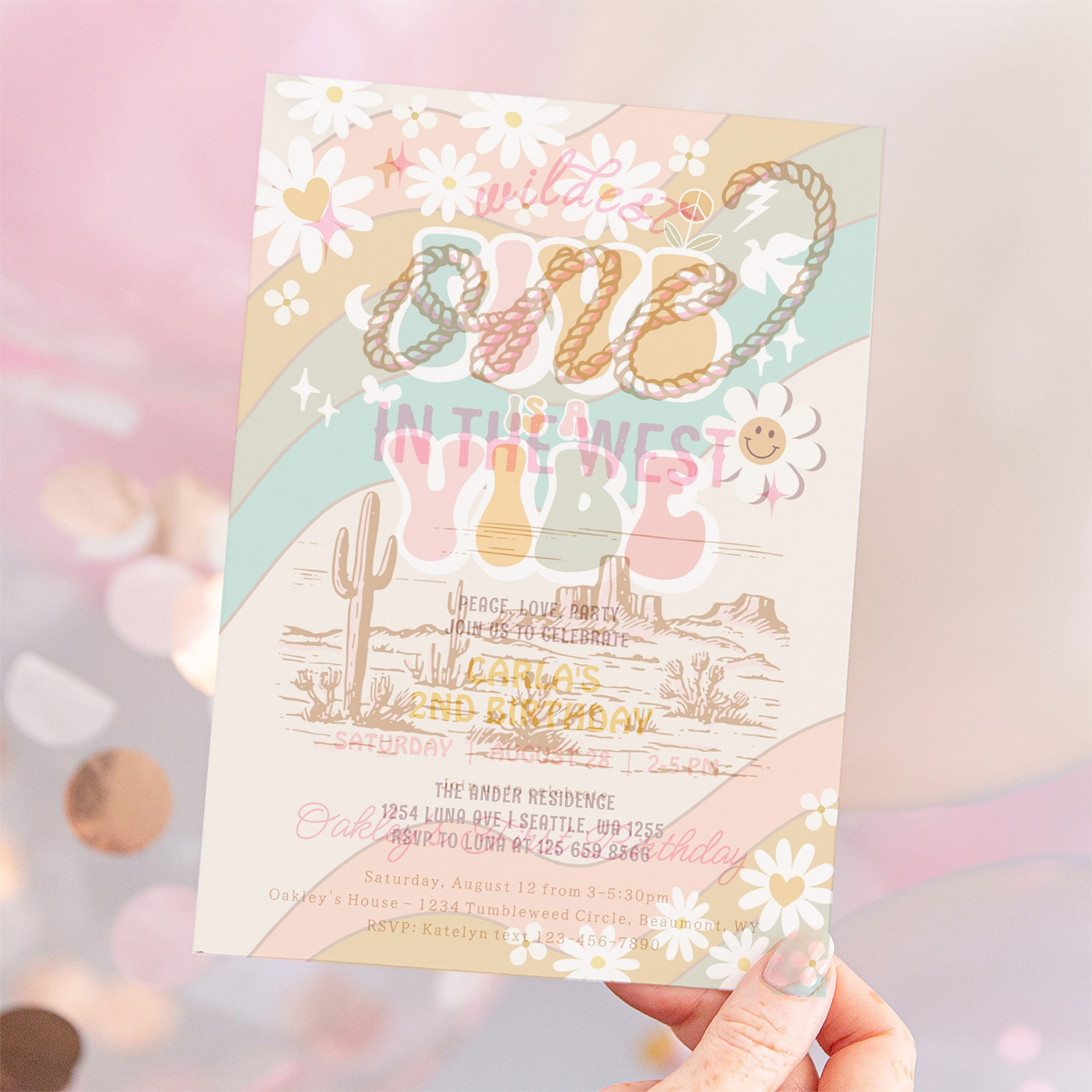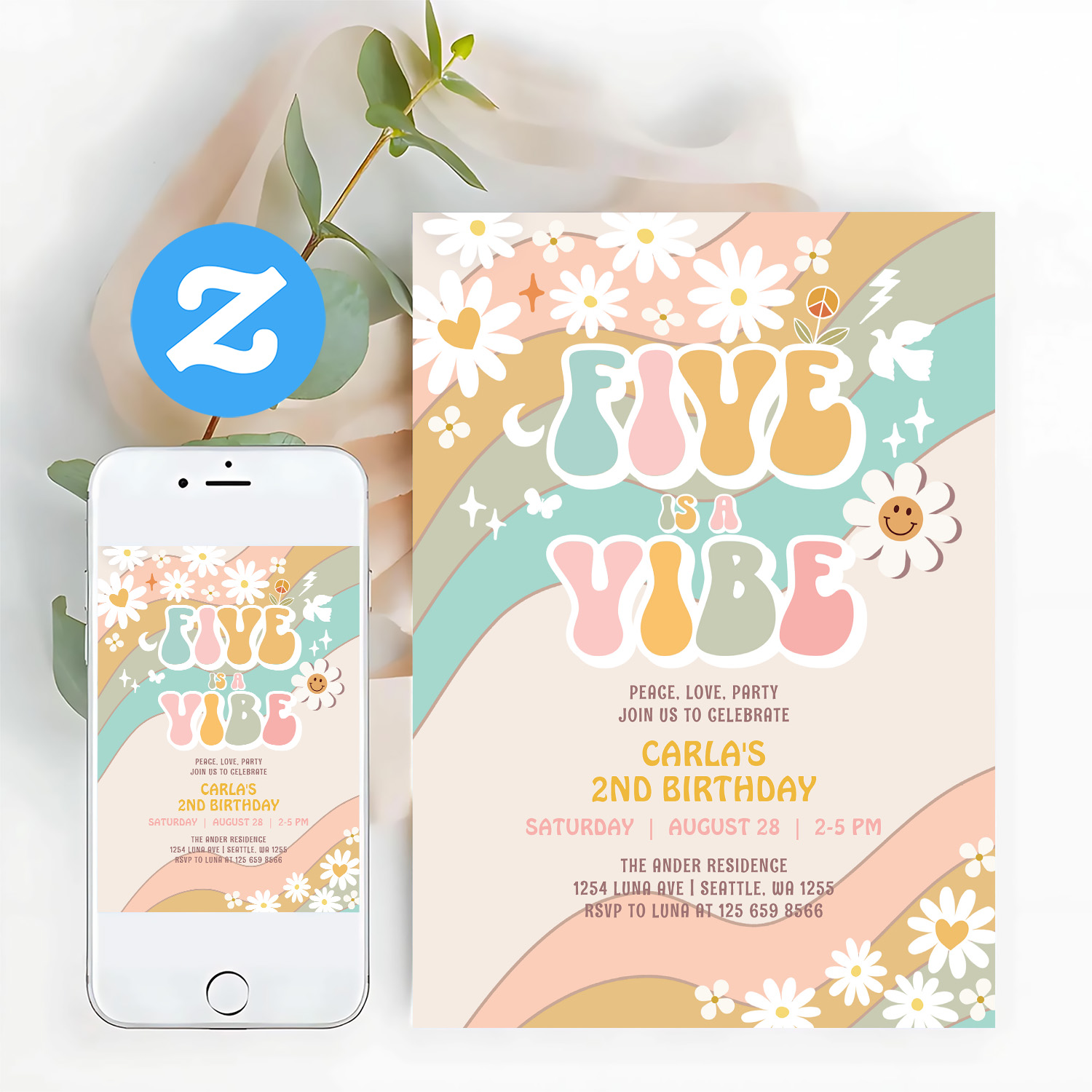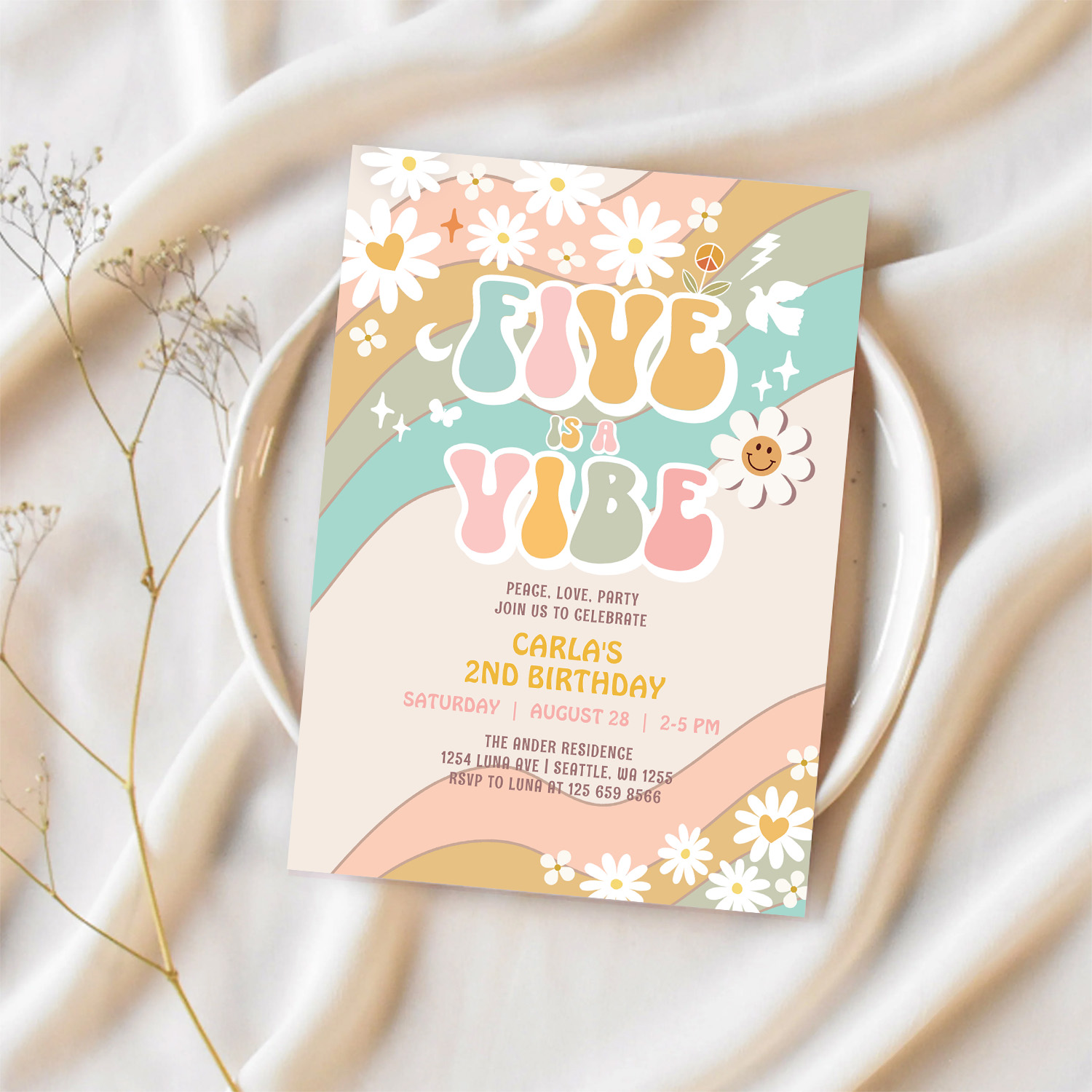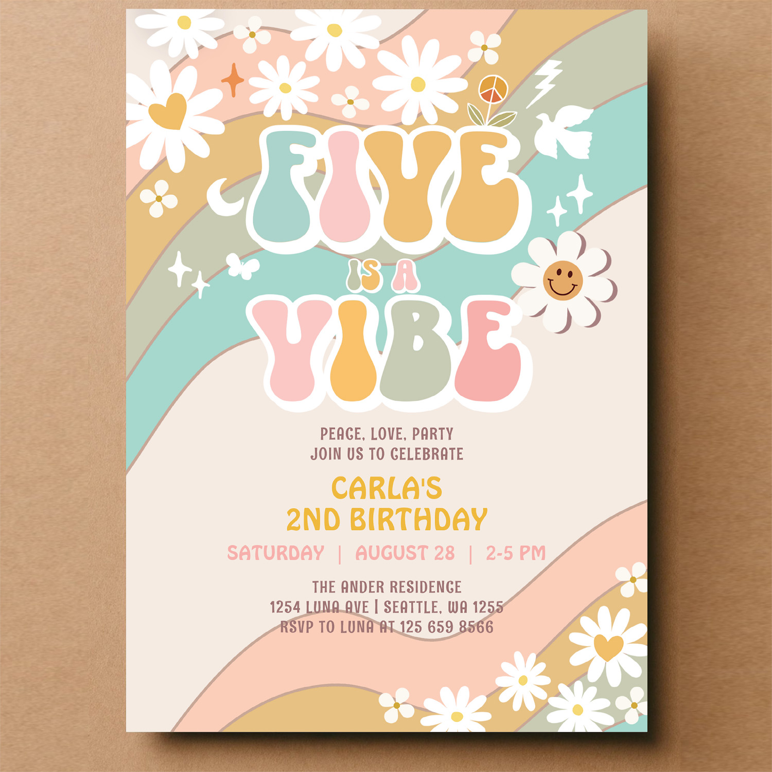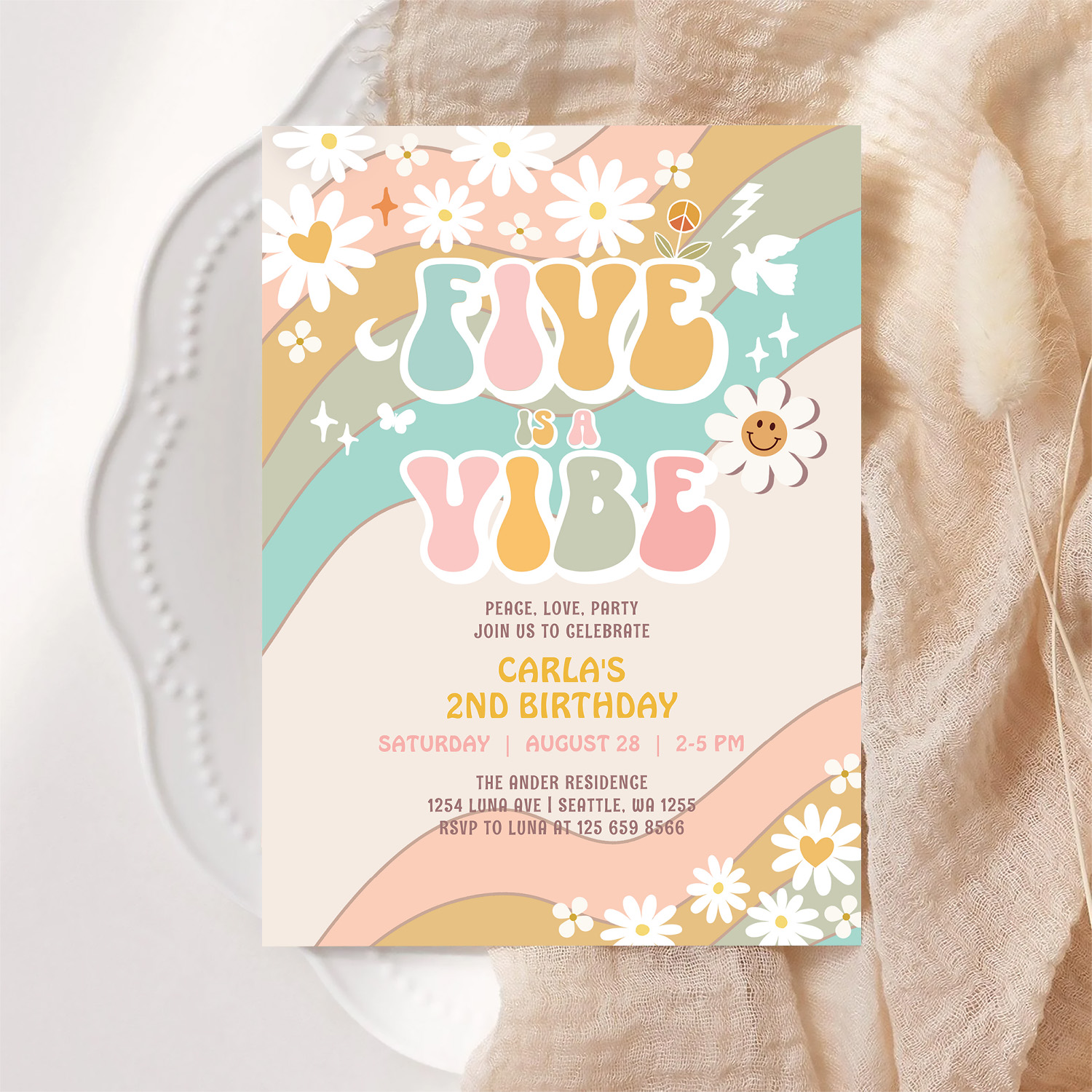 Five Is A Vibe Daisy Hippie Groovy Retro Birthday Invitation