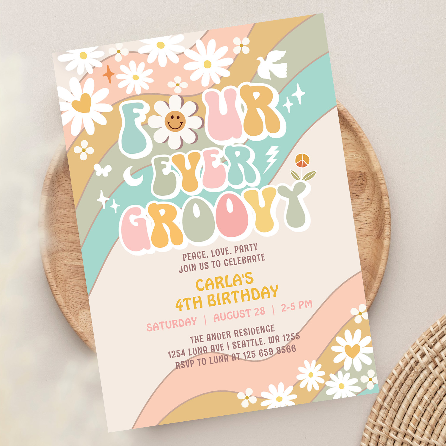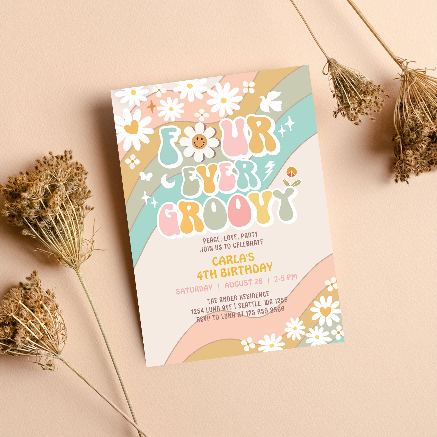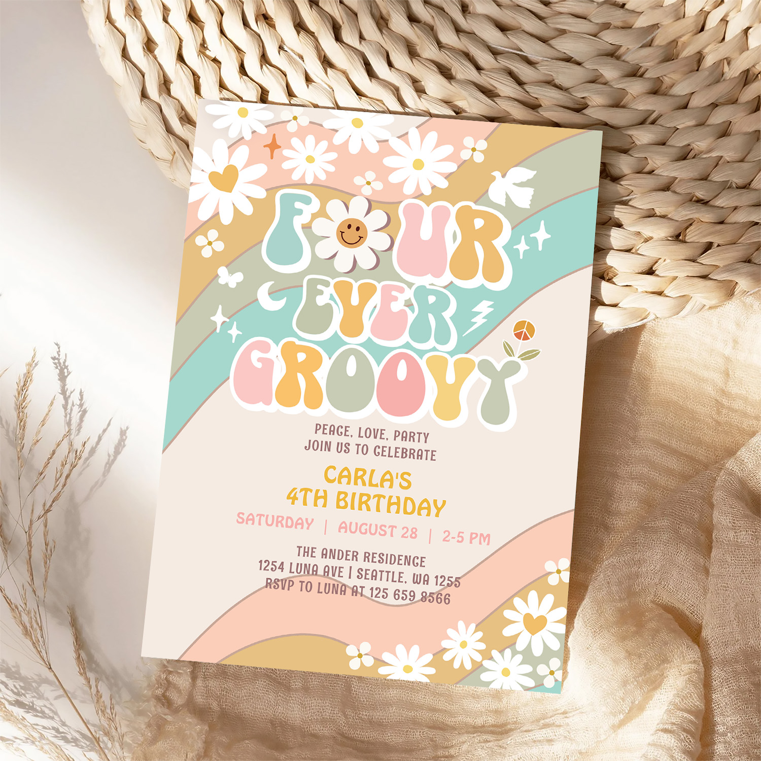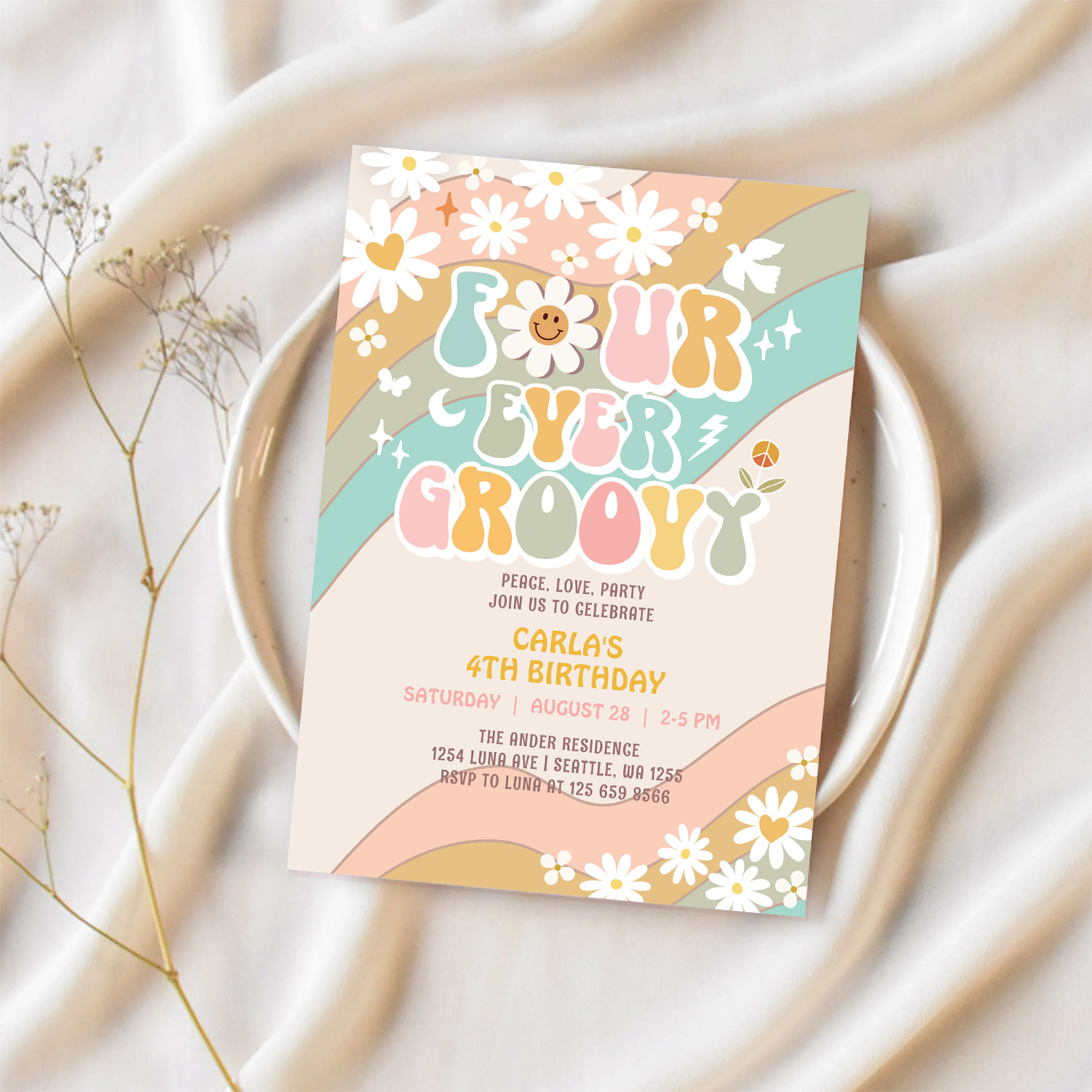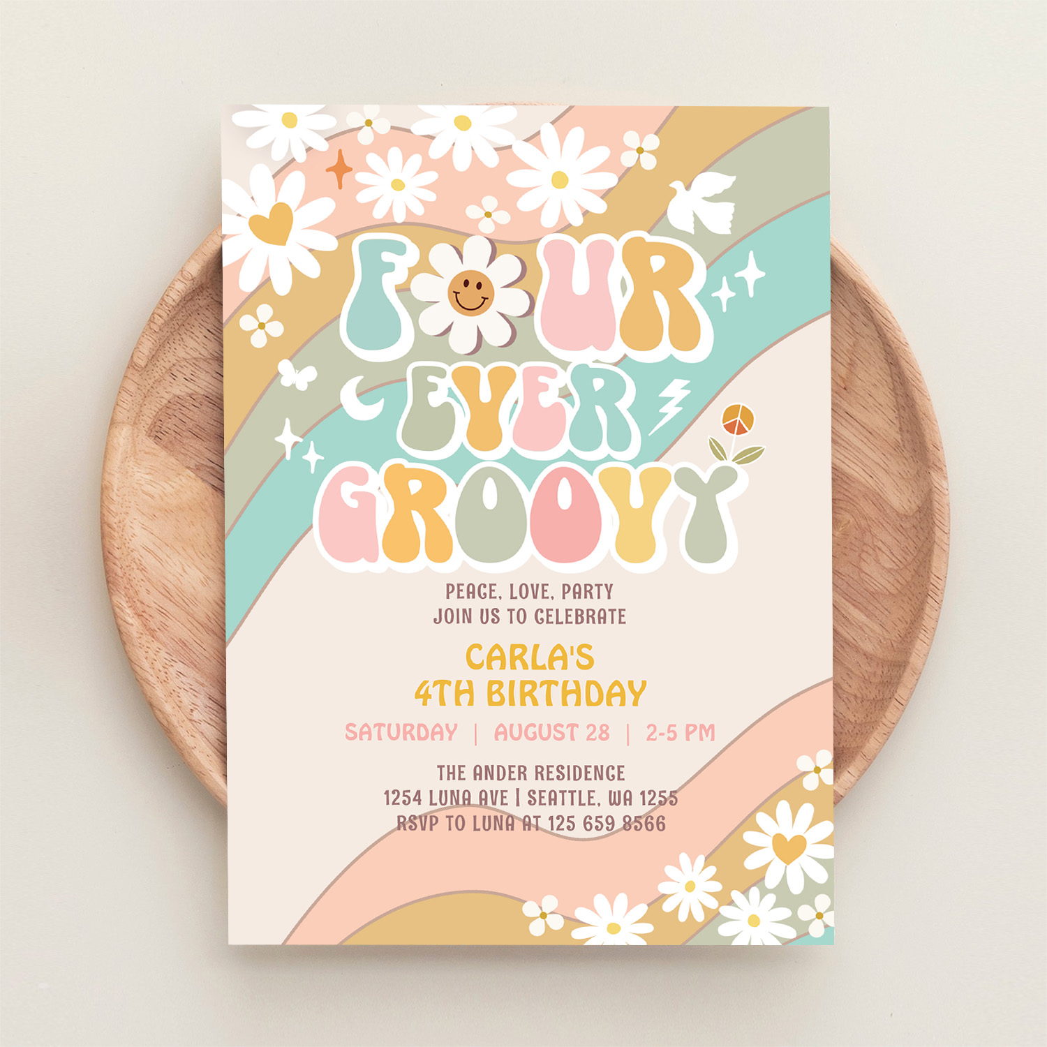 Four Ever Groovy Daisy Hippie 70S Retro Birthday Invitation