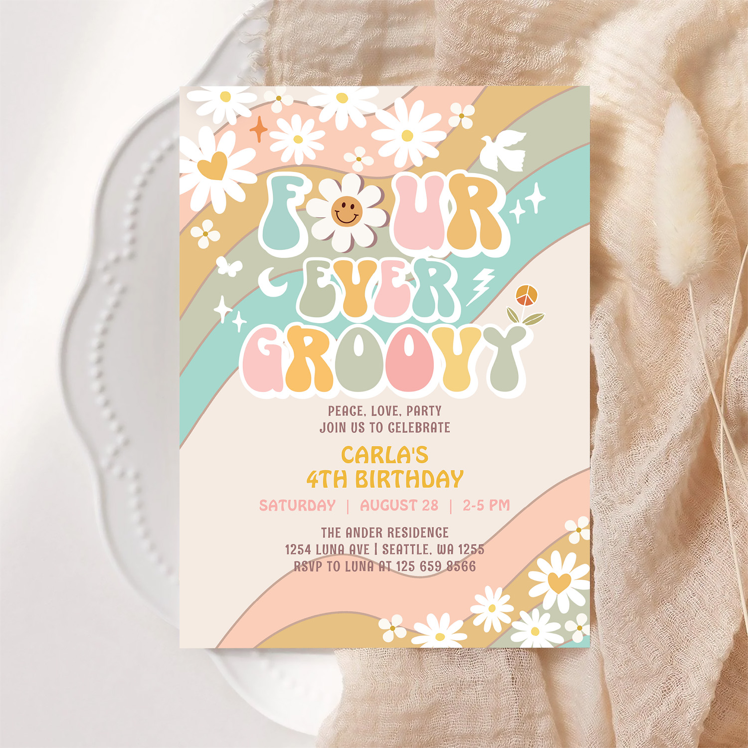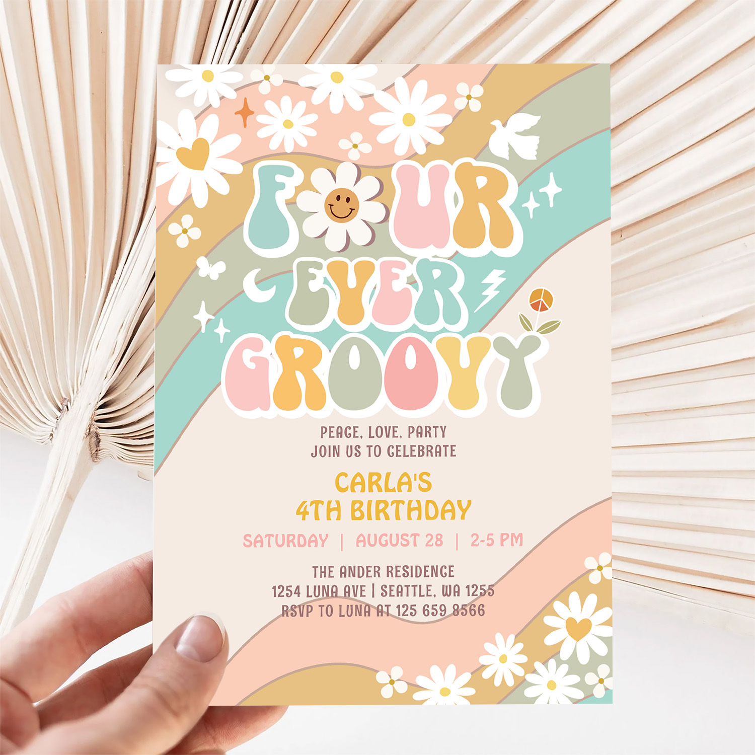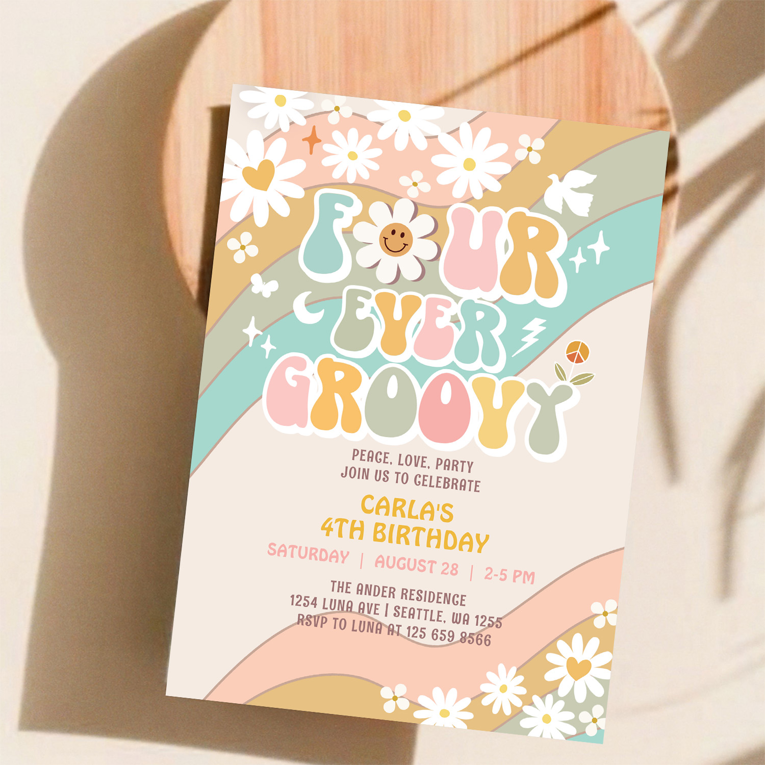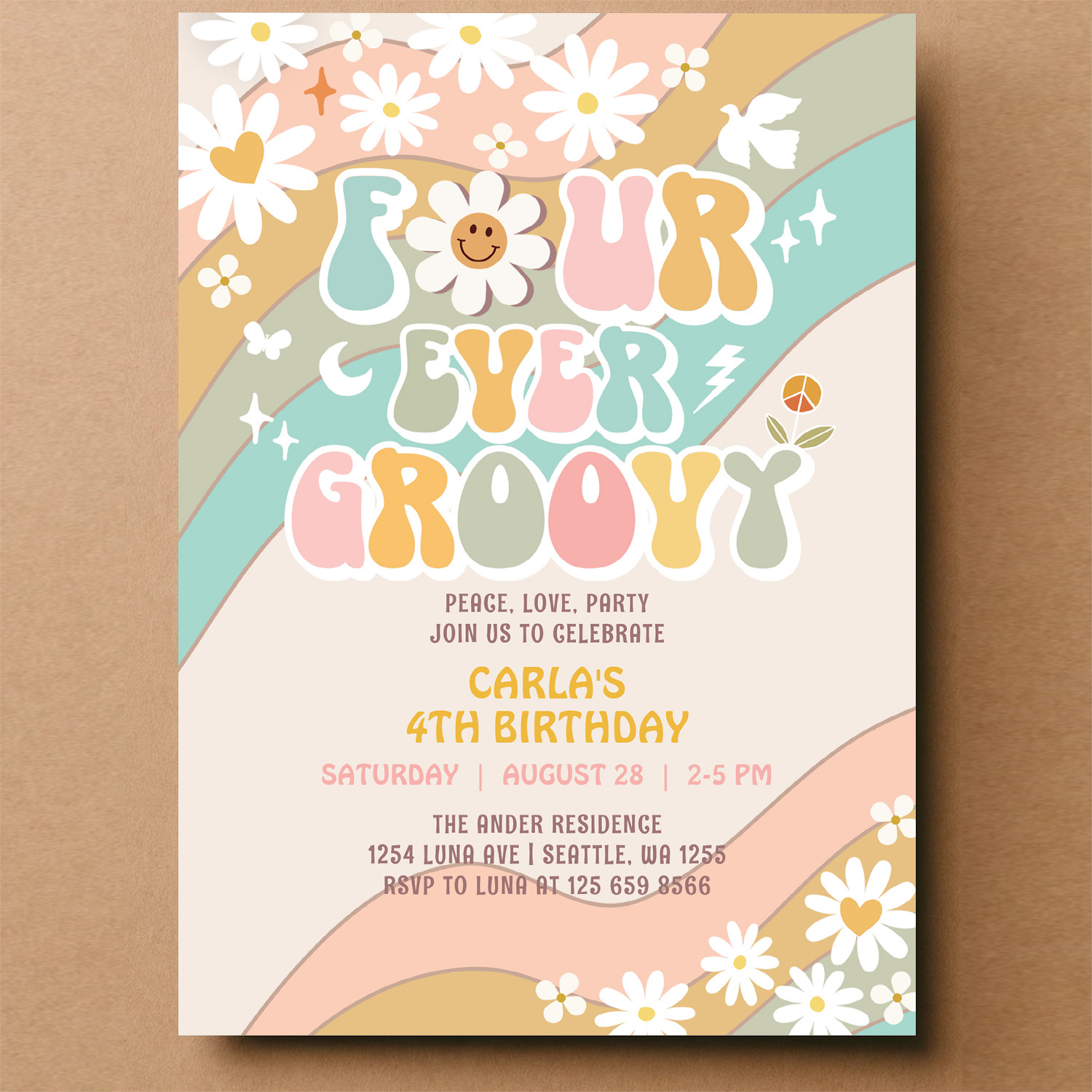 Four Ever Groovy Daisy Hippie 70S Retro Birthday Invitation