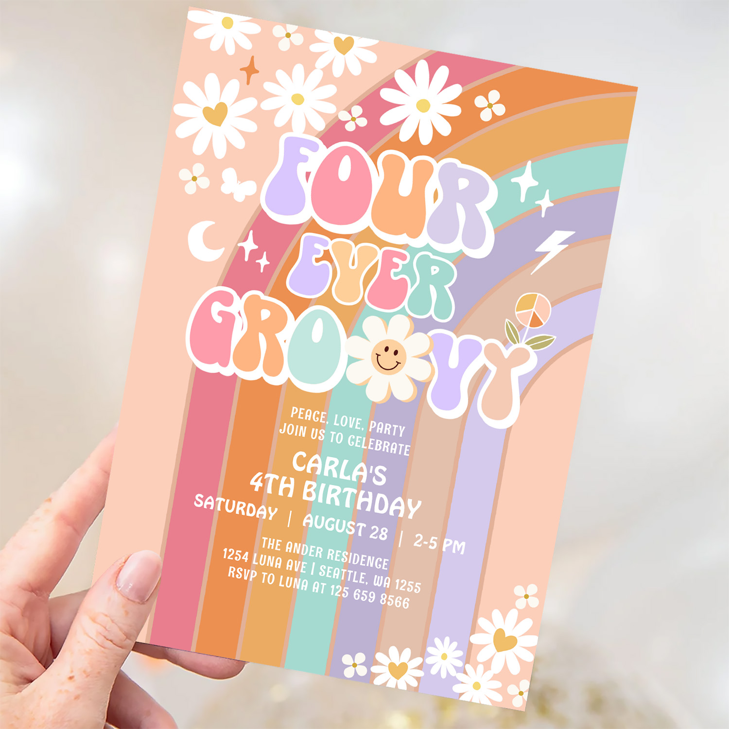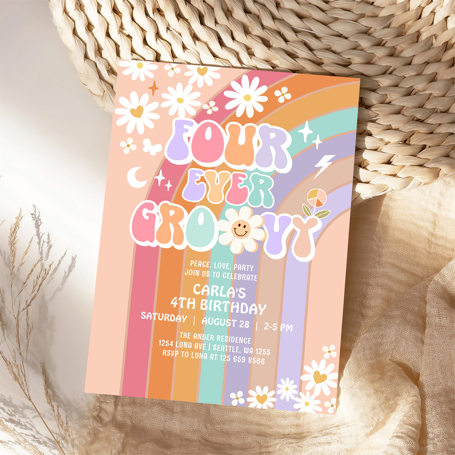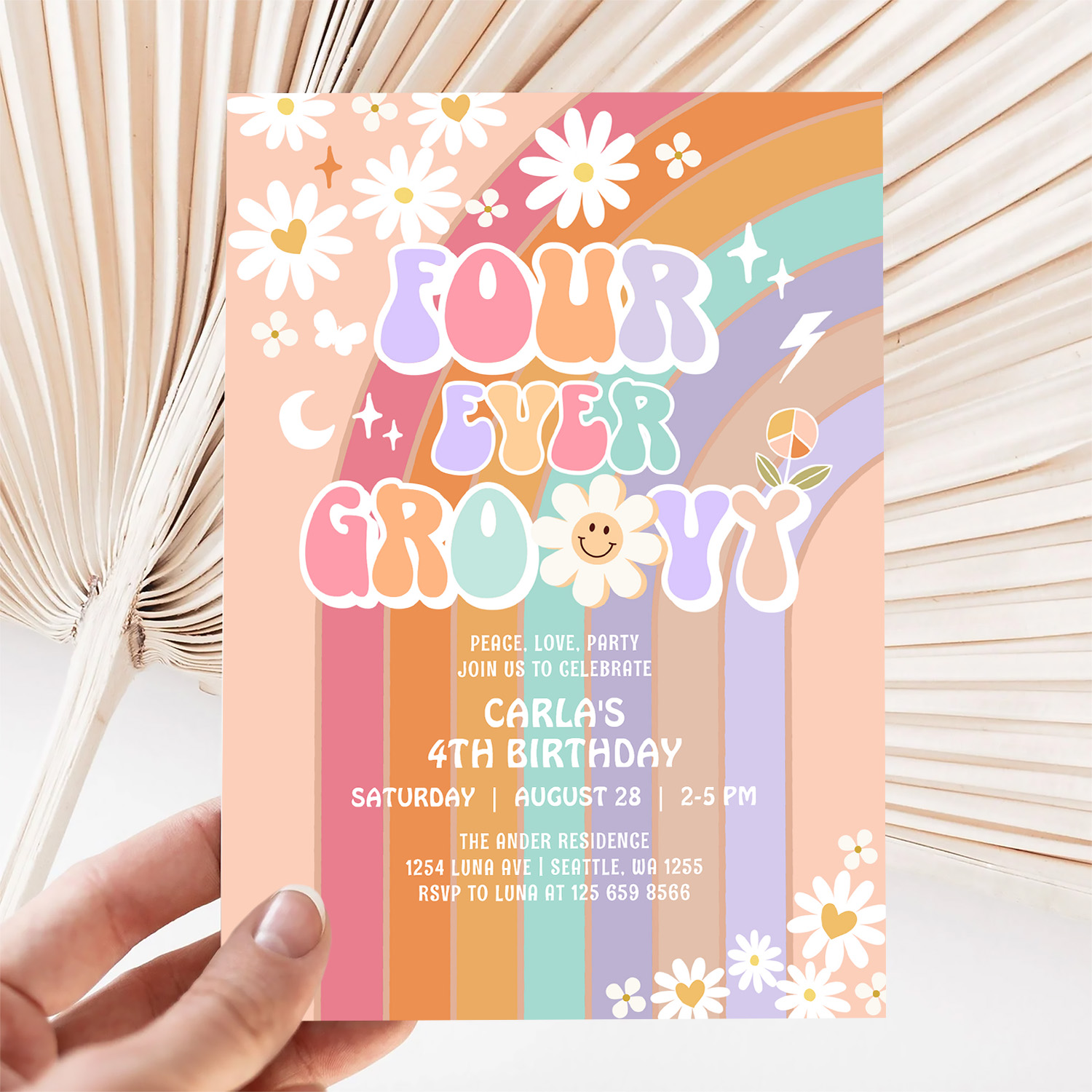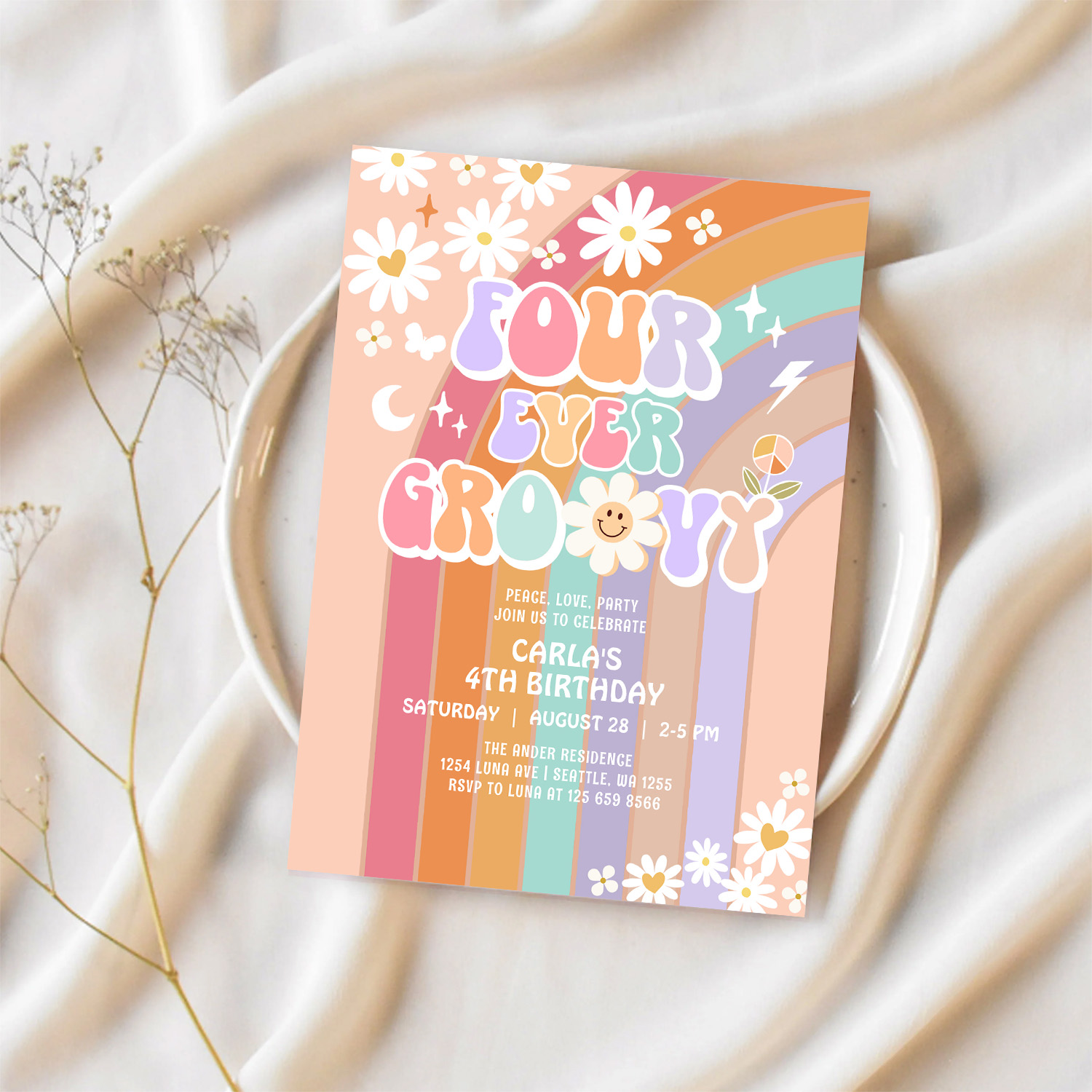 Four Ever Groovy Daisy Rainbow Groovy 4th Birthday Invitation
