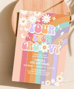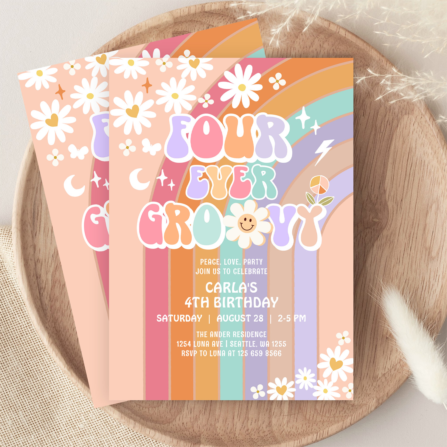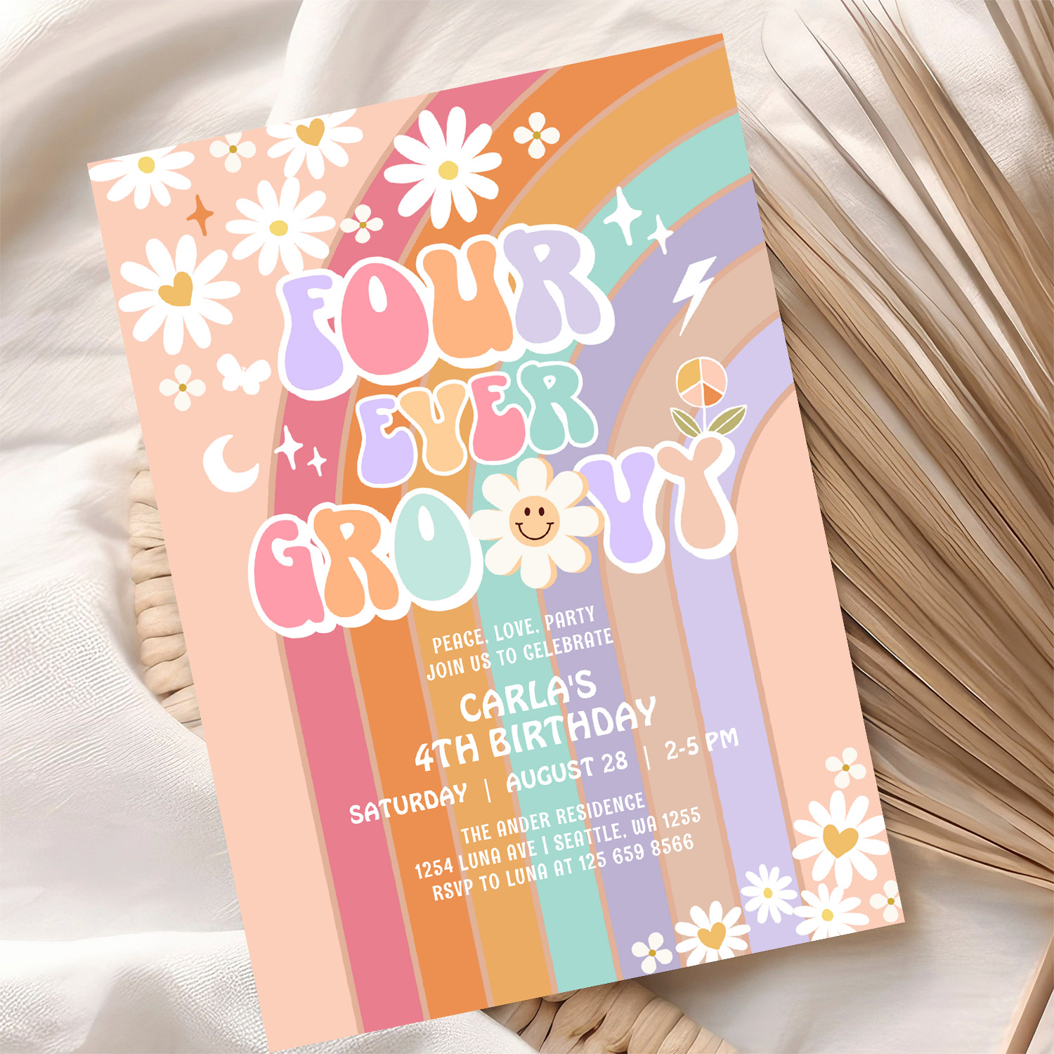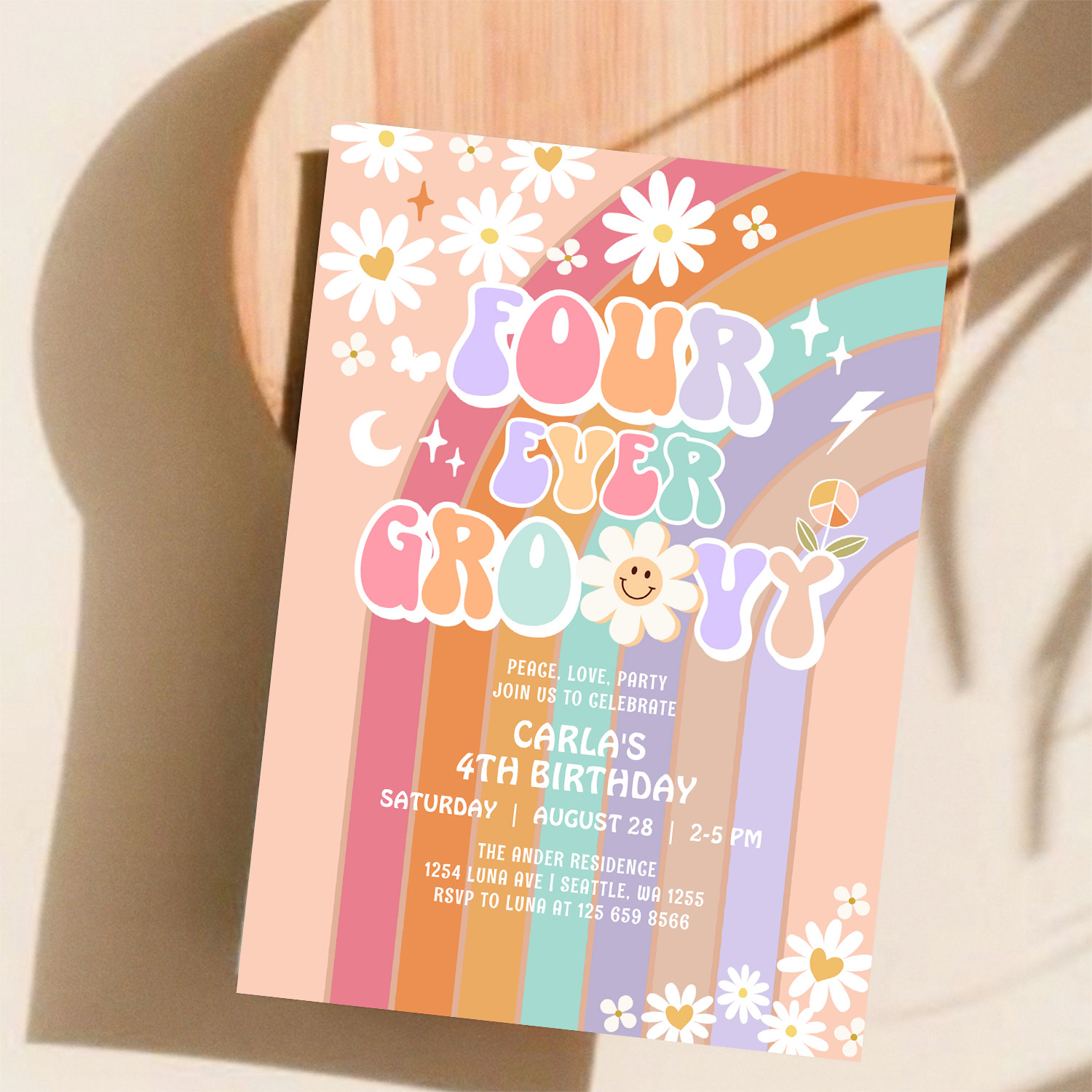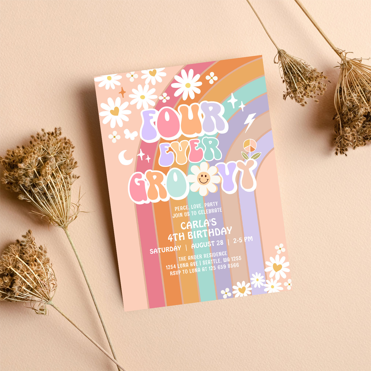Four Ever Groovy Daisy Rainbow Groovy 4th Birthday Invitation
