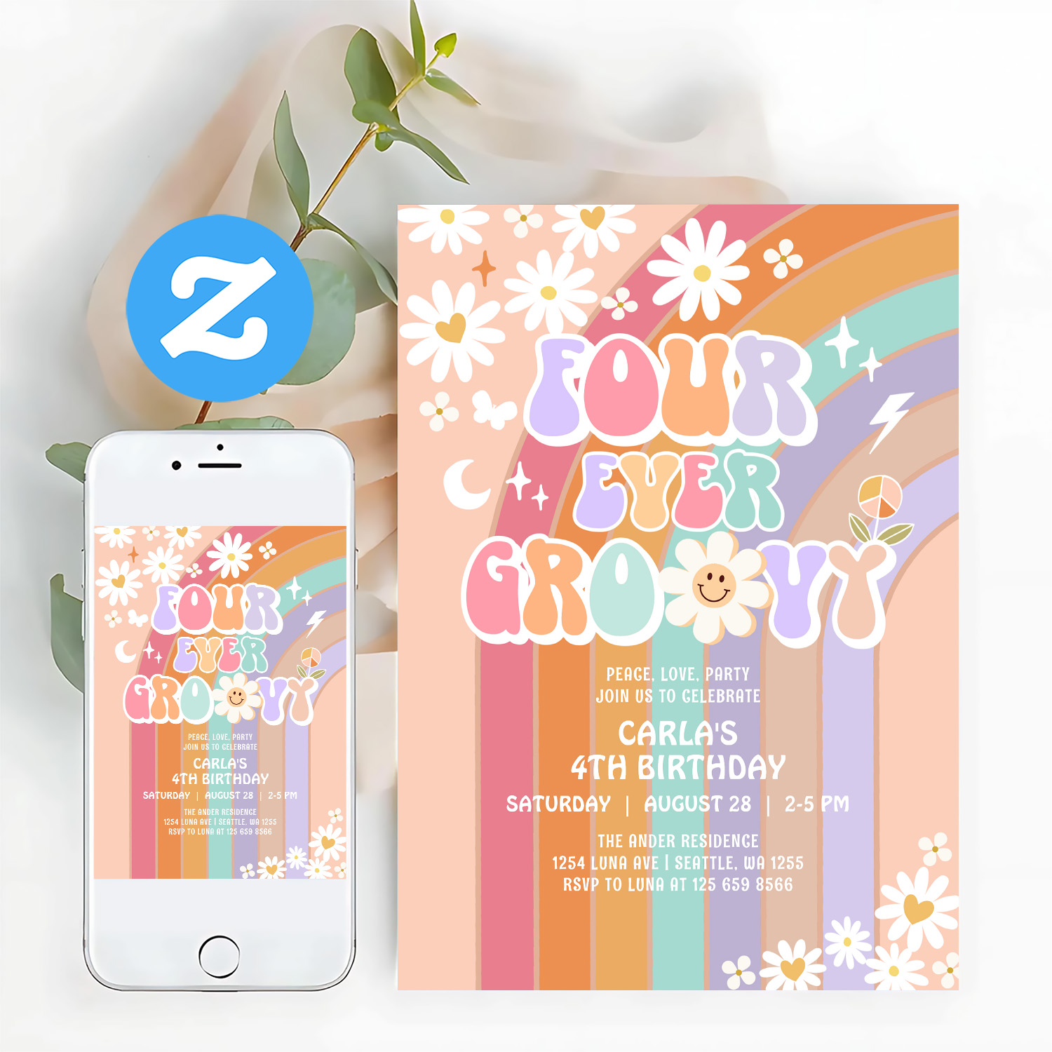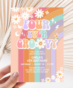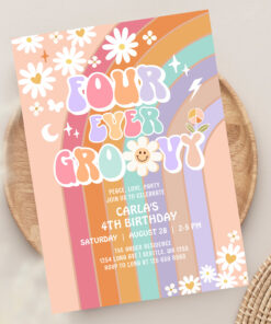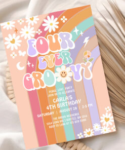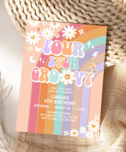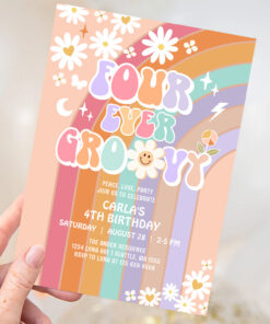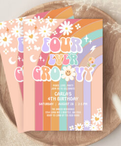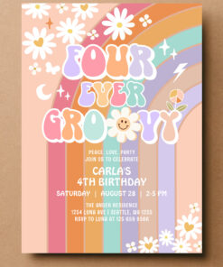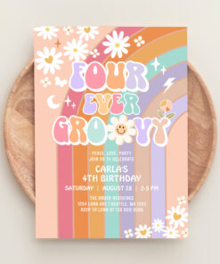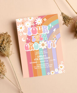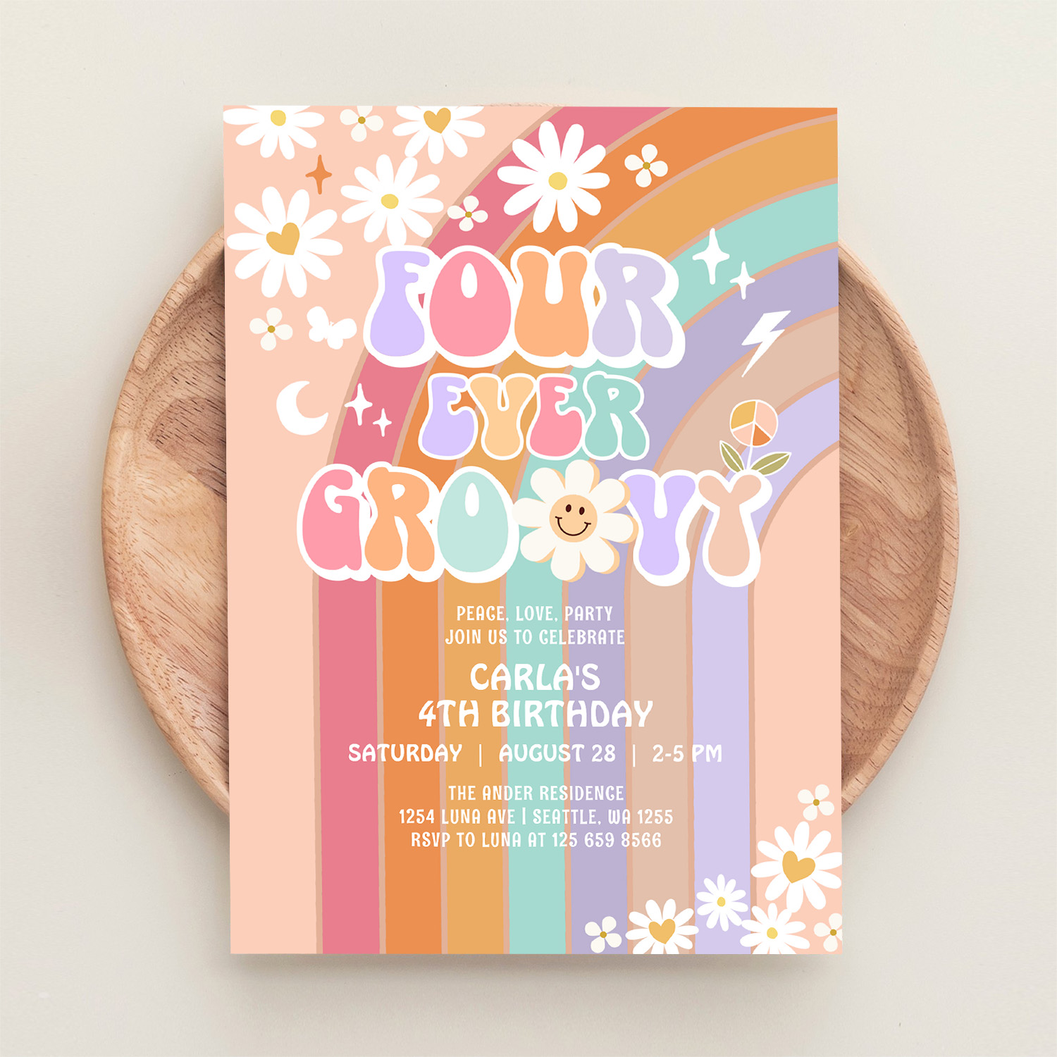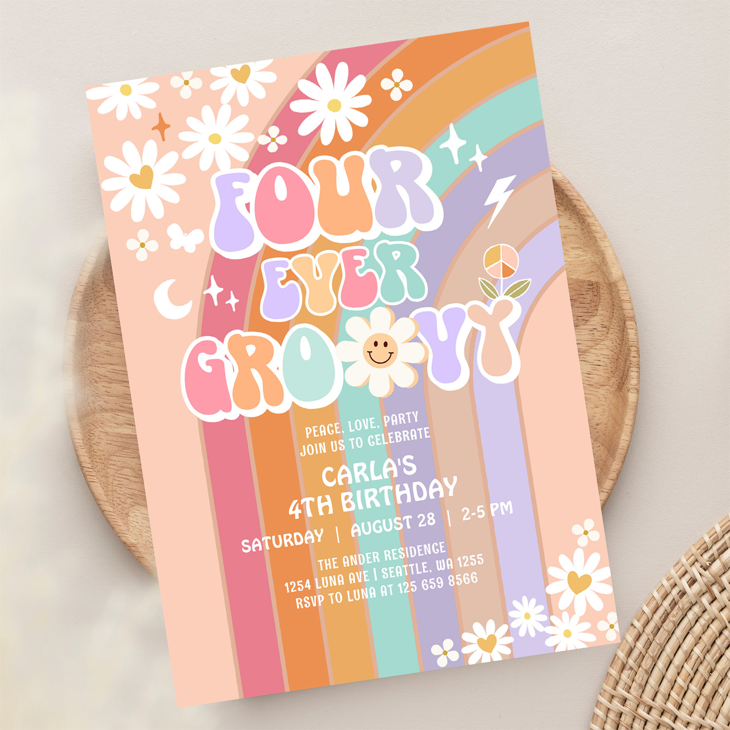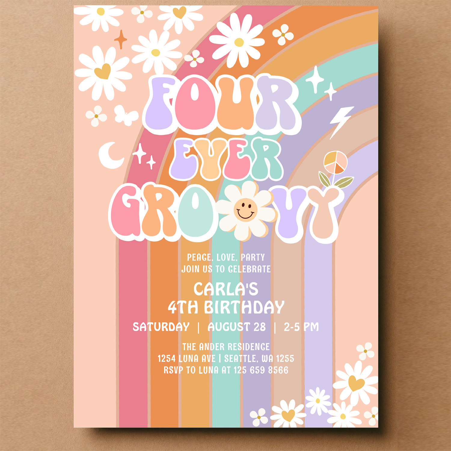 Four Ever Groovy Daisy Rainbow Groovy 4th Birthday Invitation
