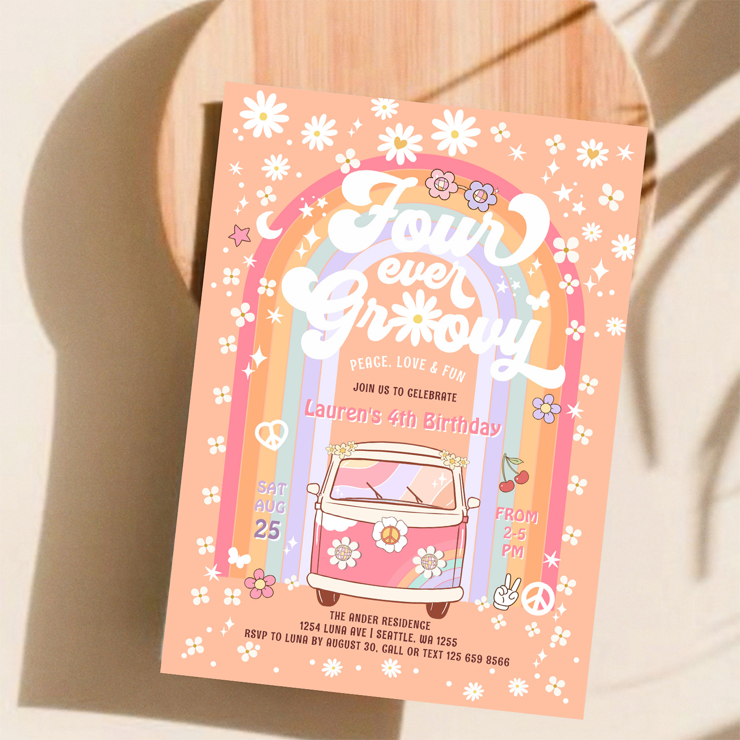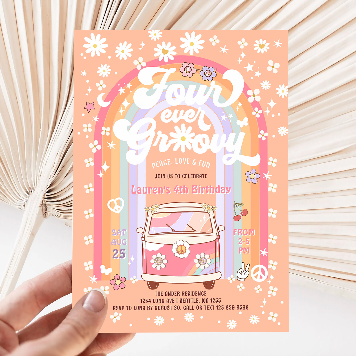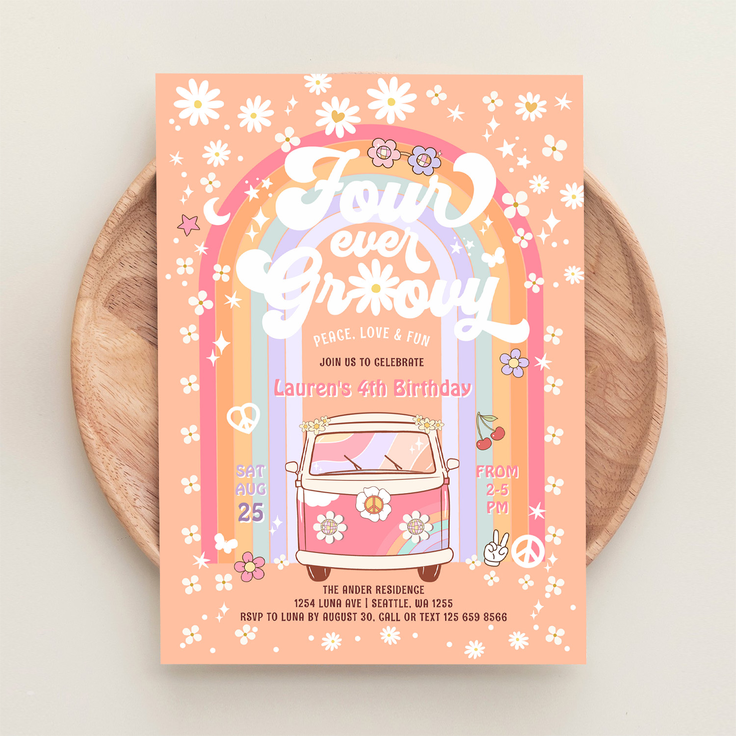 Four Ever Groovy Daisy Van 4th Birthday Invitation