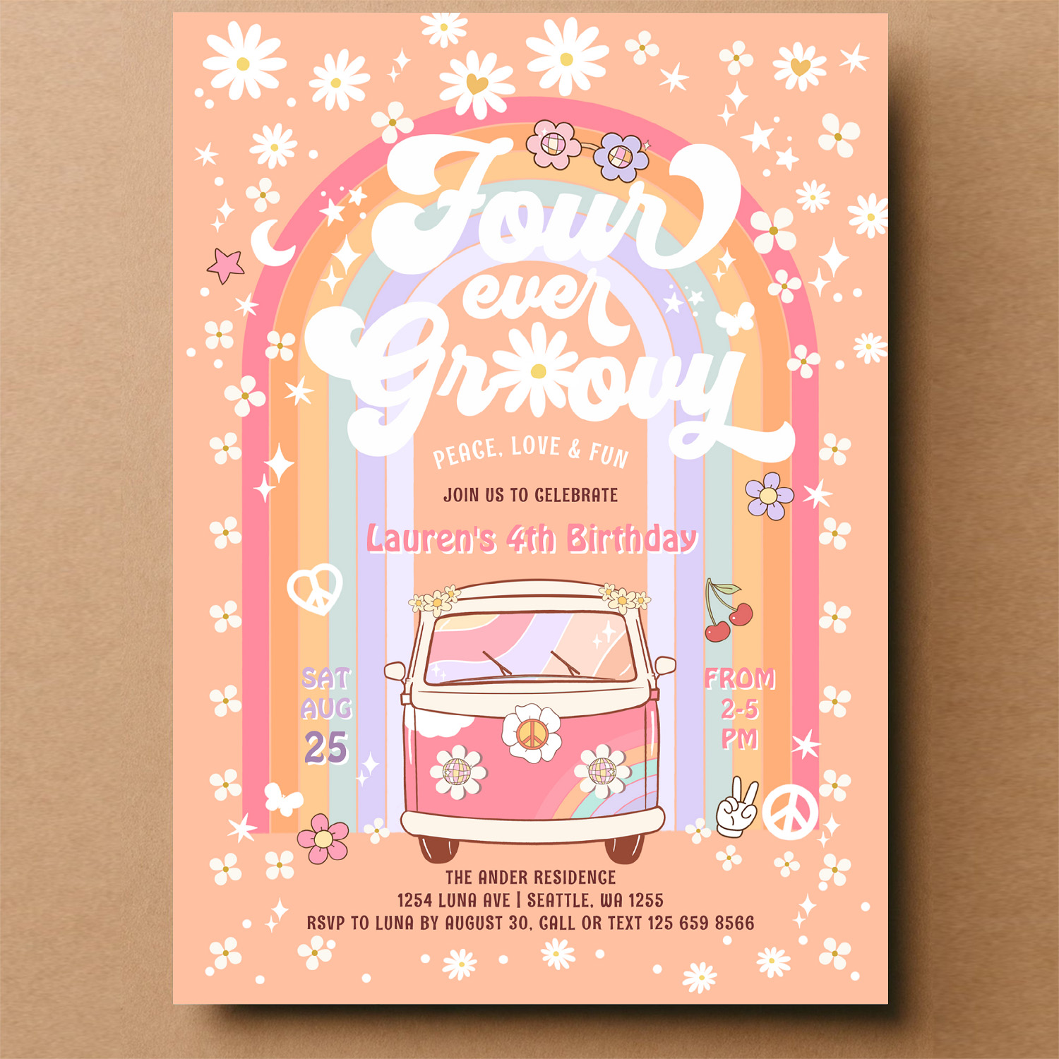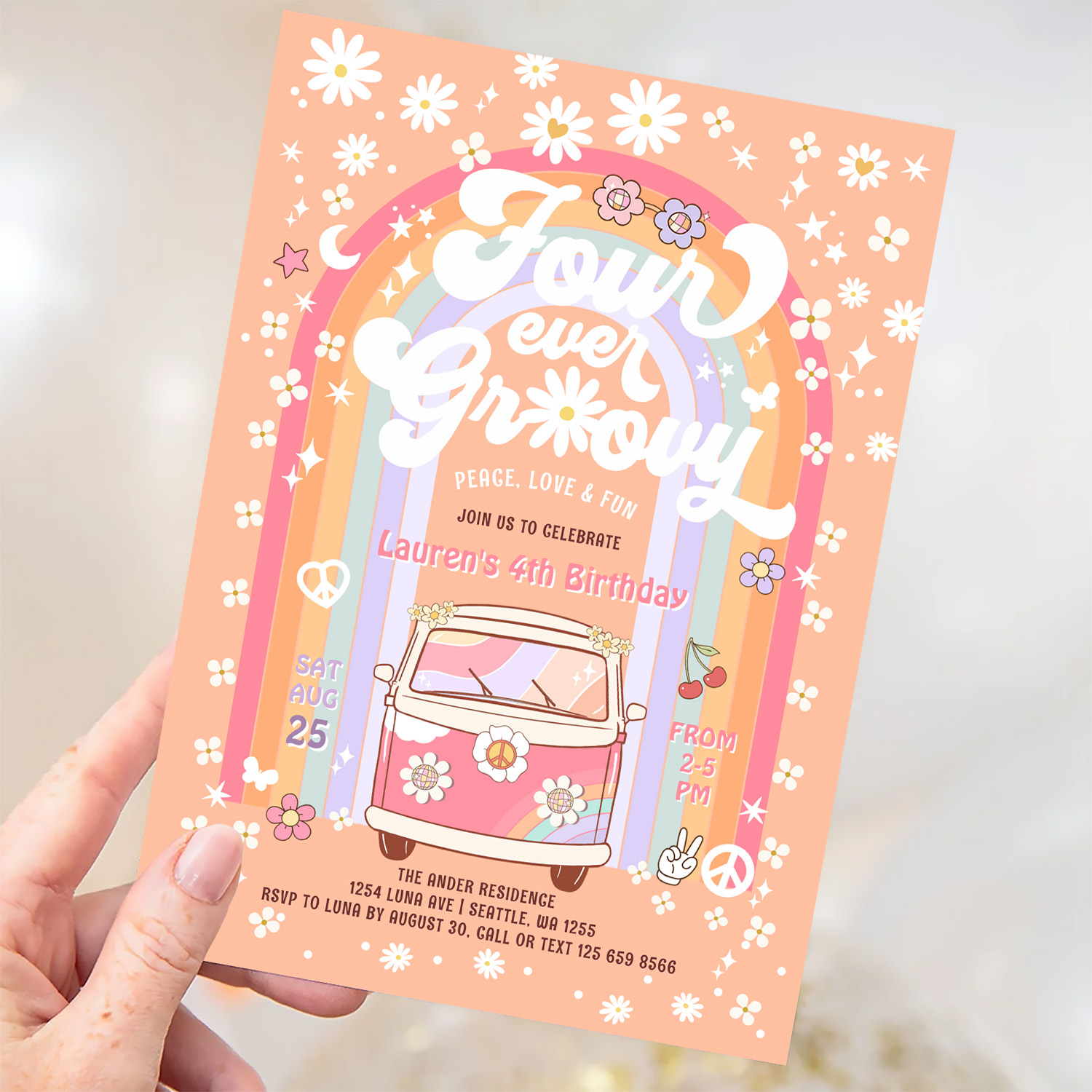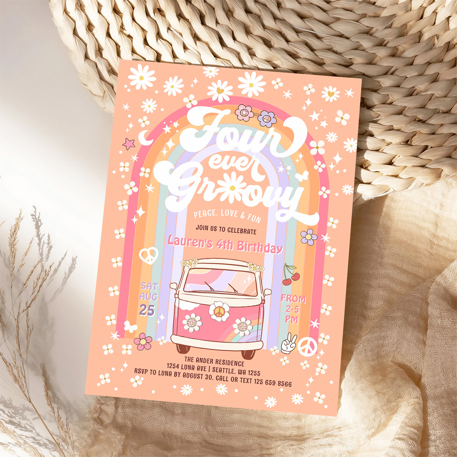 Four Ever Groovy Daisy Van 4th Birthday Invitation
