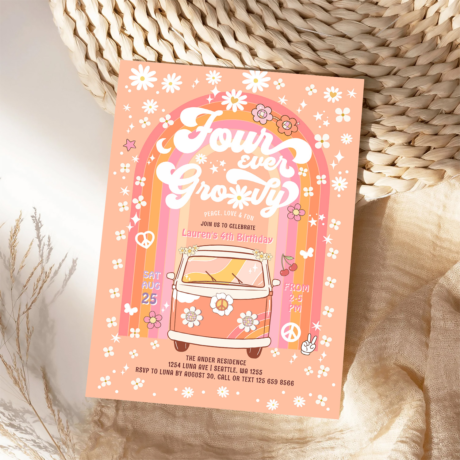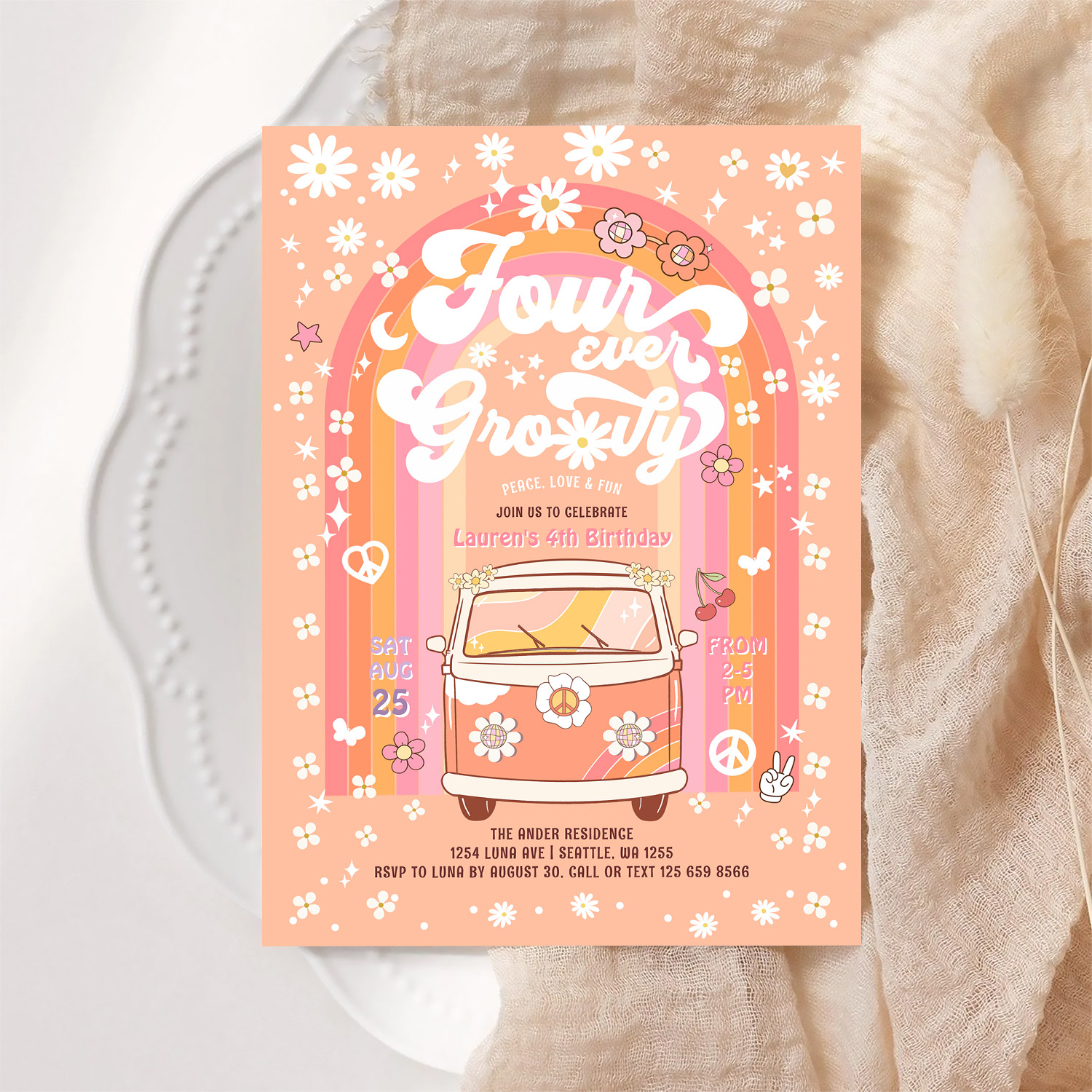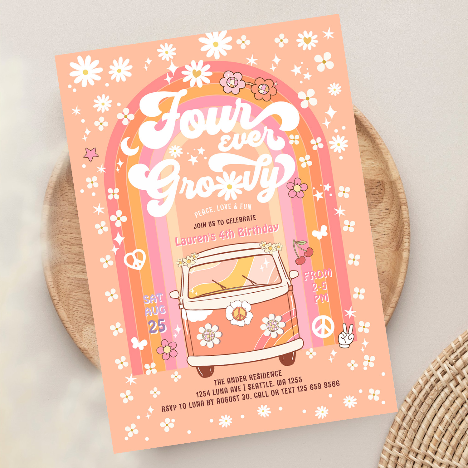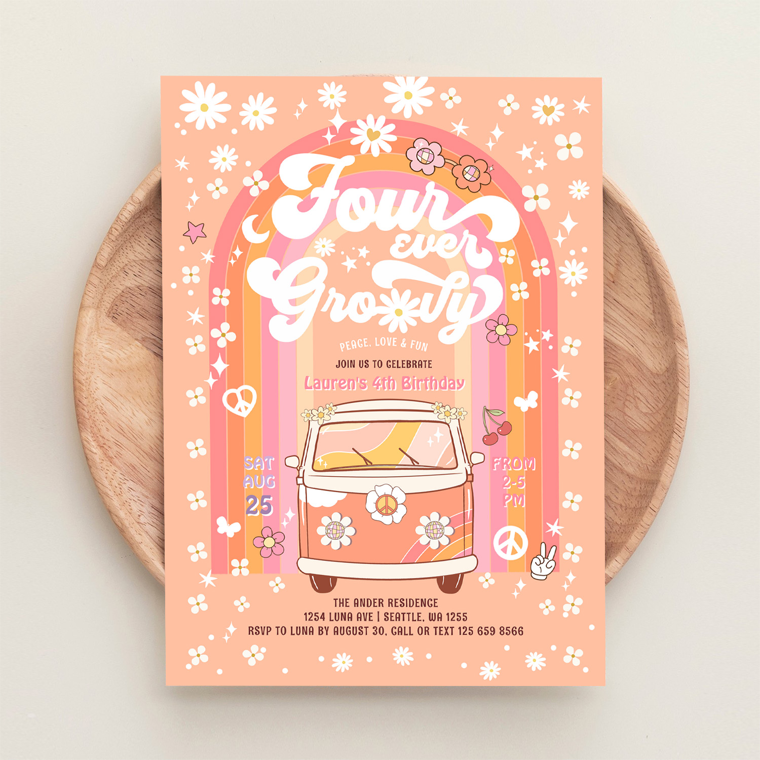 Four Ever Groovyvan Bus 4th Birthday Invitation