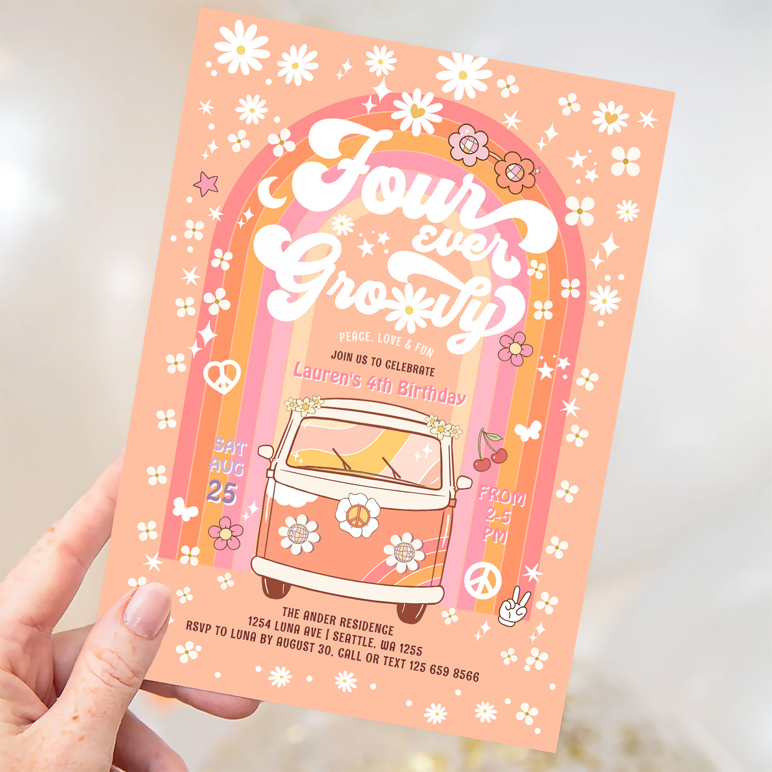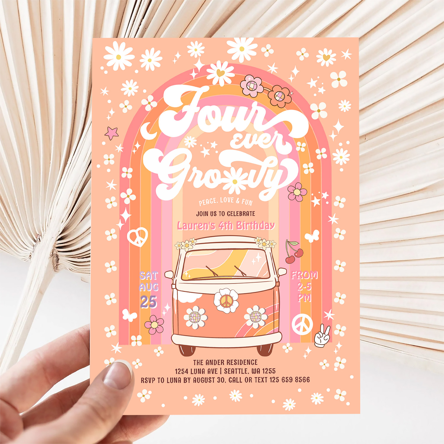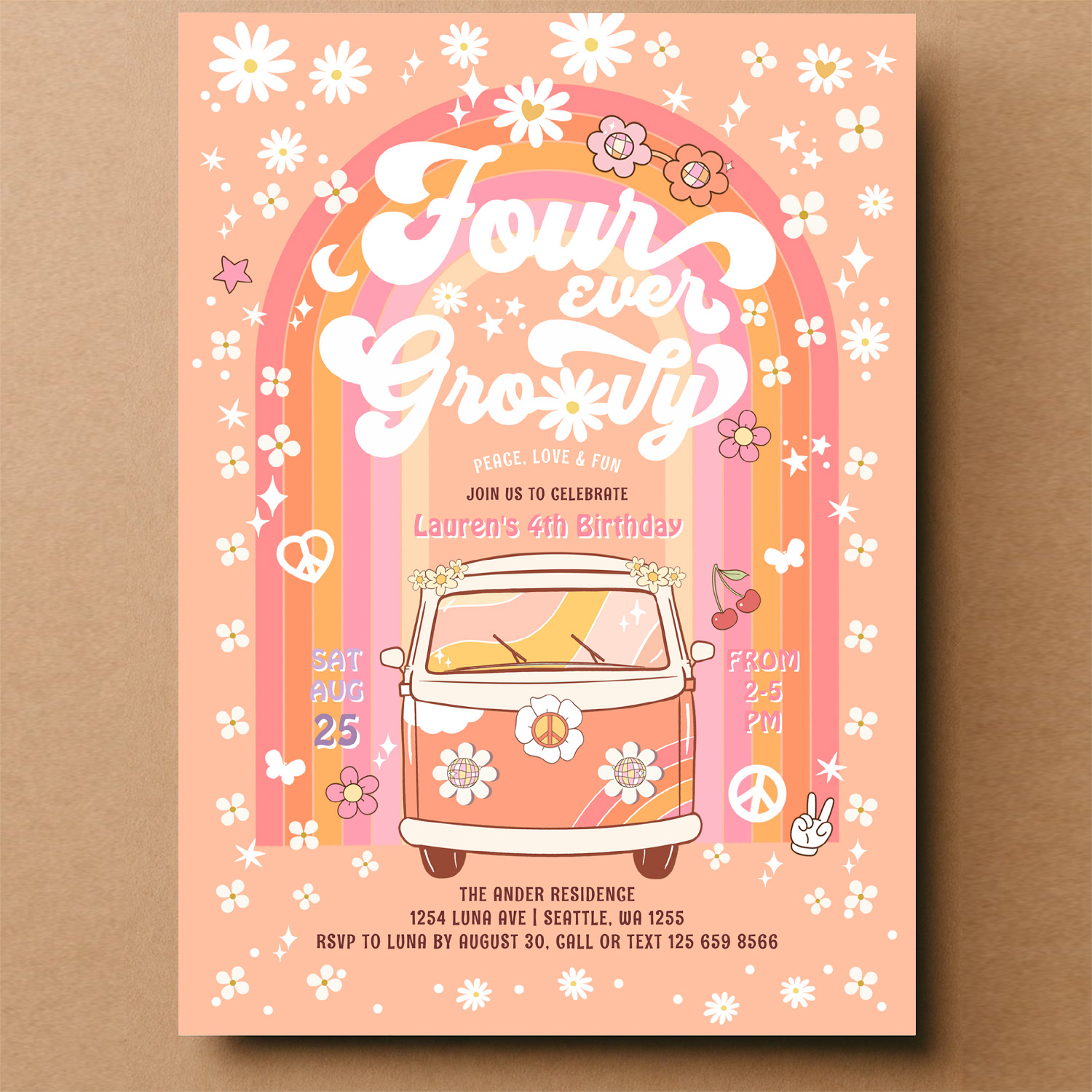 Four Ever Groovyvan Bus 4th Birthday Invitation