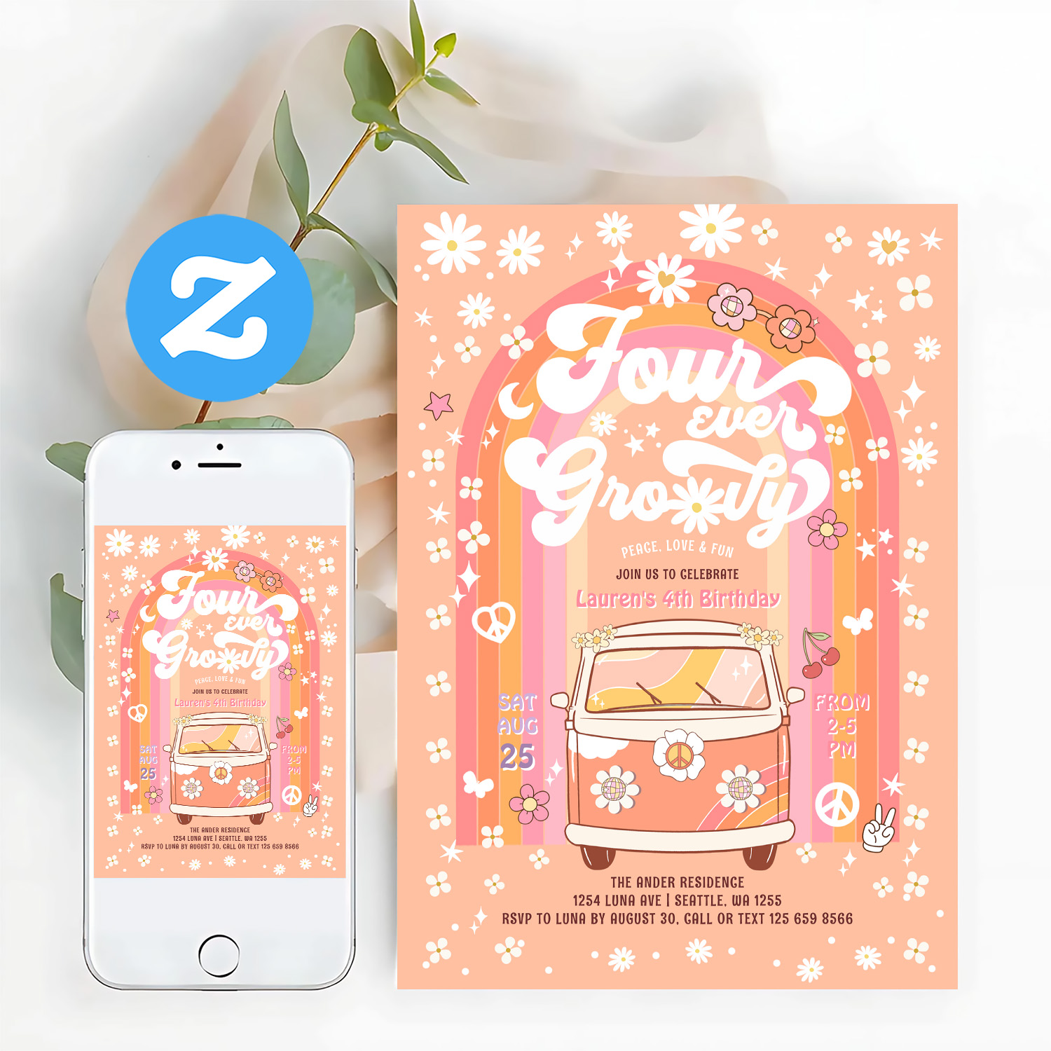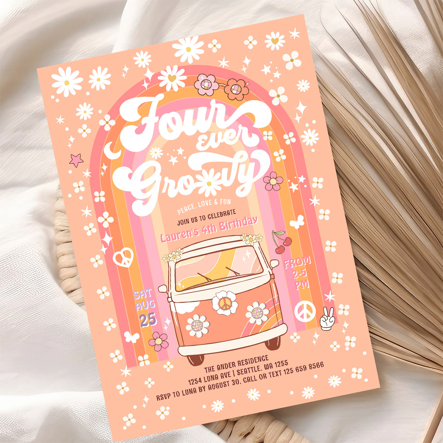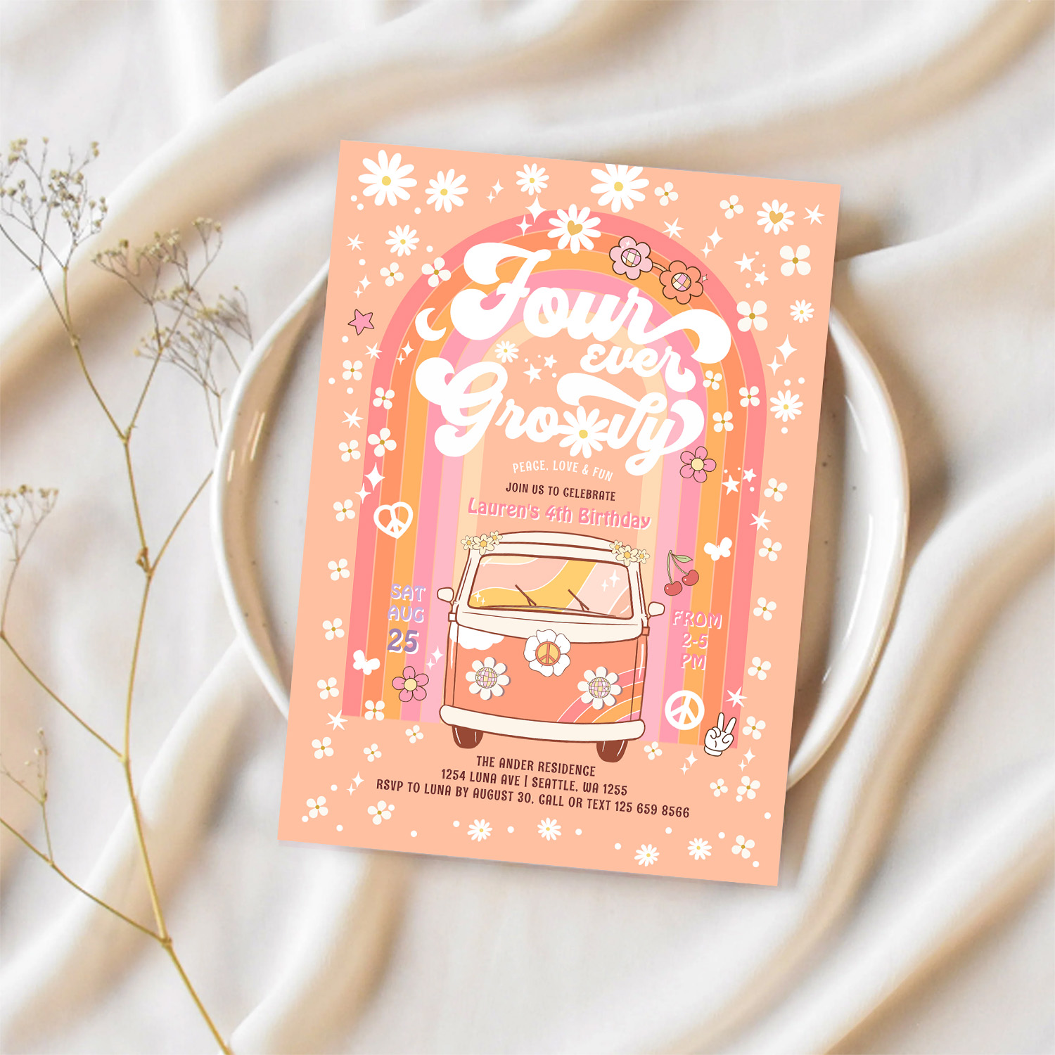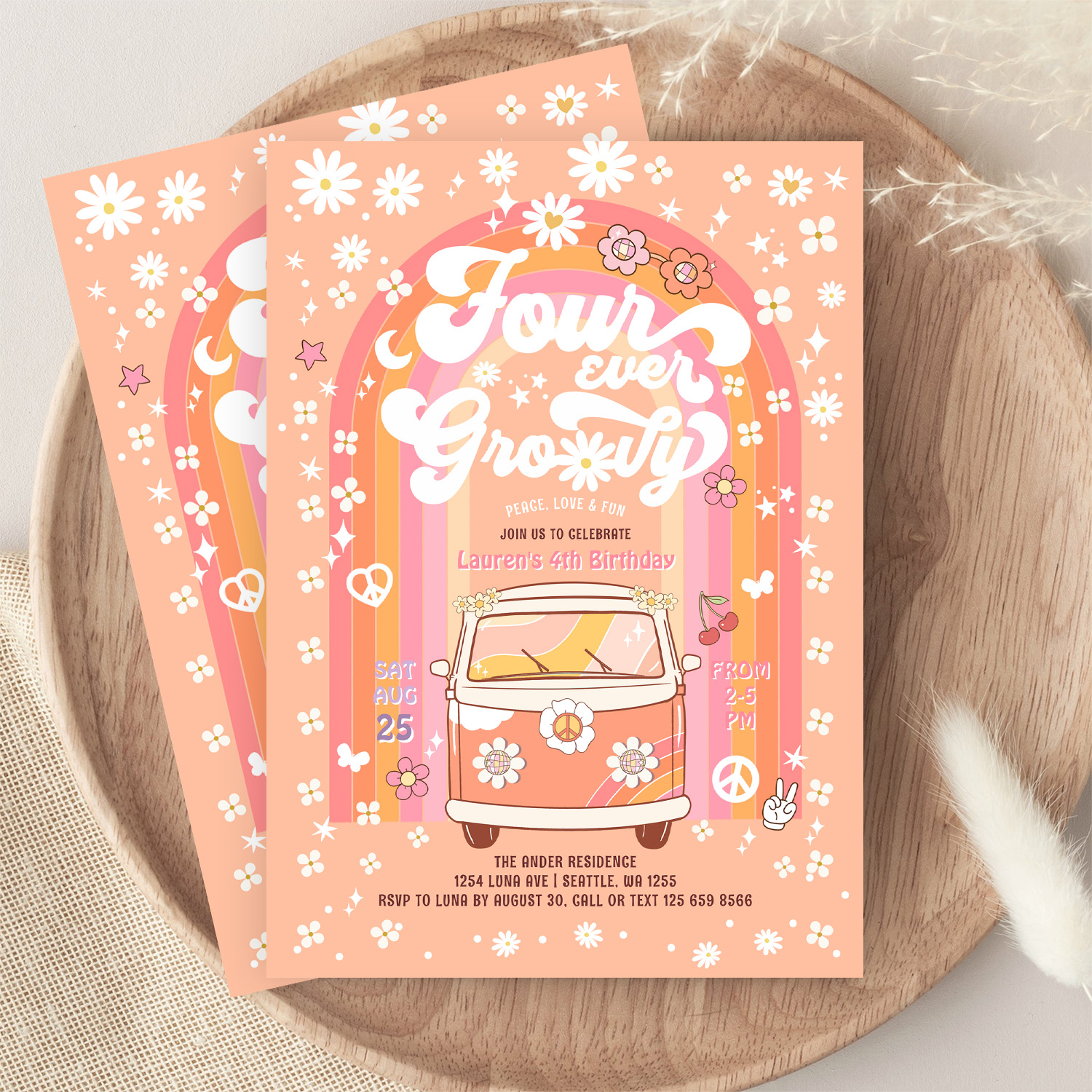 Four Ever Groovyvan Bus 4th Birthday Invitation