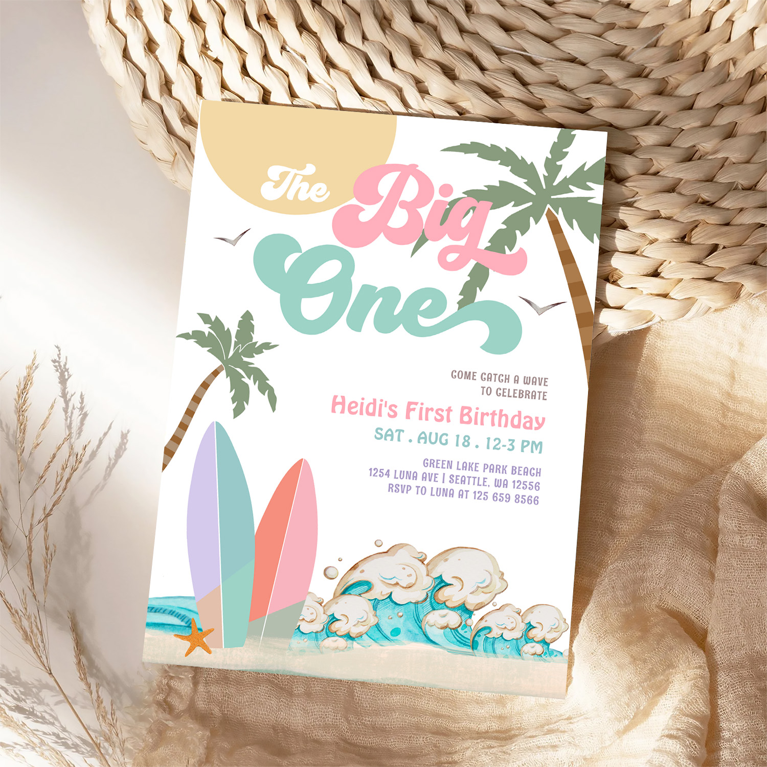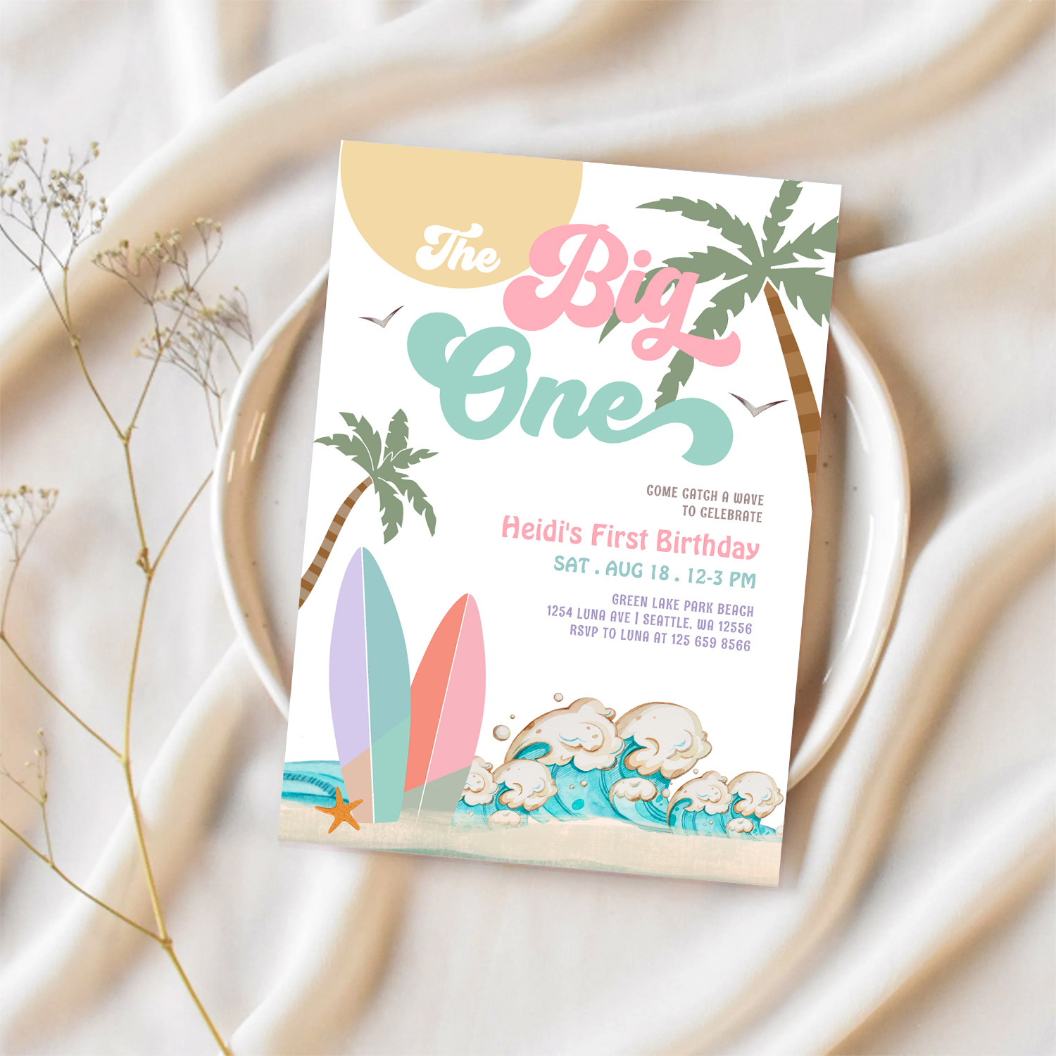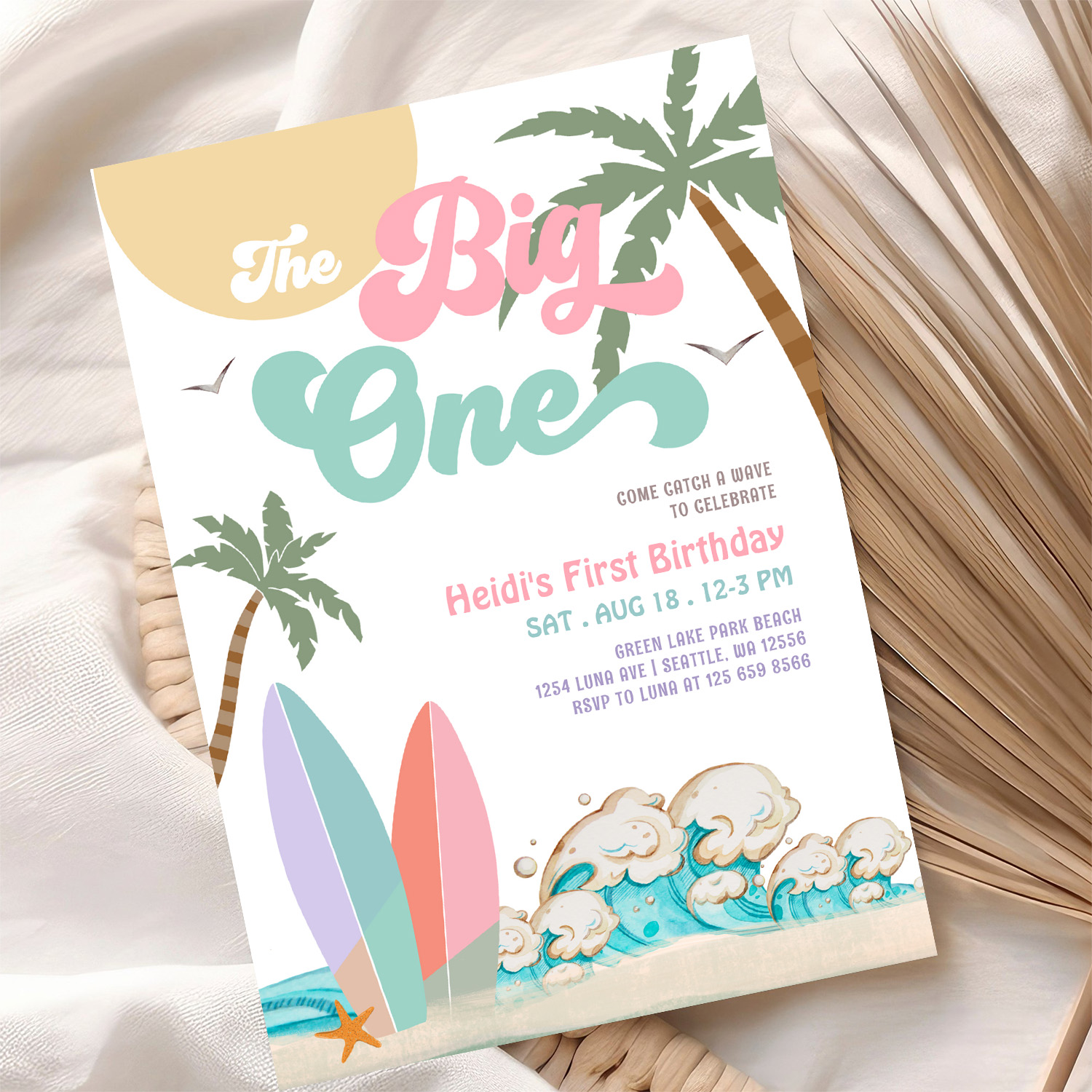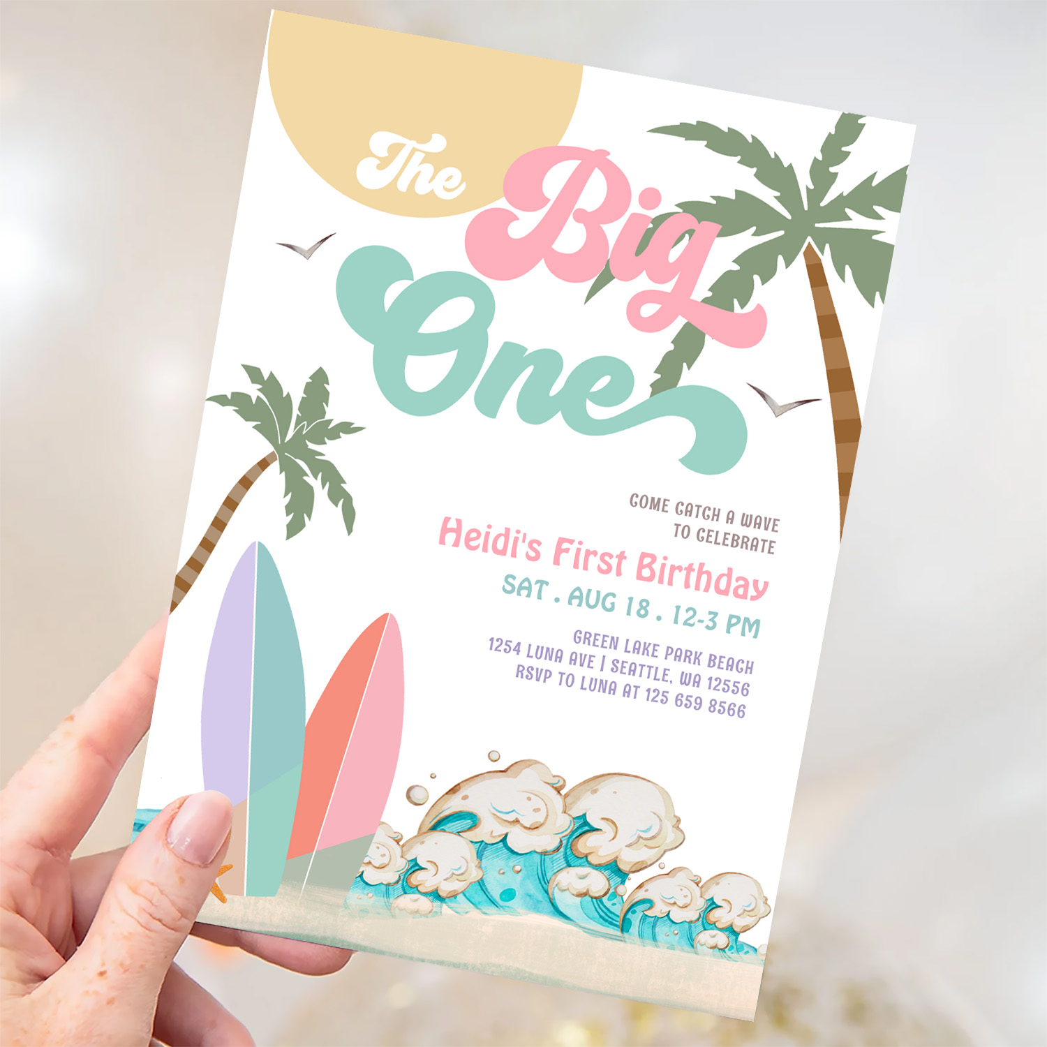Girl The Big One Surfing 1st Birthday Party Invitation