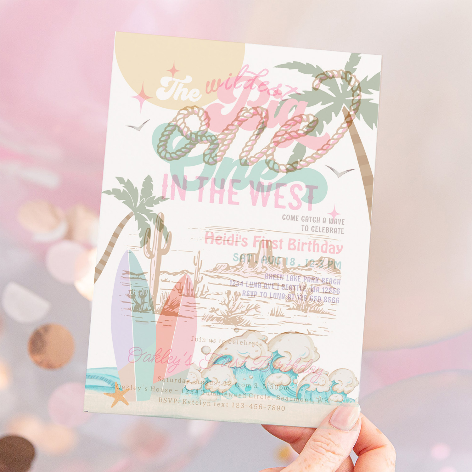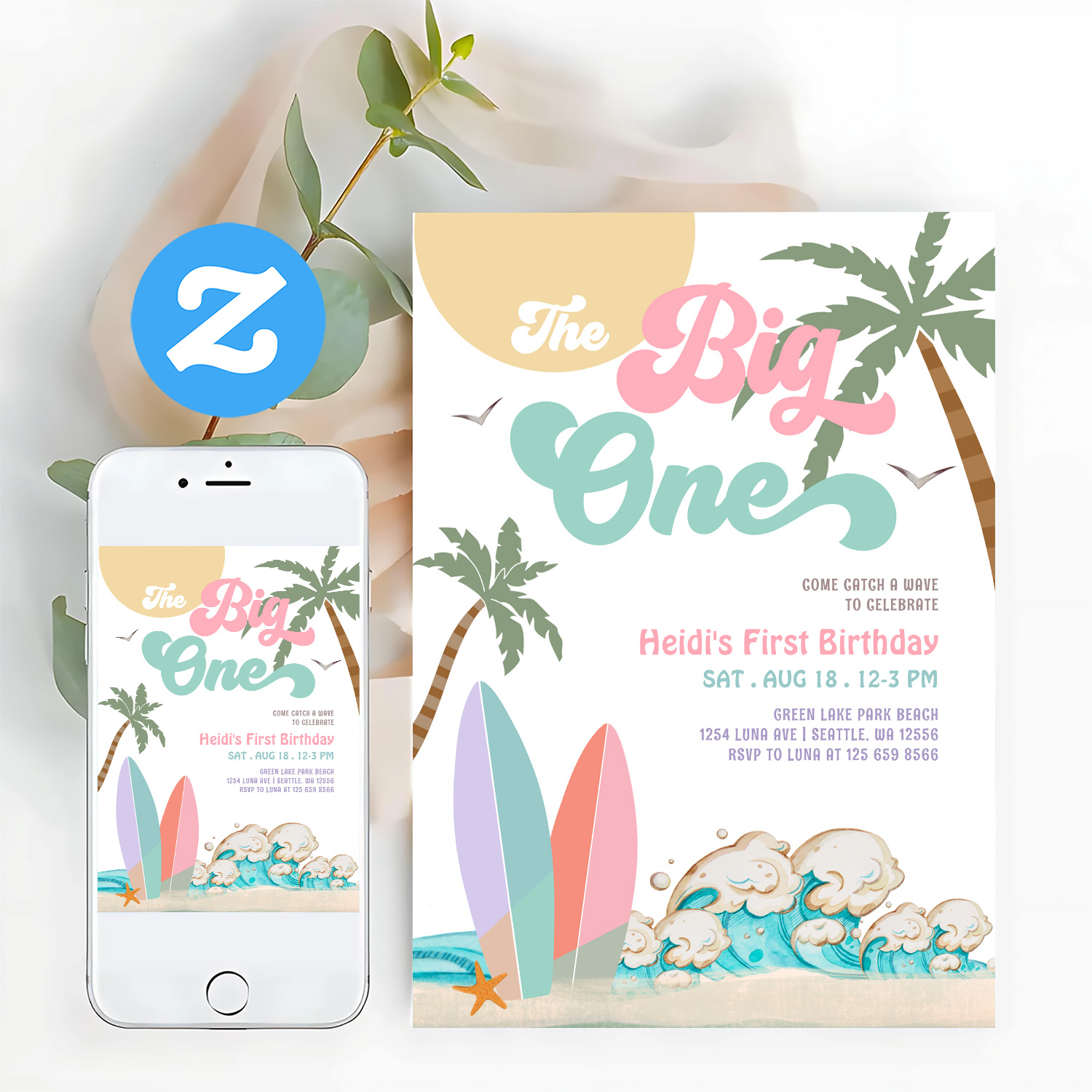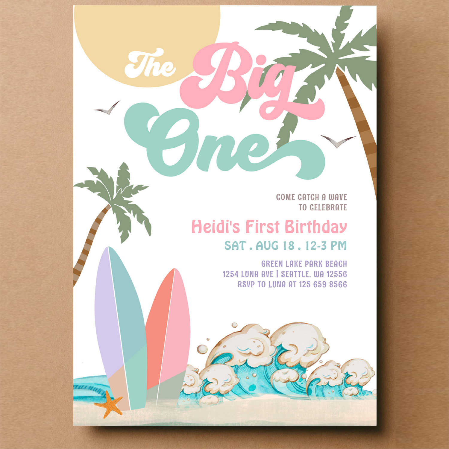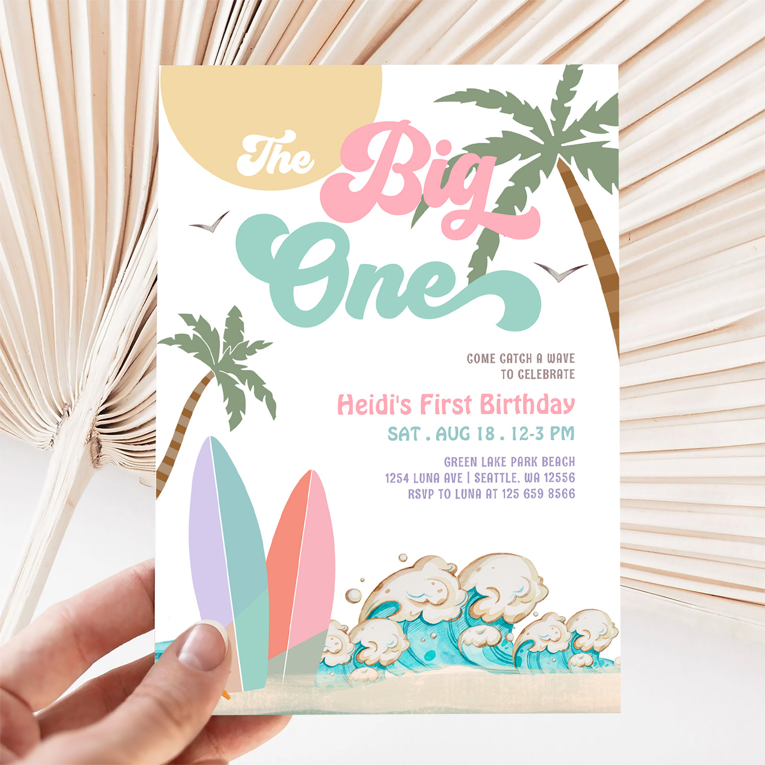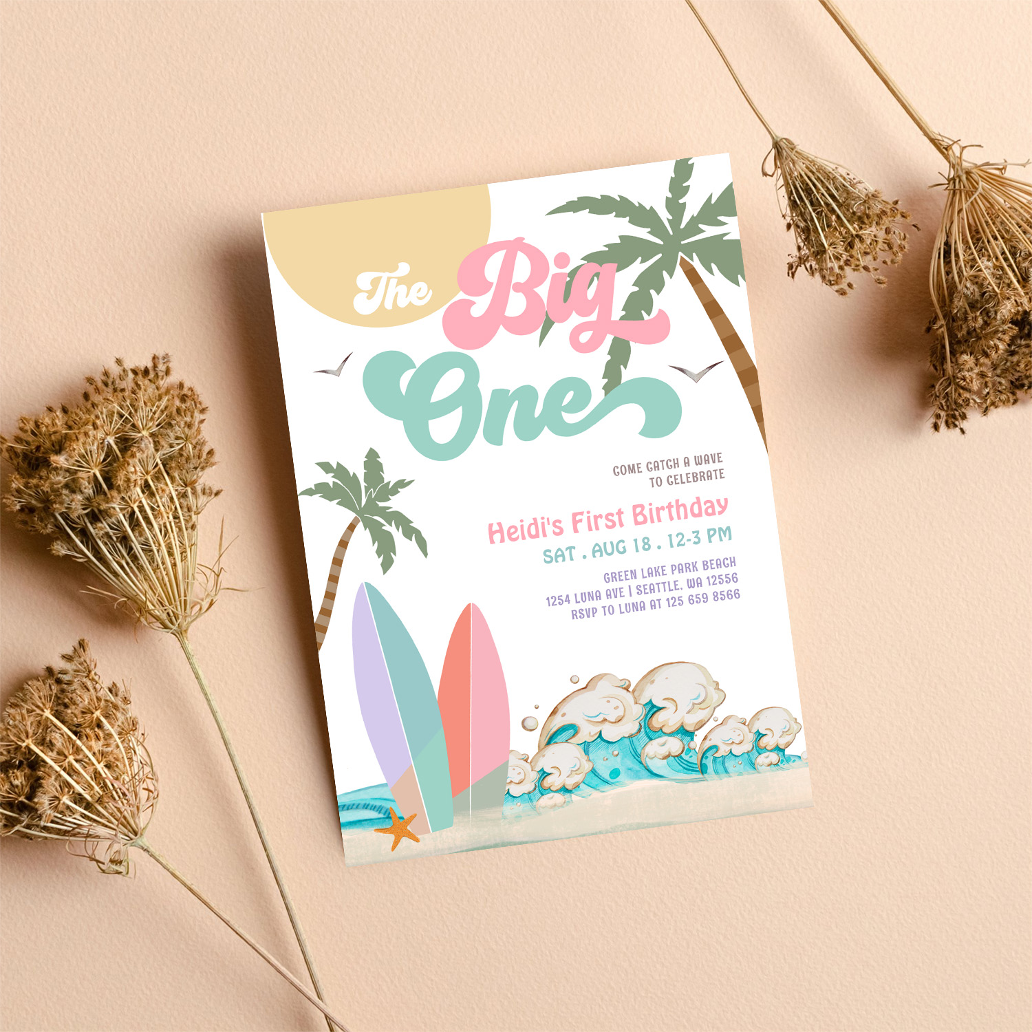 Girl The Big One Surfing 1st Birthday Party Invitation