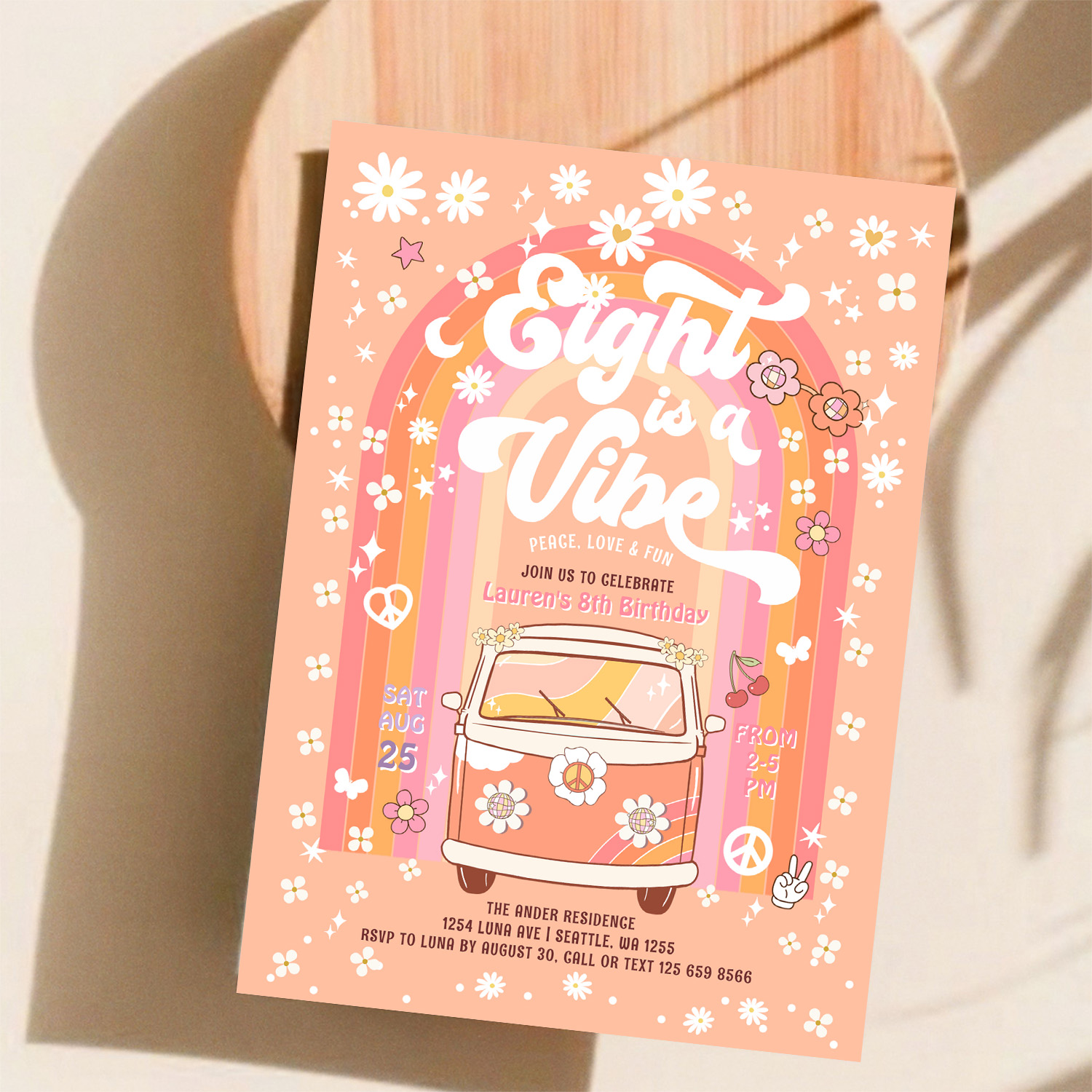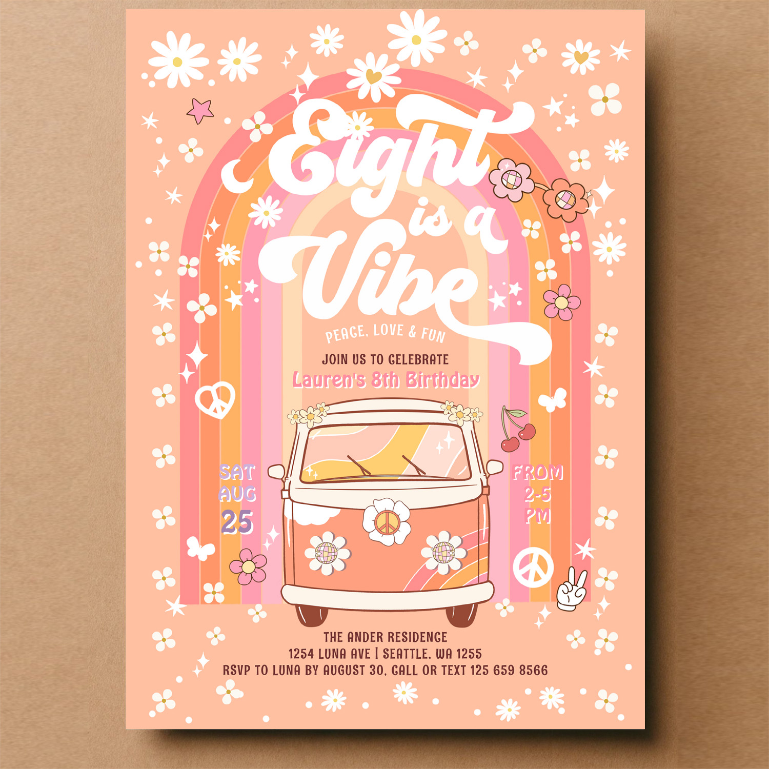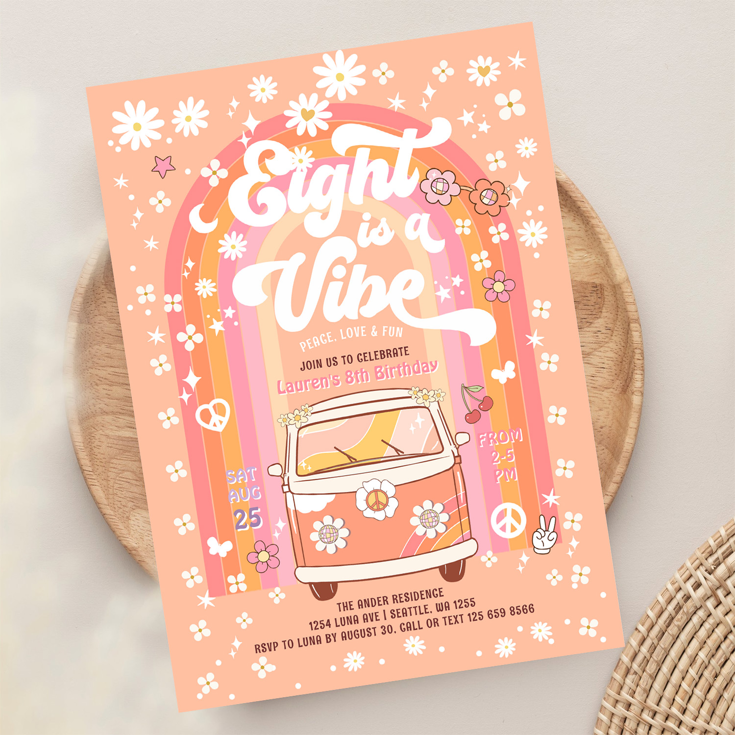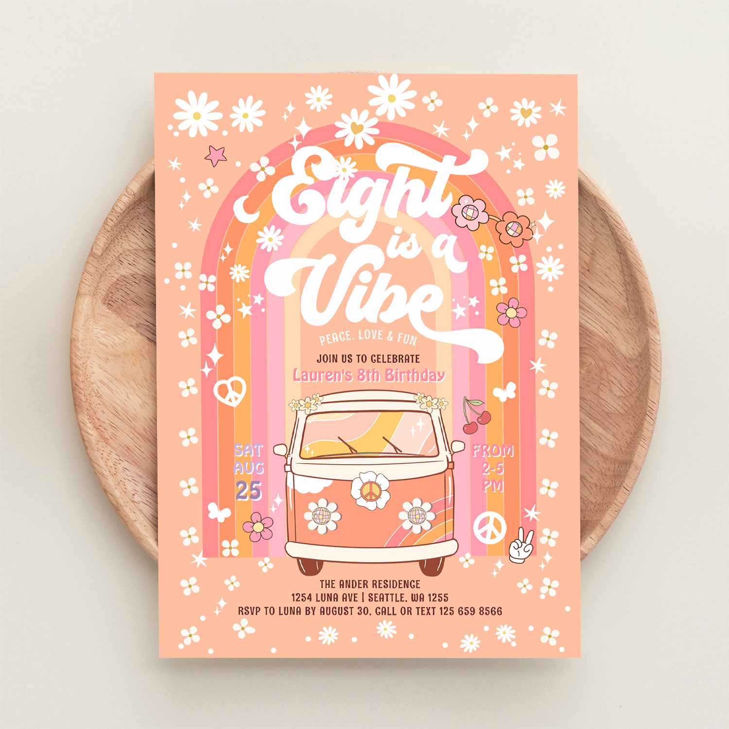 Groovy Eight Is A Vibe Van Bus 8th Birthday Invitation