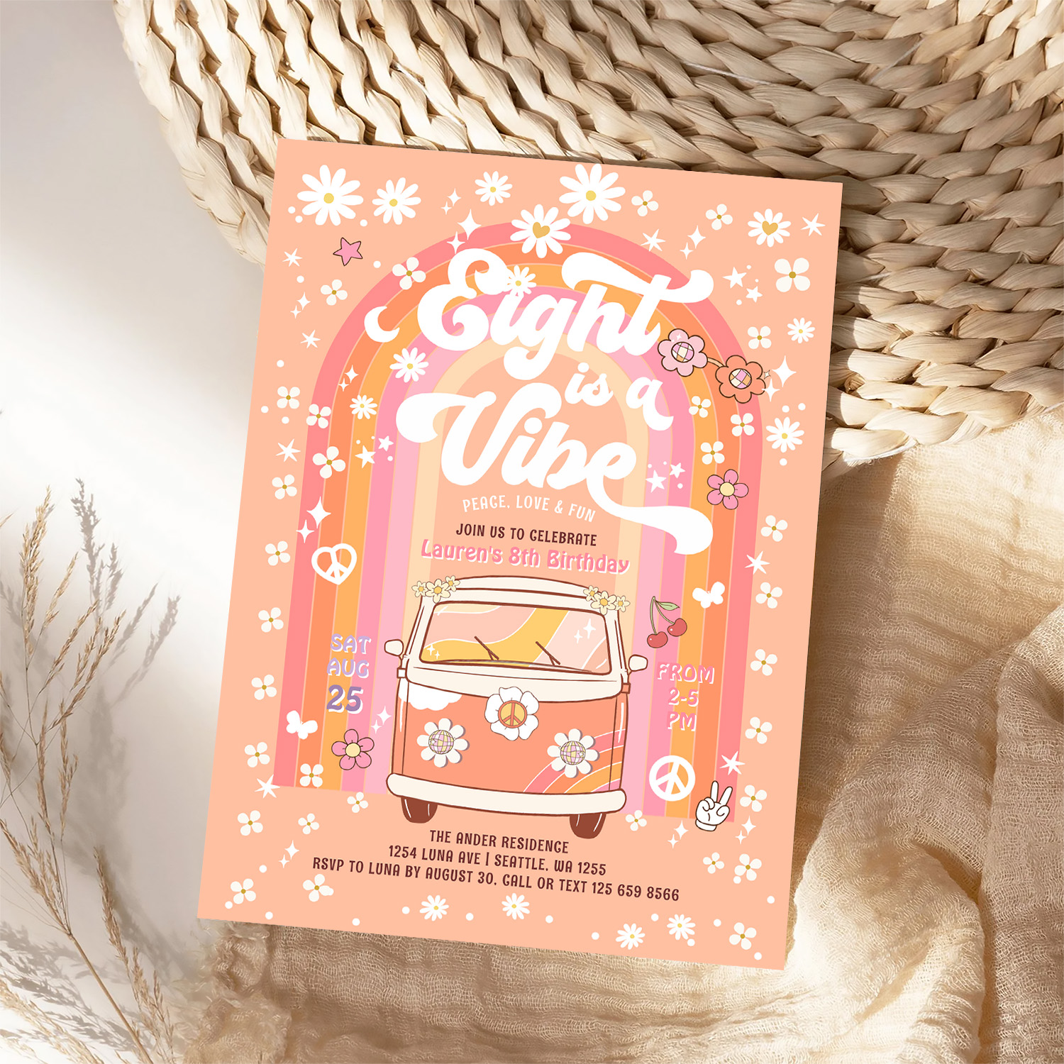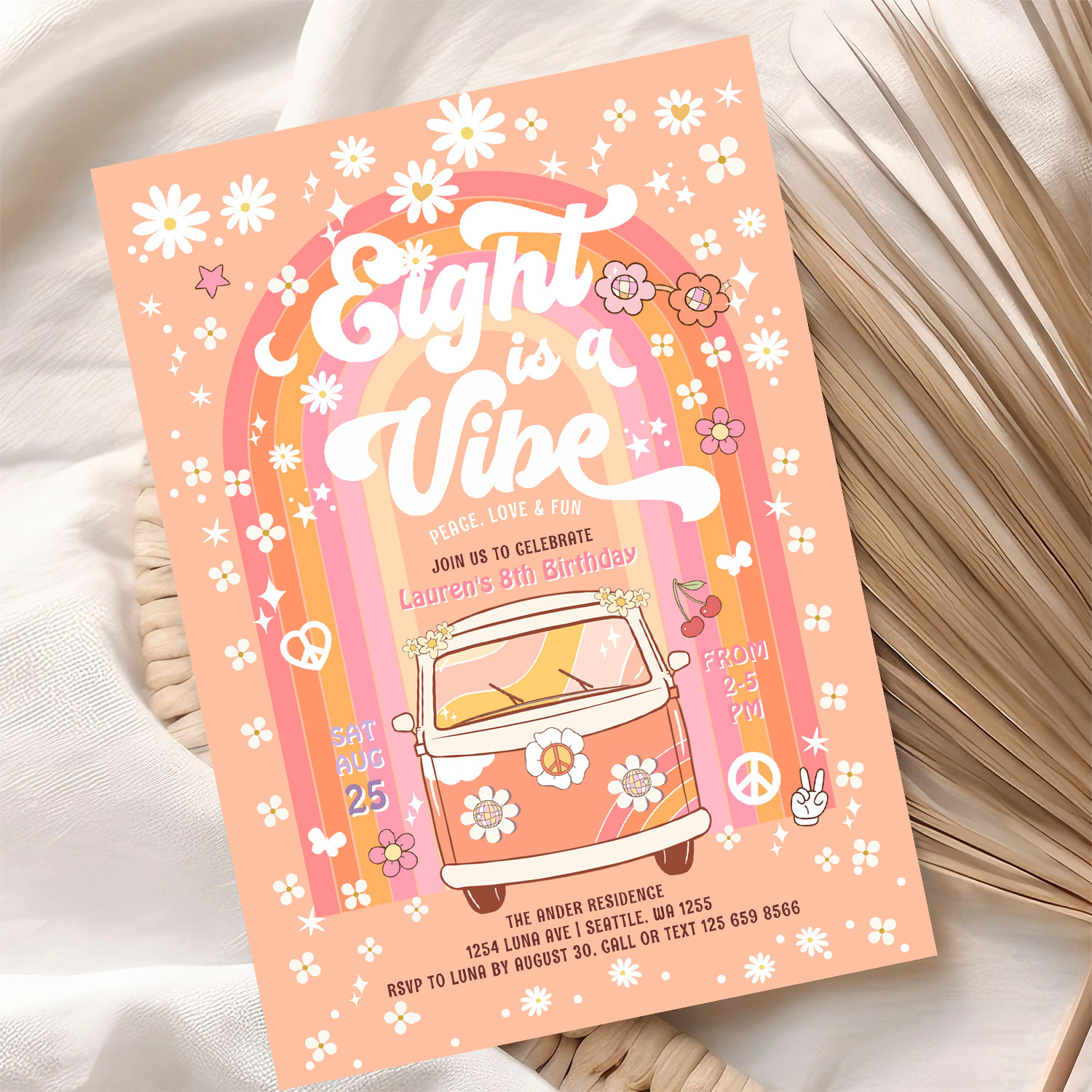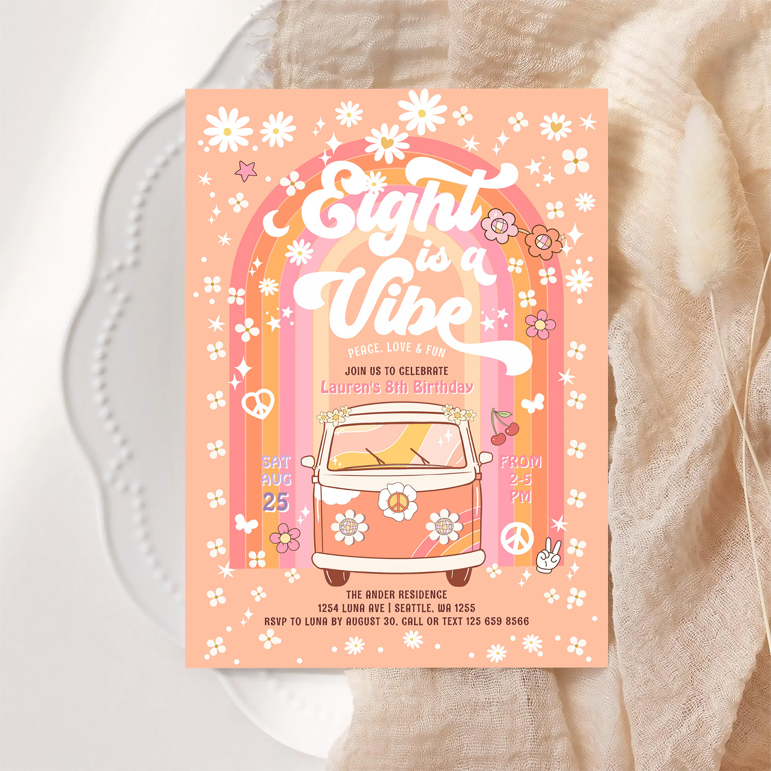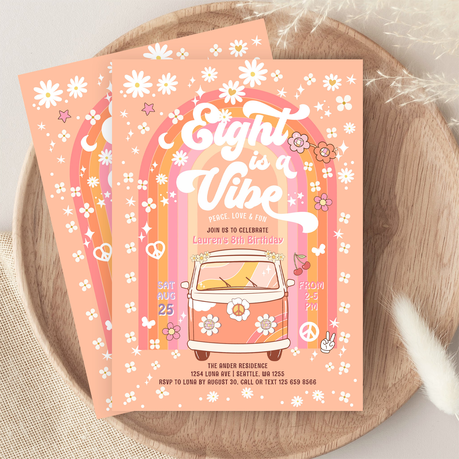 Groovy Eight Is A Vibe Van Bus 8th Birthday Invitation
