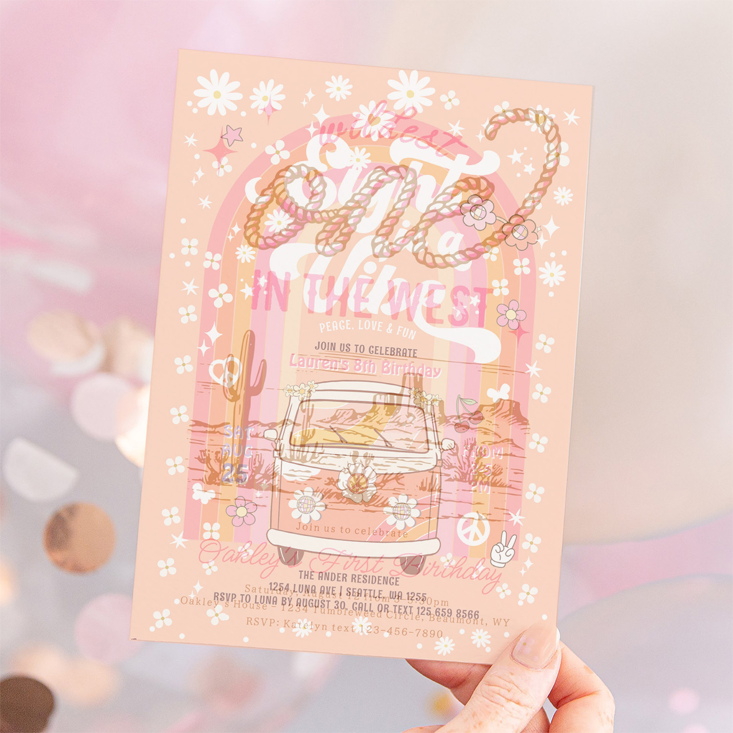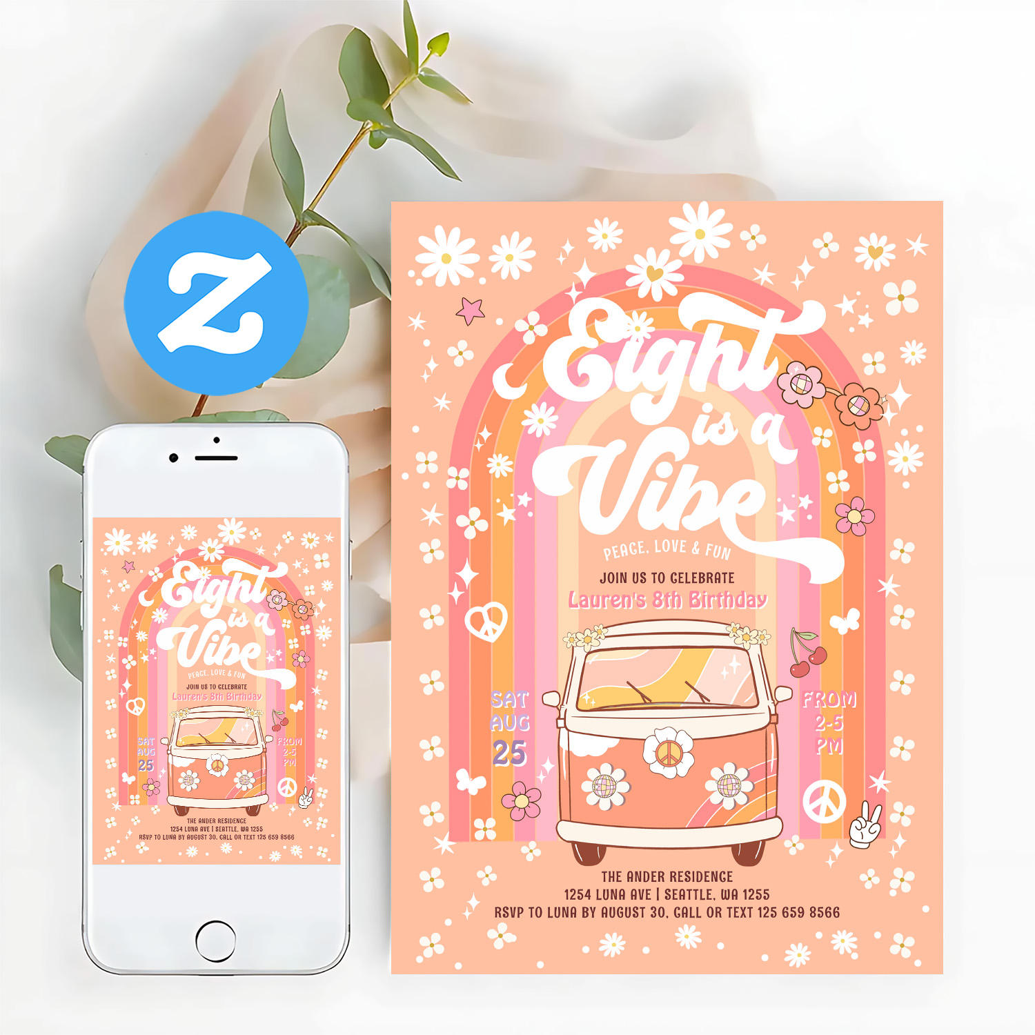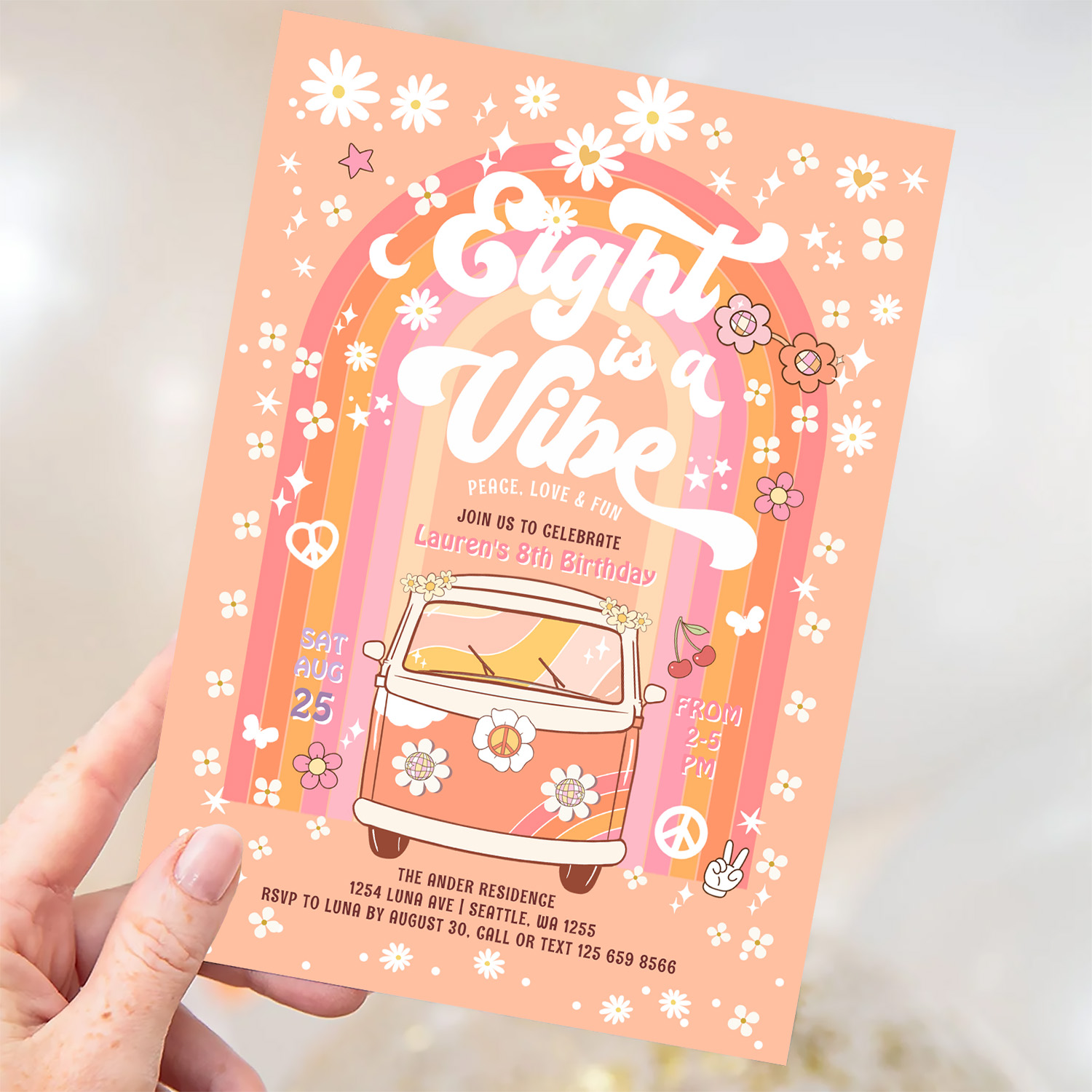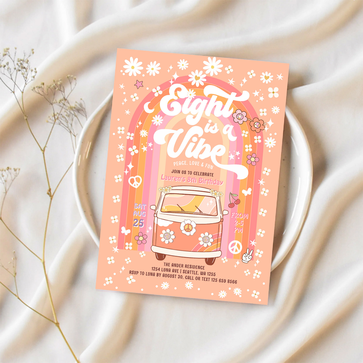 Groovy Eight Is A Vibe Van Bus 8th Birthday Invitation