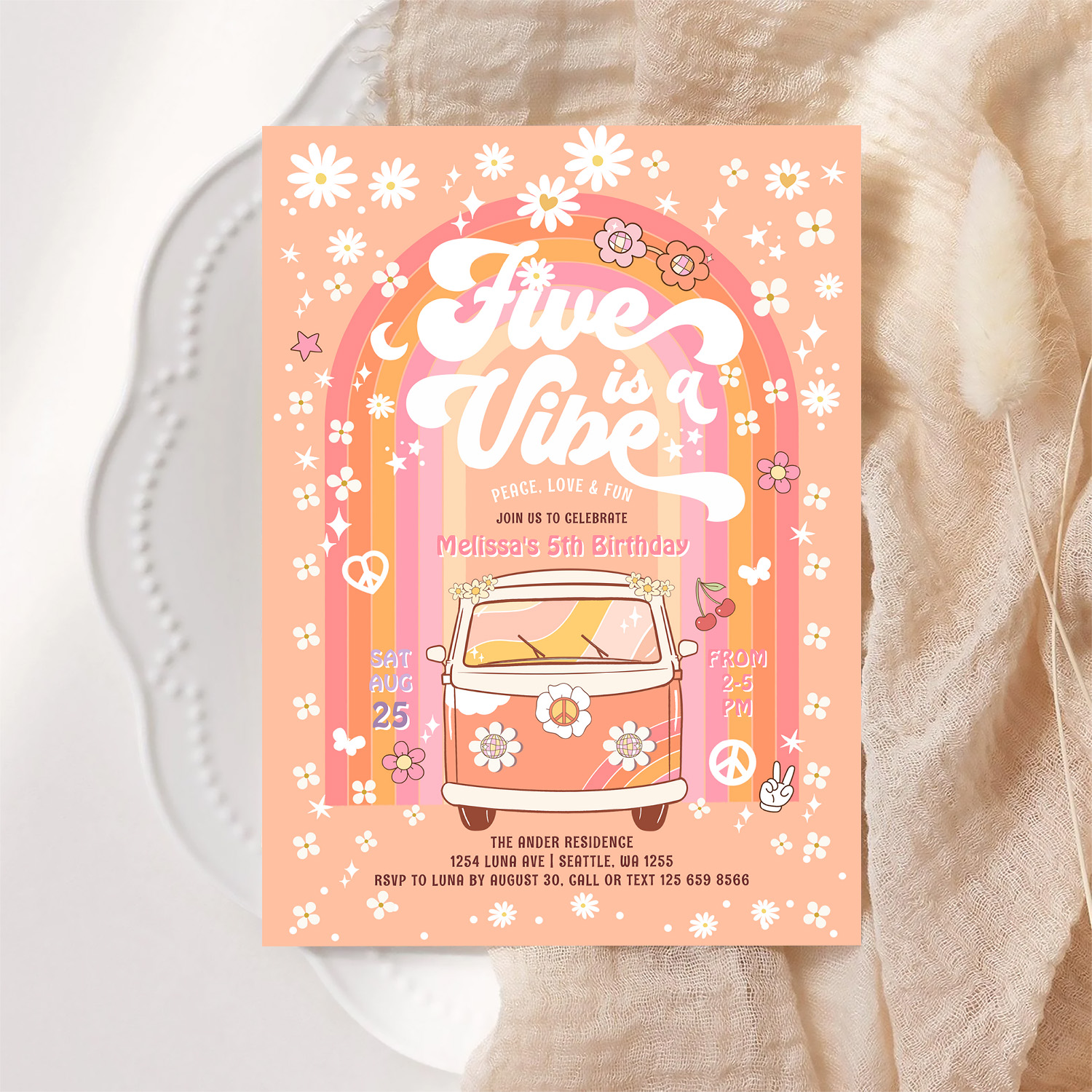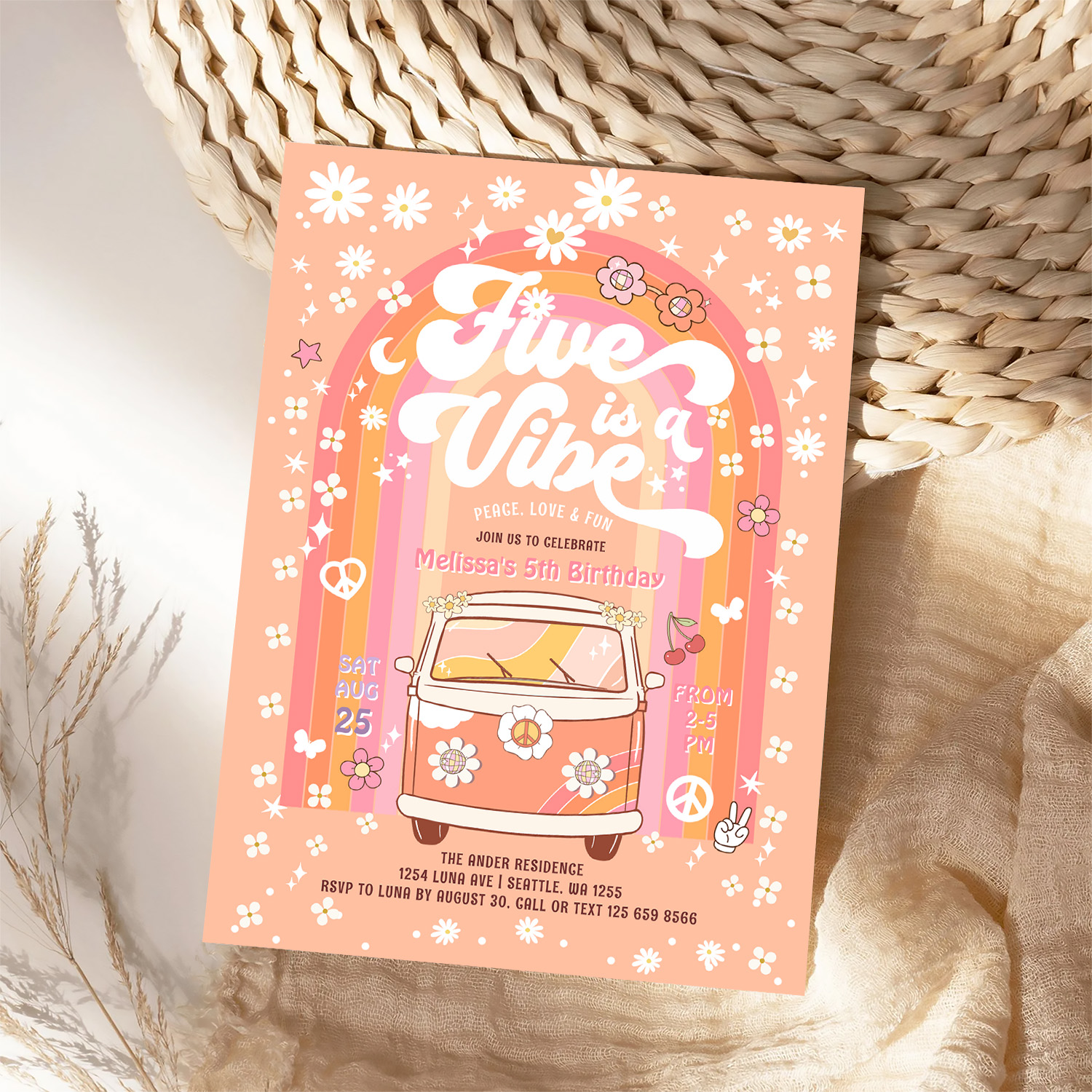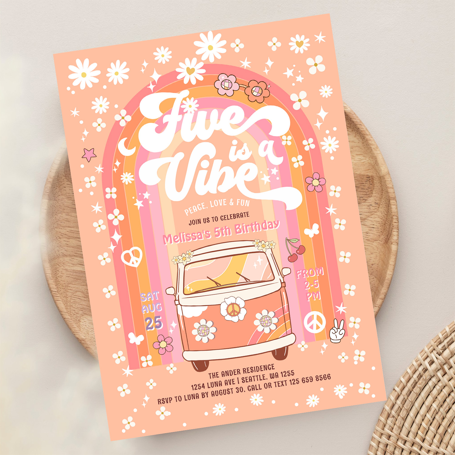 Groovy Five Is A Vibe Van Bus 5th Birthday Invitation
