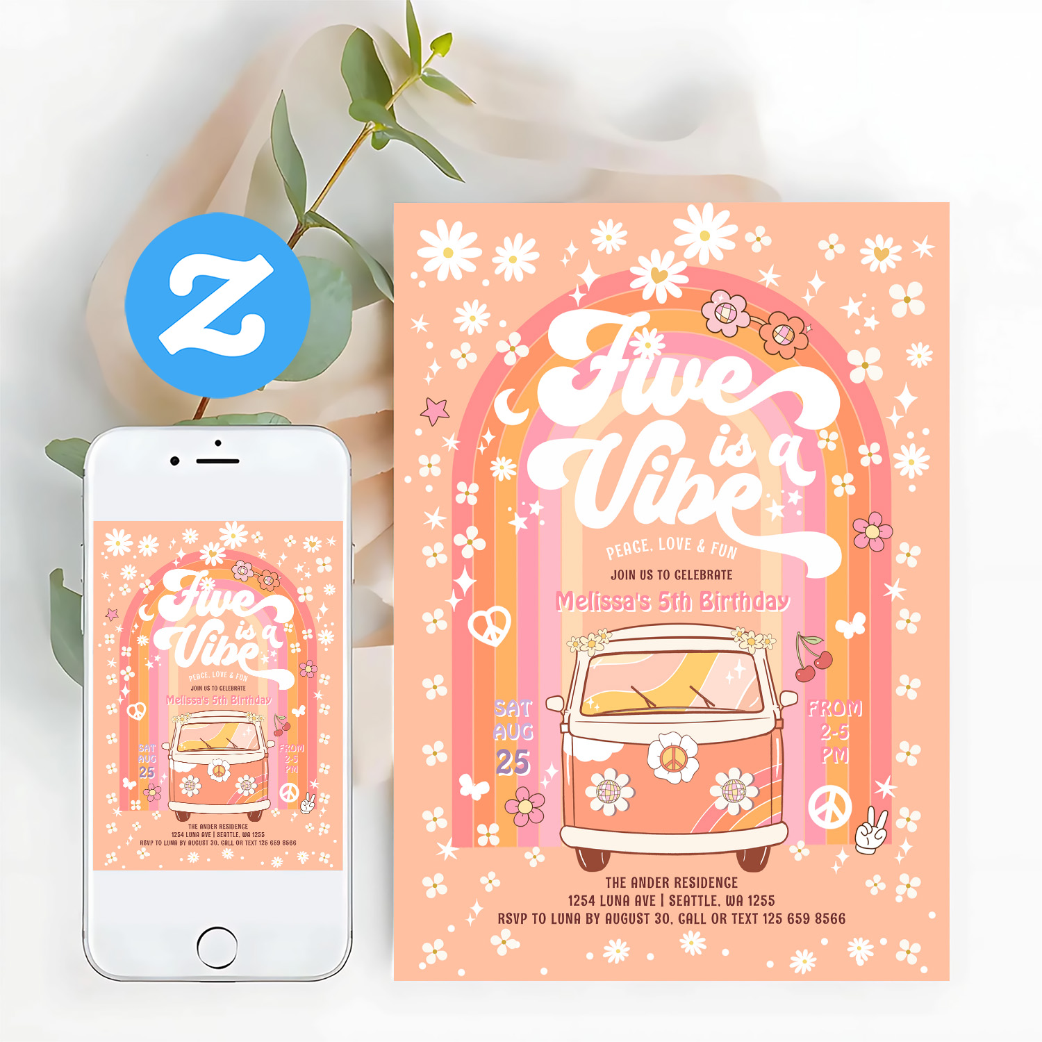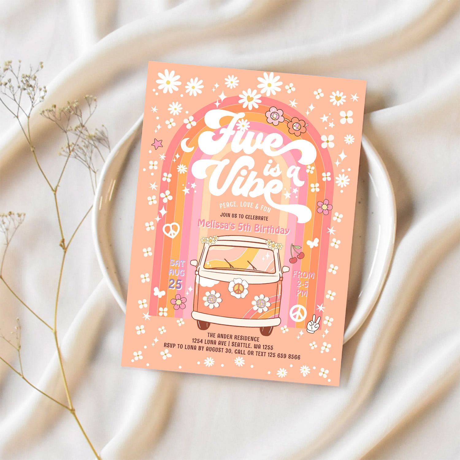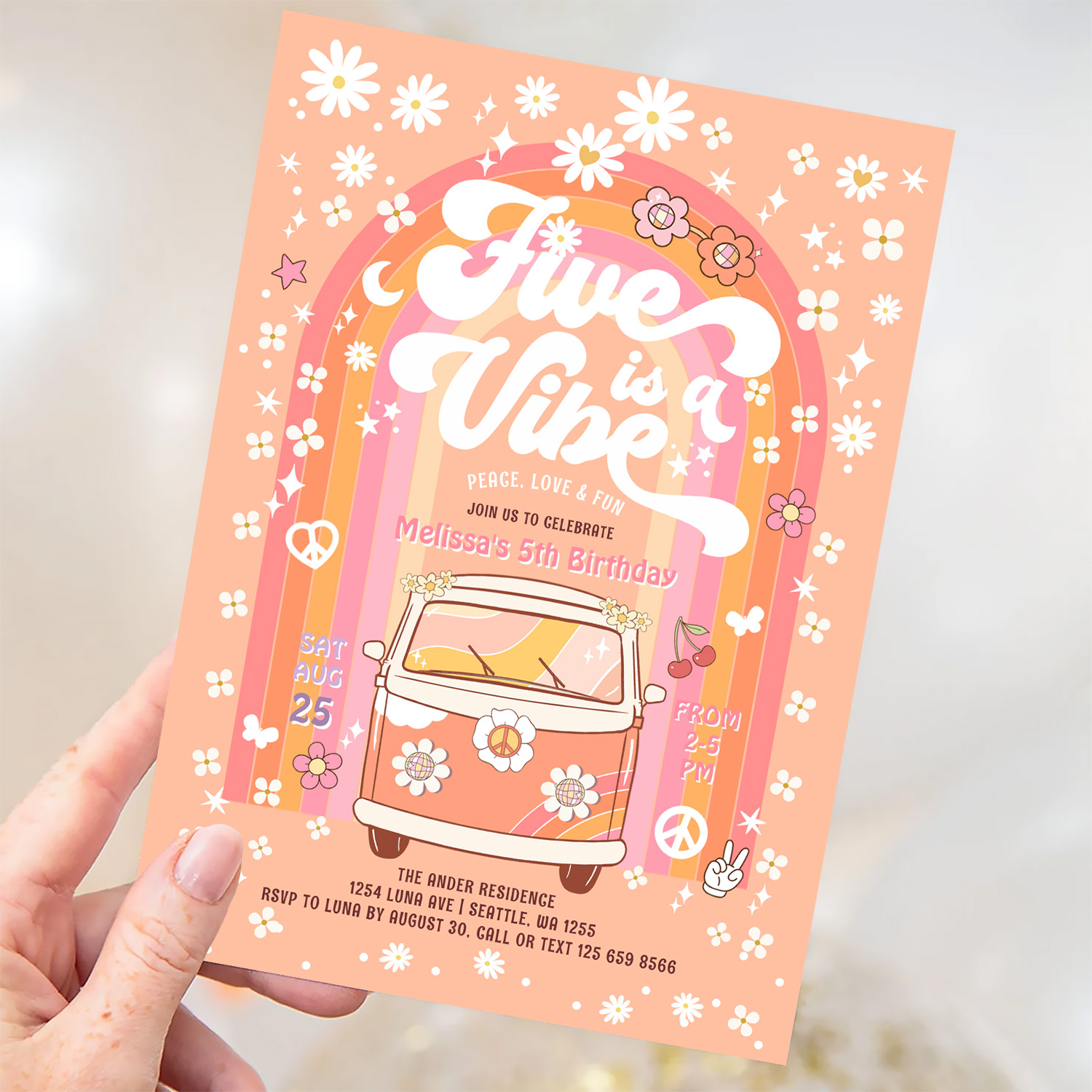 Groovy Five Is A Vibe Van Bus 5th Birthday Invitation