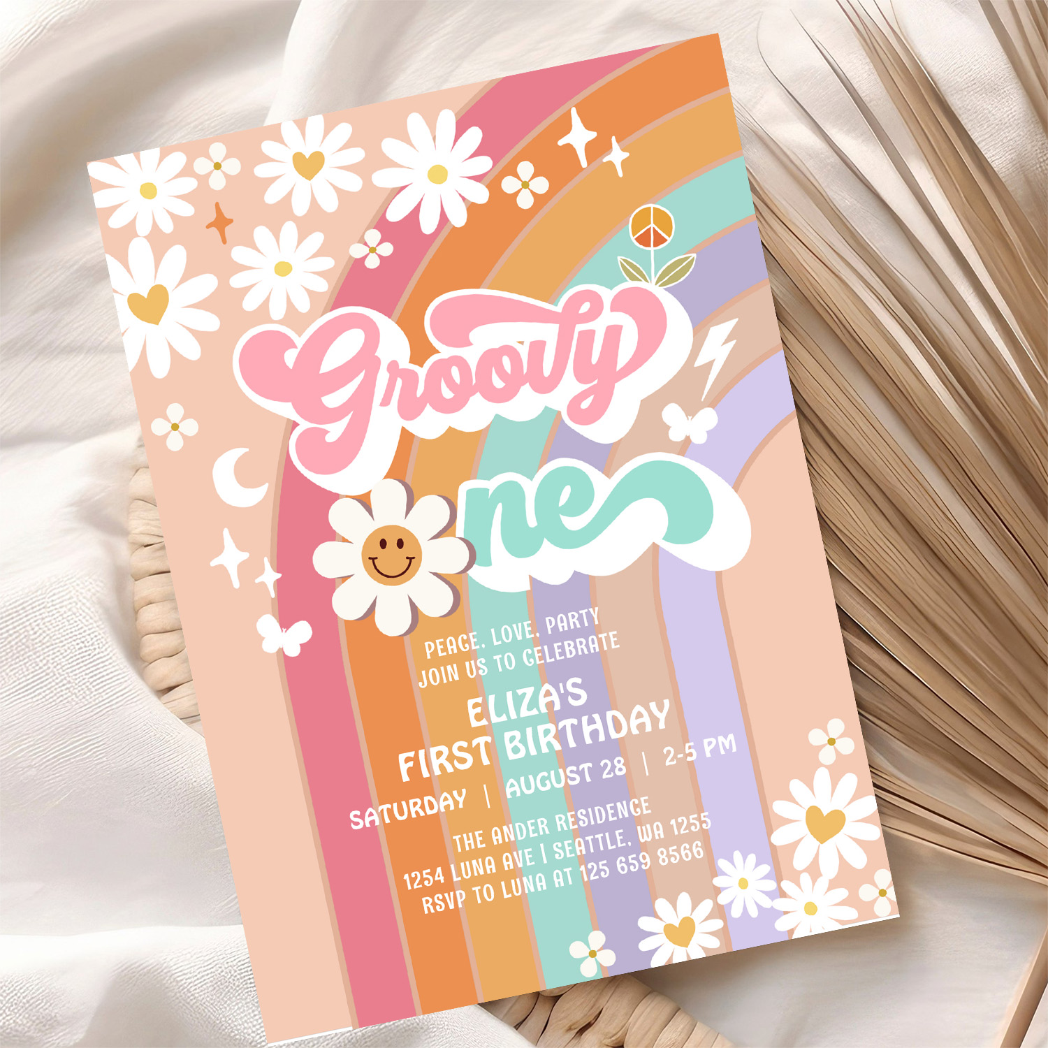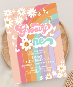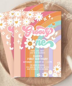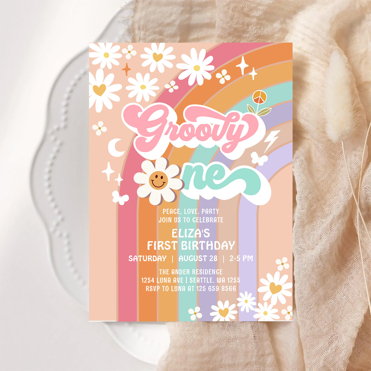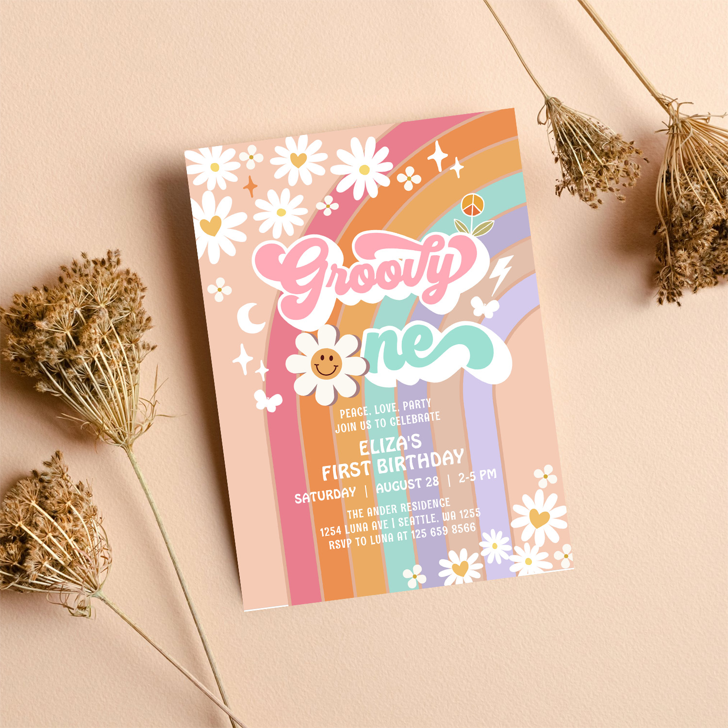 Groovy One Daisy Rainbow Hippie Retro Birthday Invitation - Related products