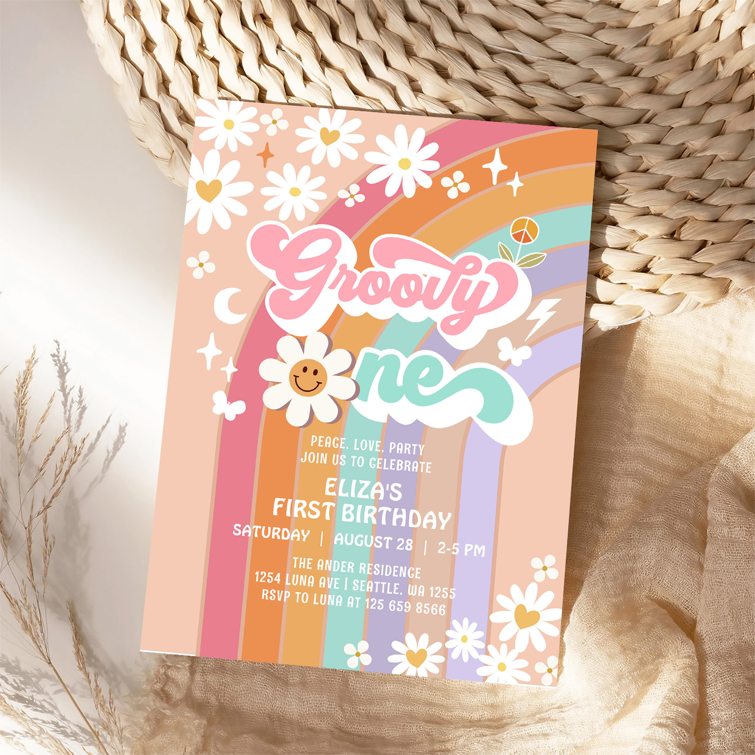Groovy One Daisy Rainbow Hippie Retro Birthday Invitation