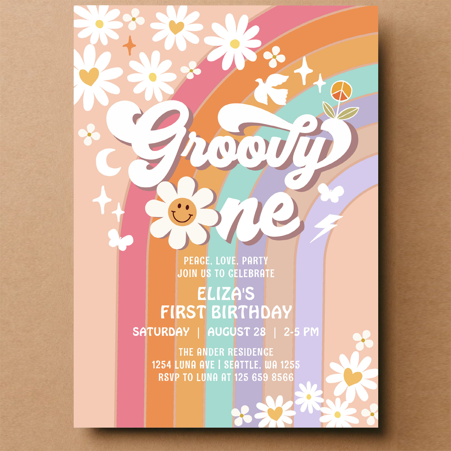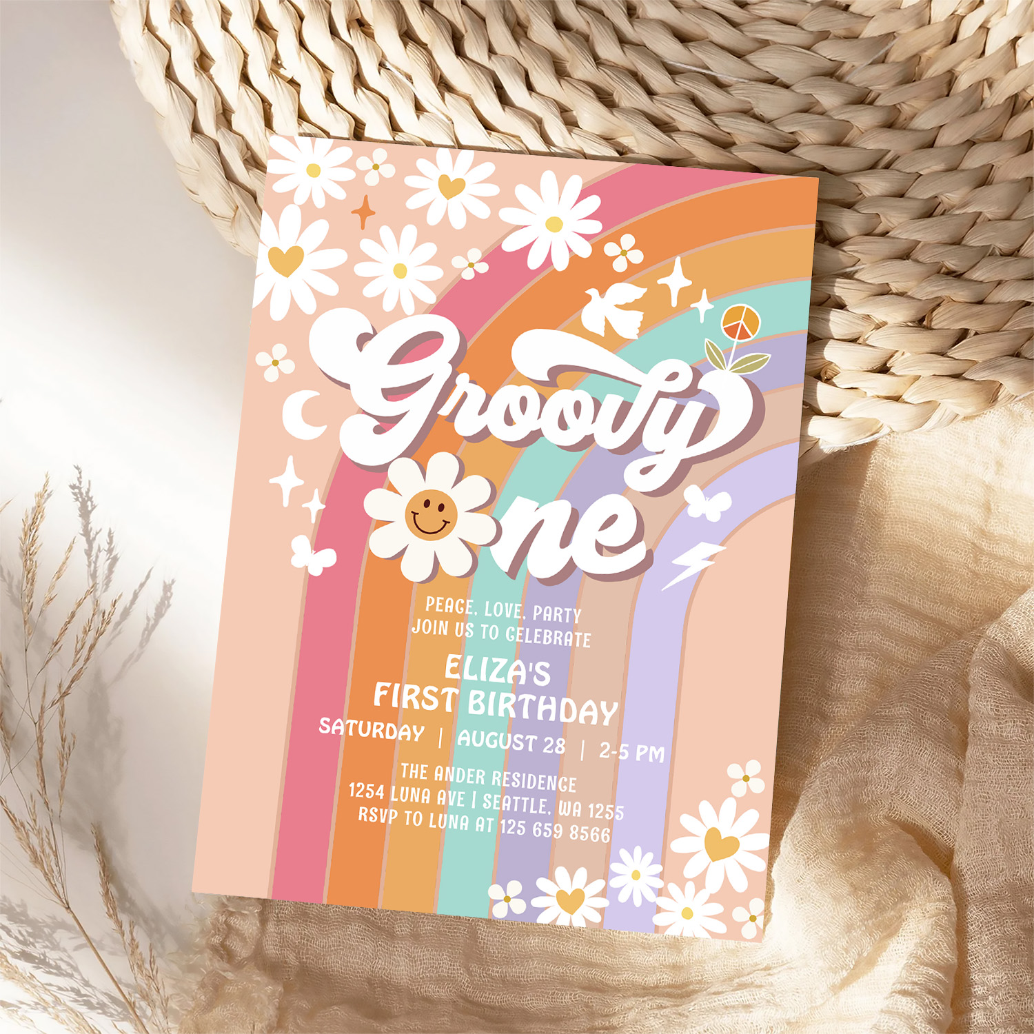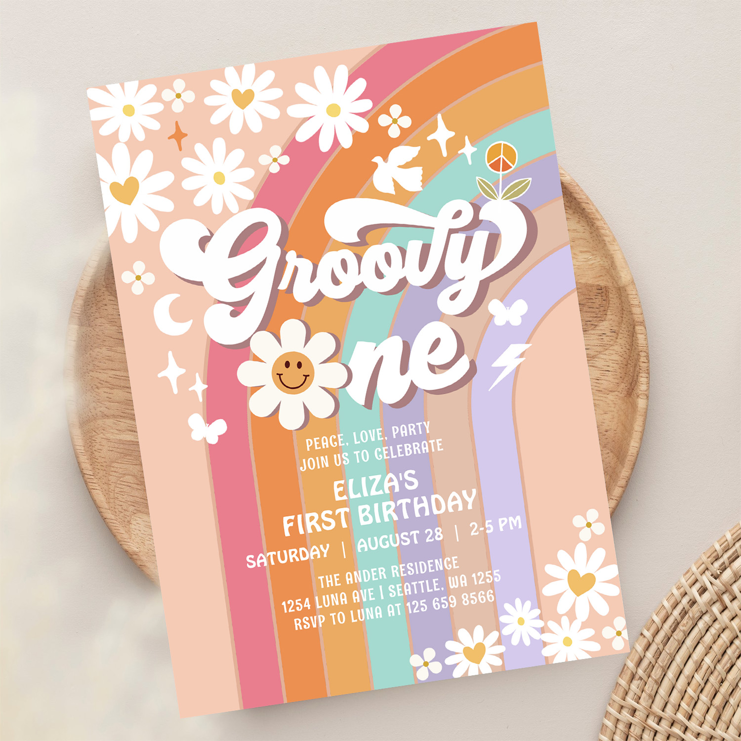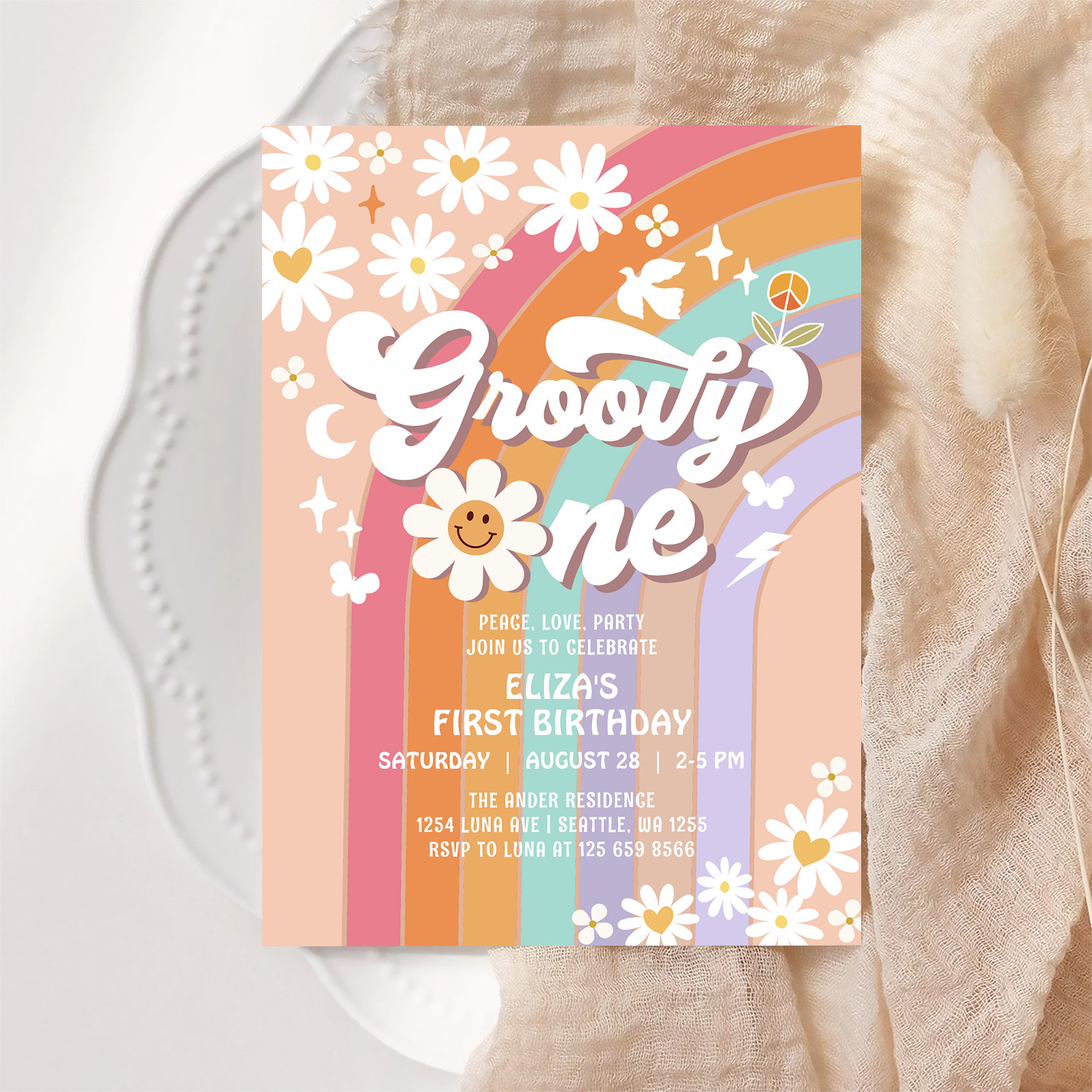 Groovy One Hippie 70S Rainbow Retro 1st Birthday Invitation