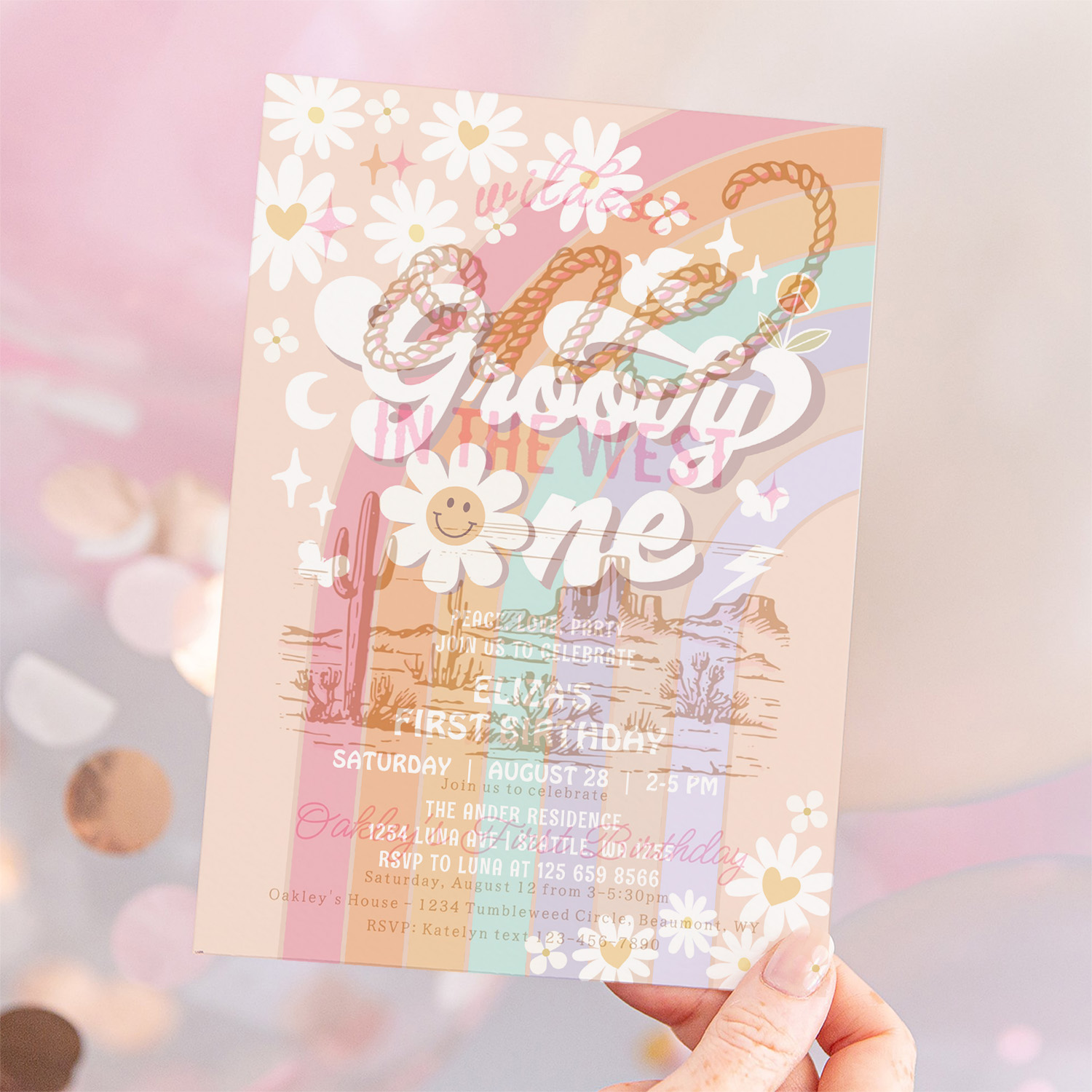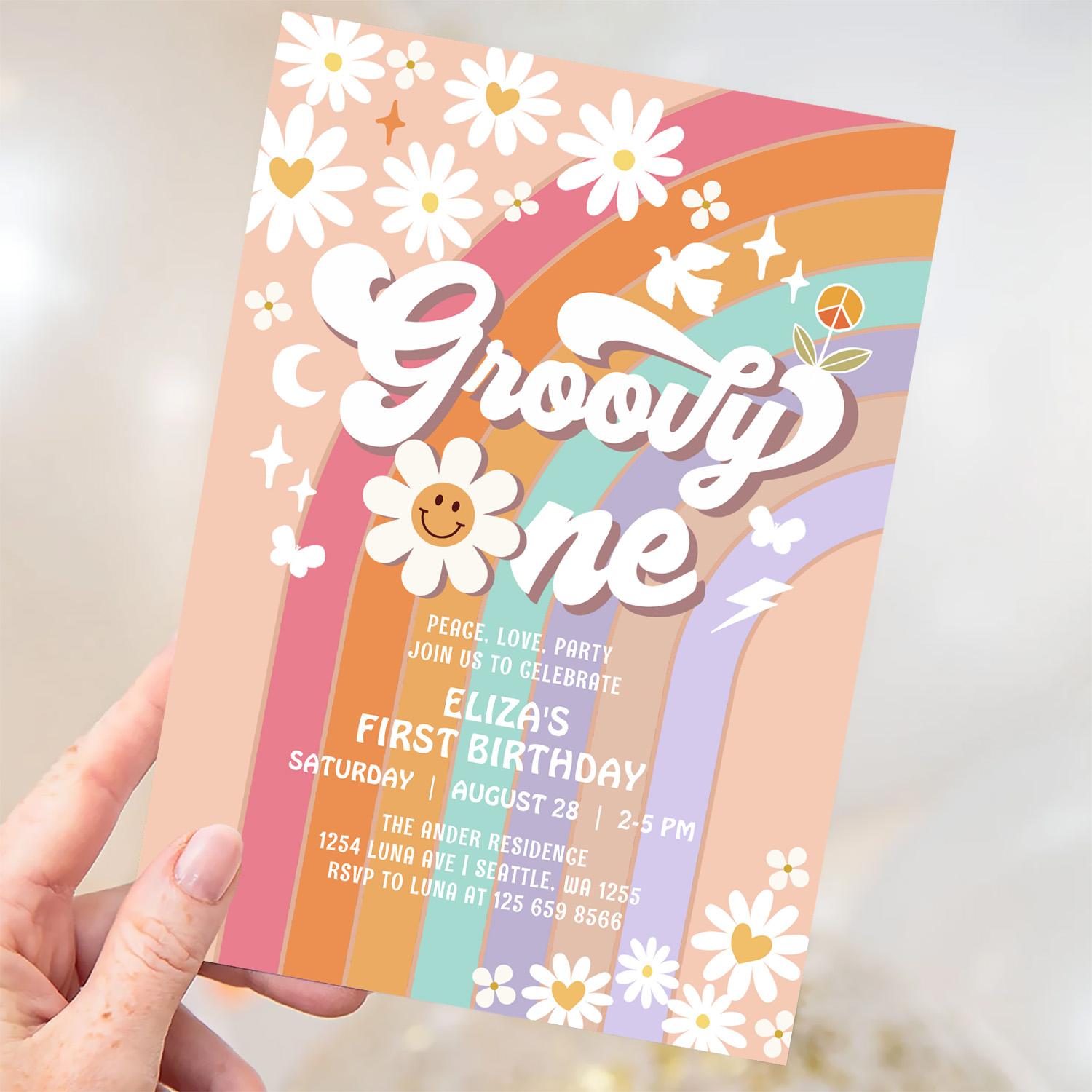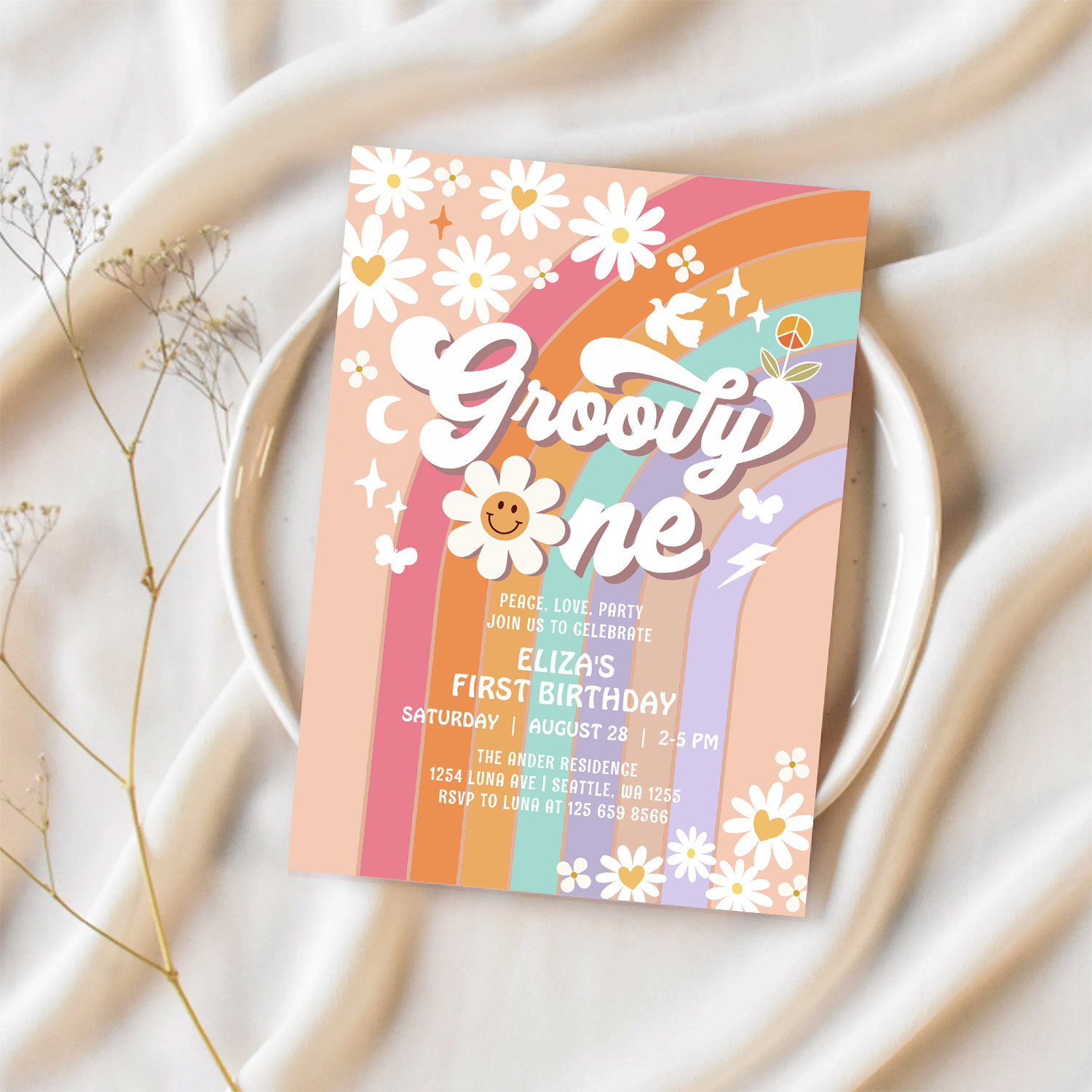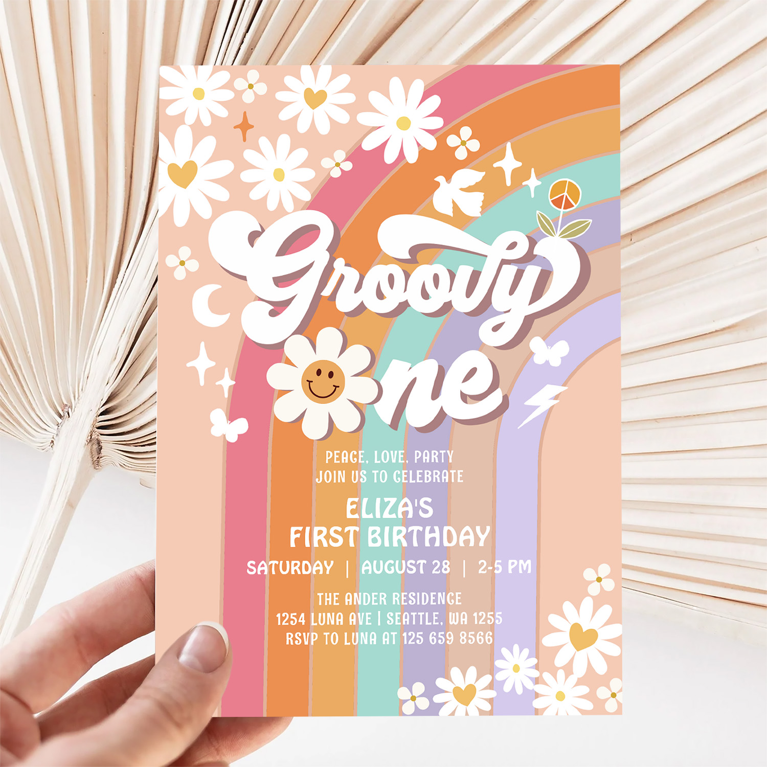 Groovy One Hippie 70S Rainbow Retro 1st Birthday Invitation
