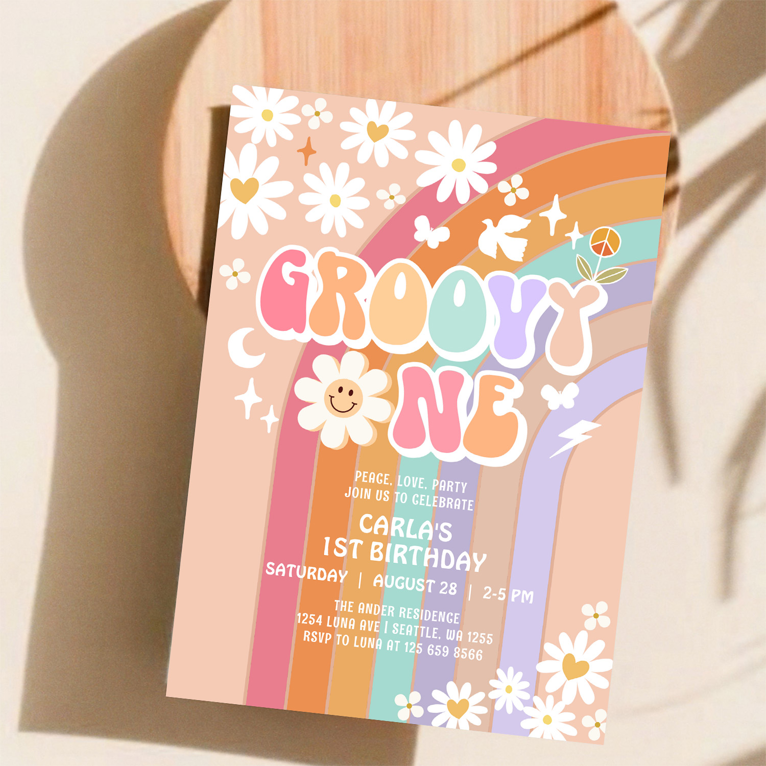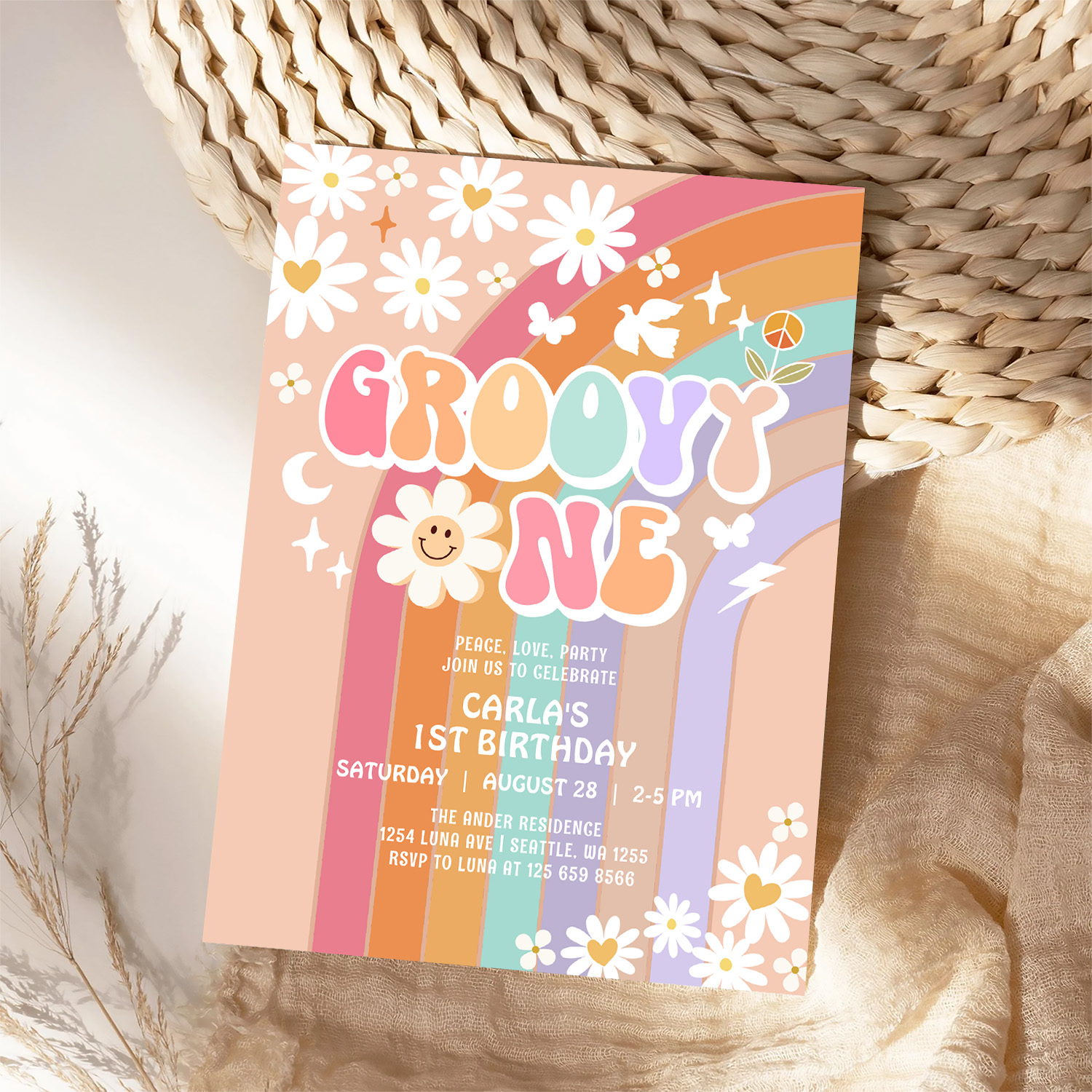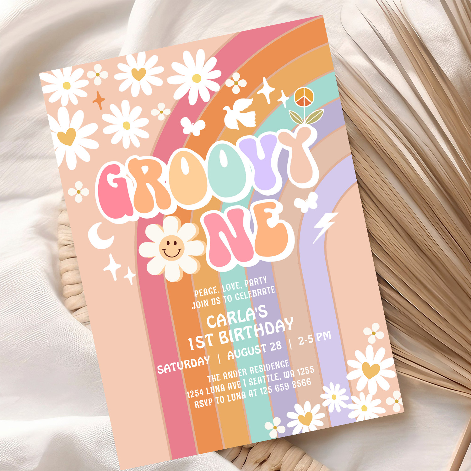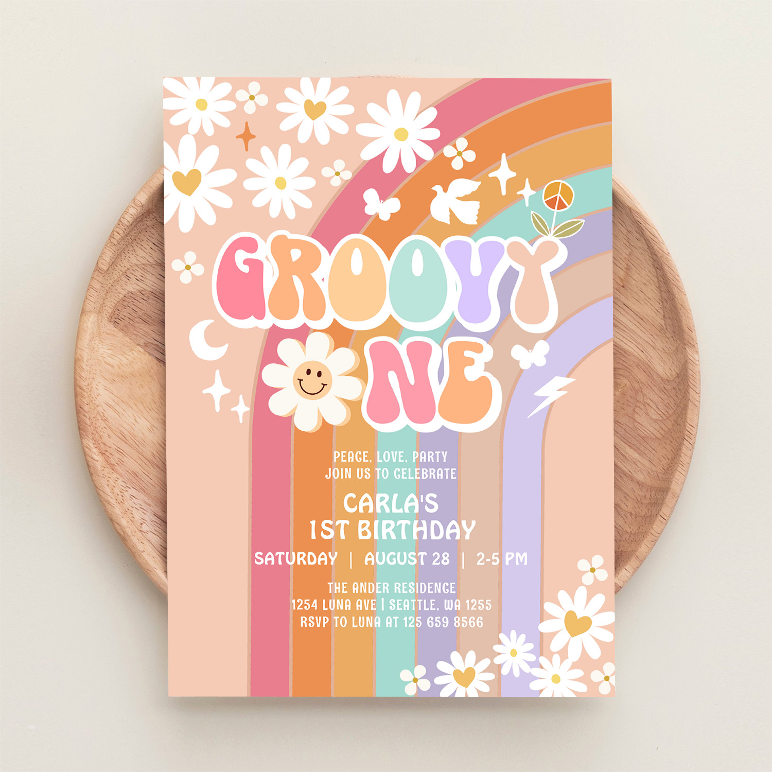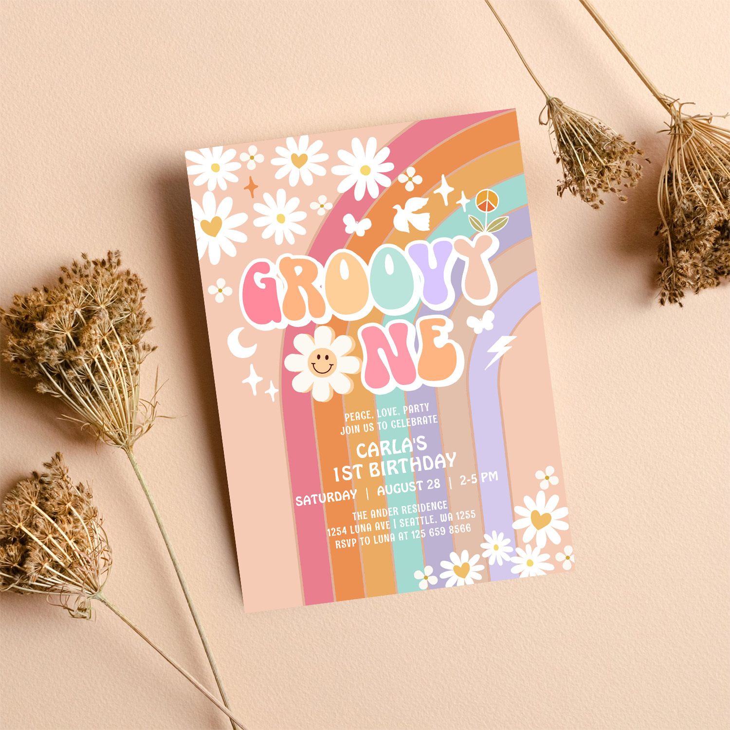 Groovy One Hippie 70S Retro 1st Birthday Invitation