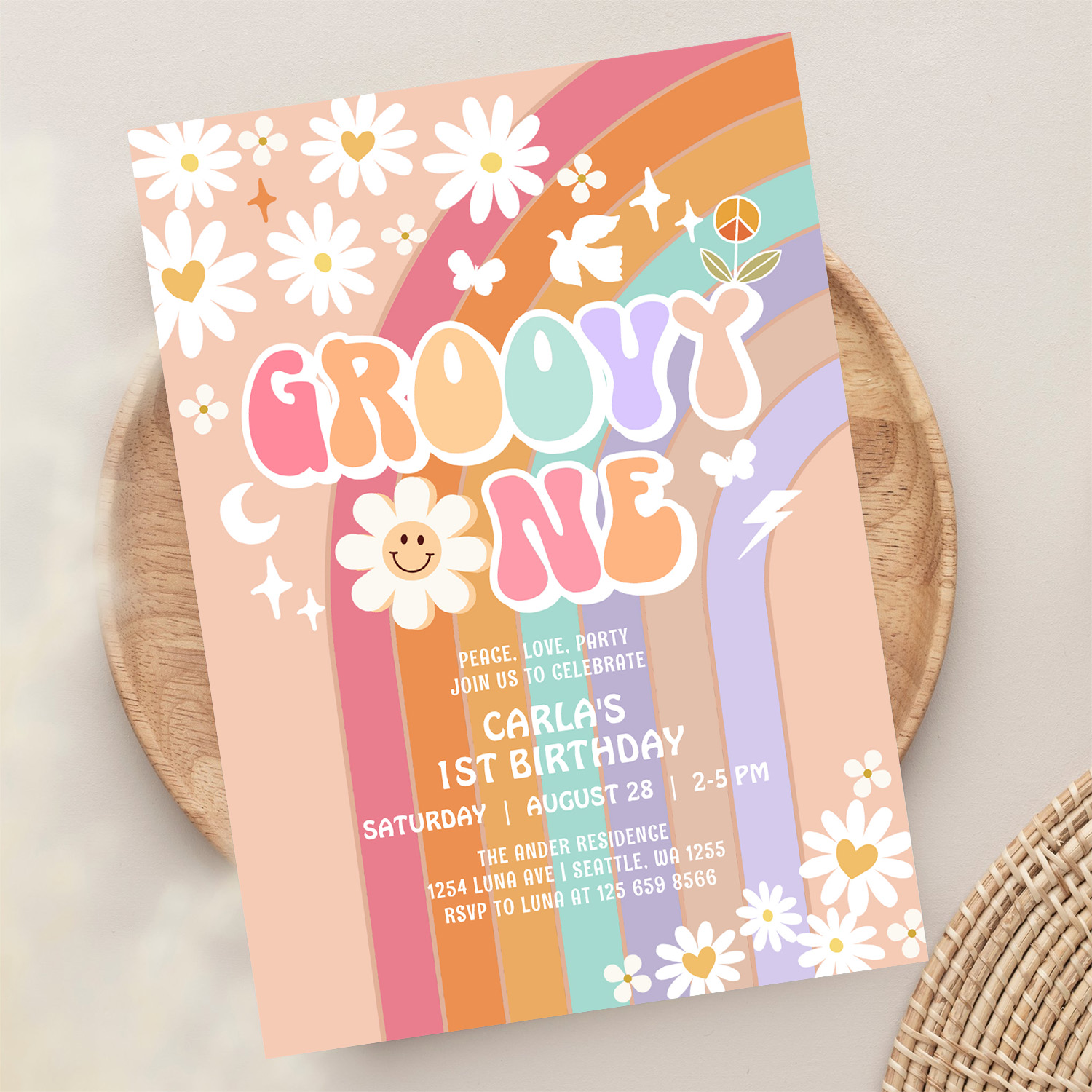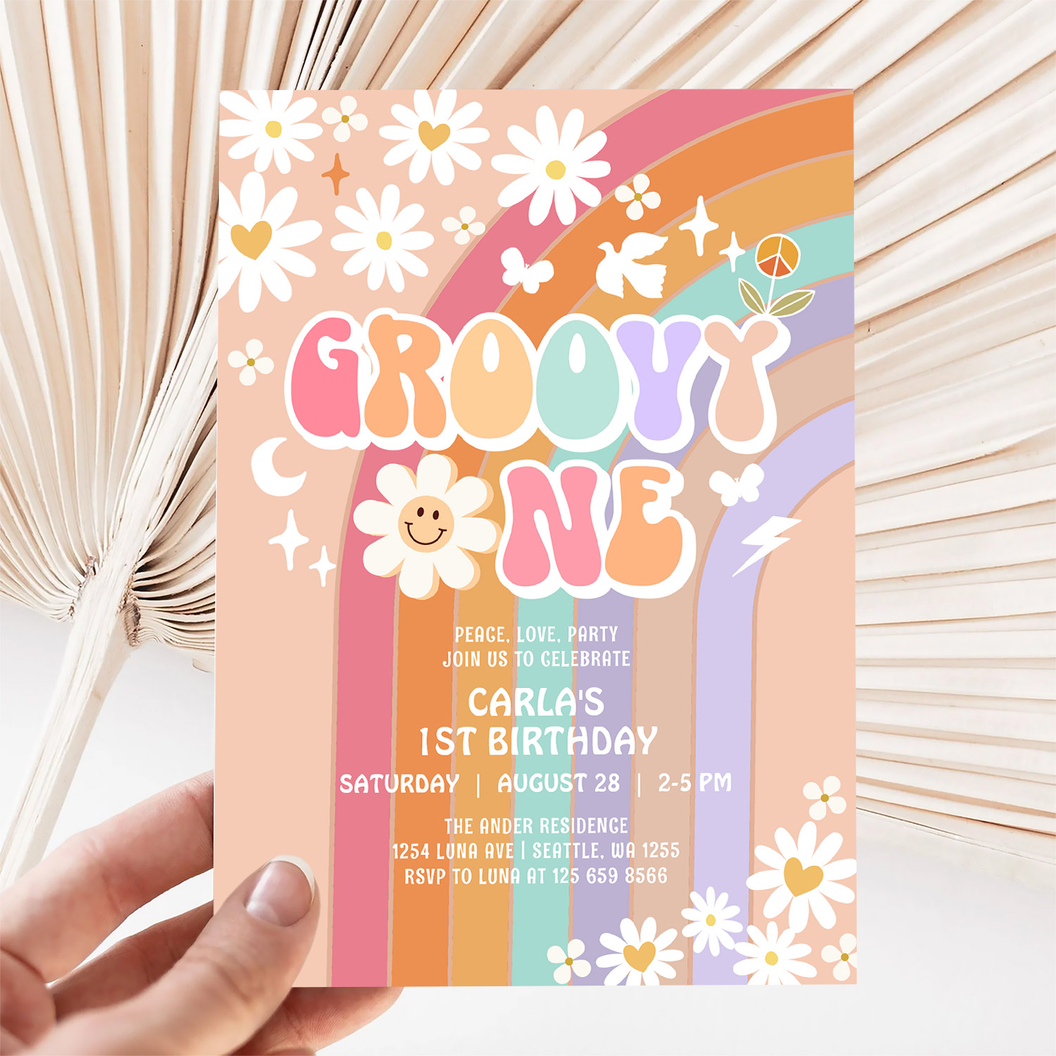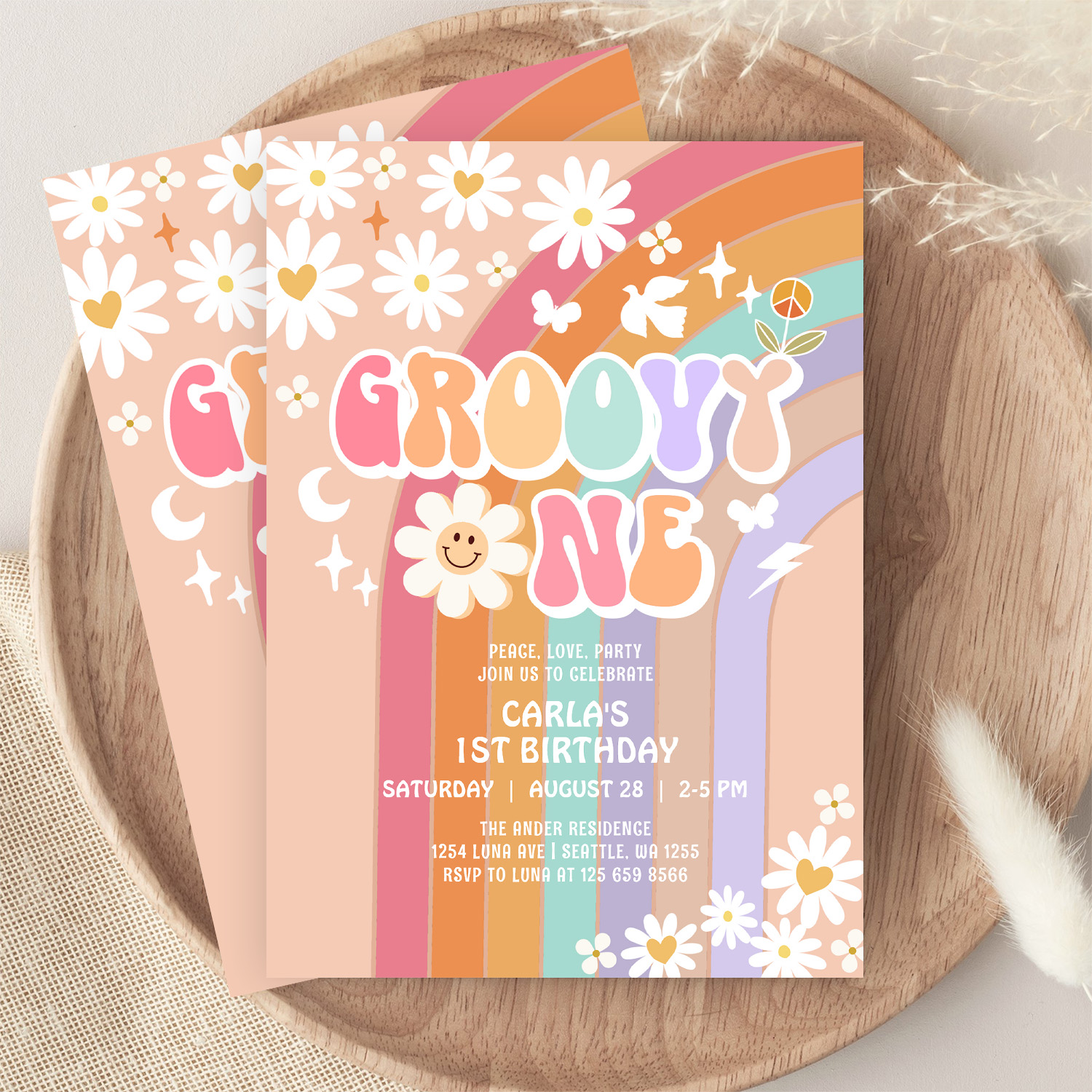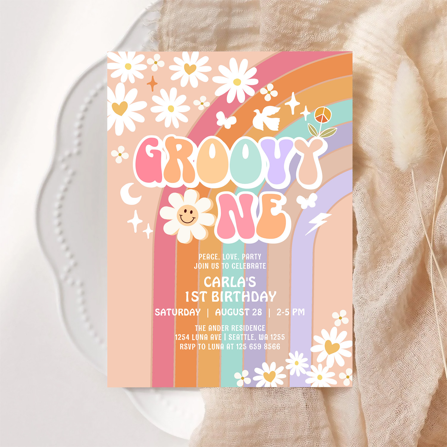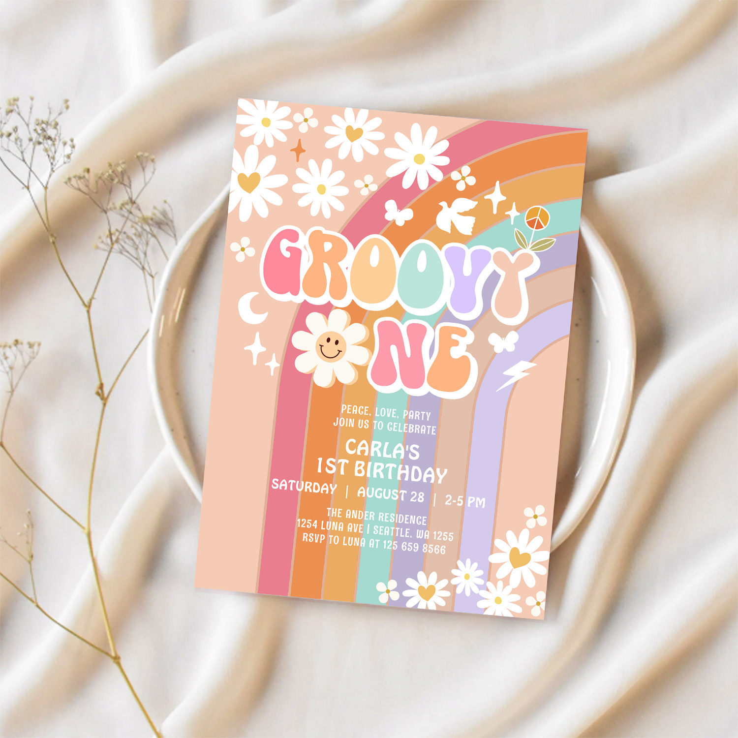 Groovy One Hippie 70S Retro 1st Birthday Invitation