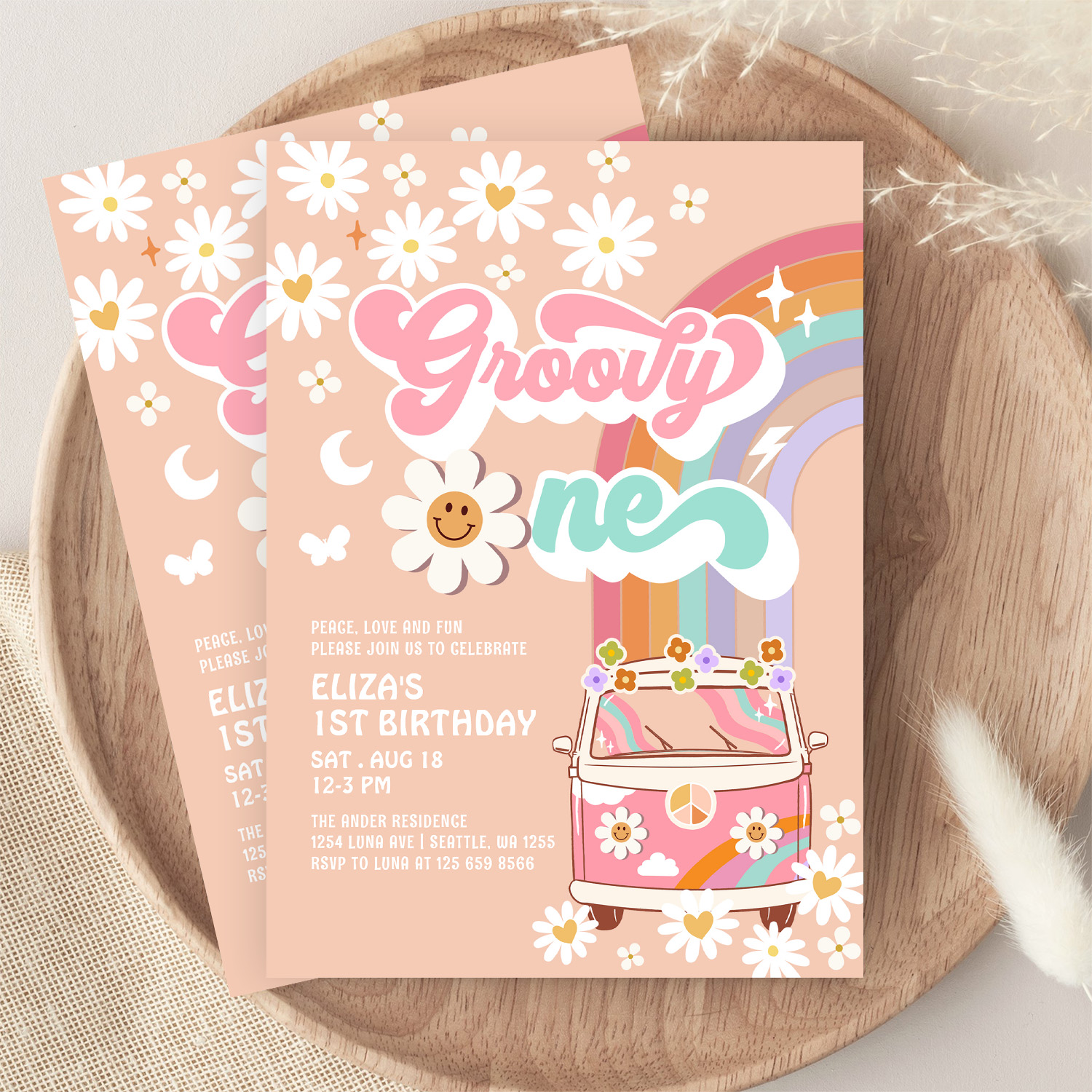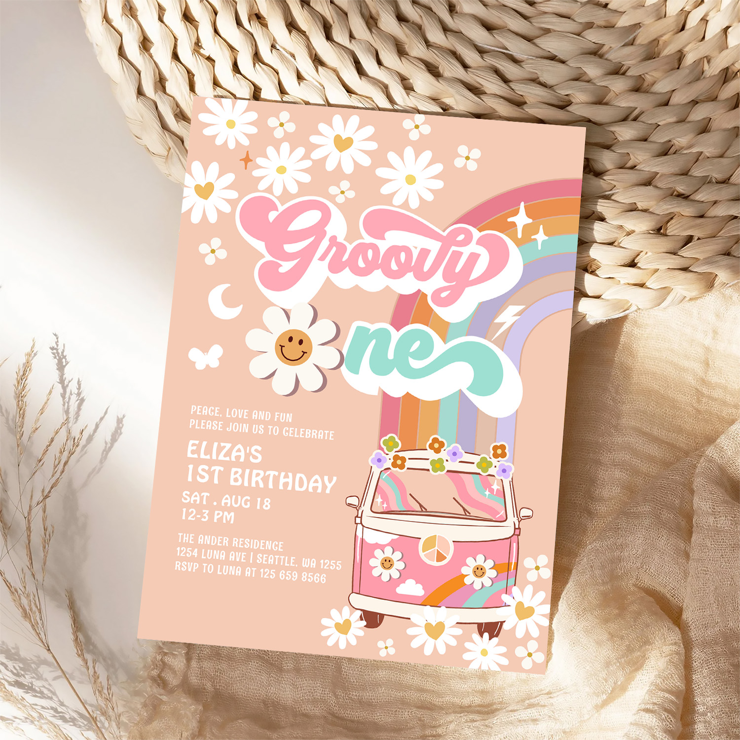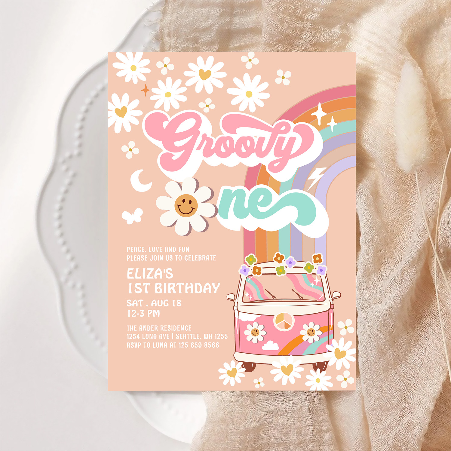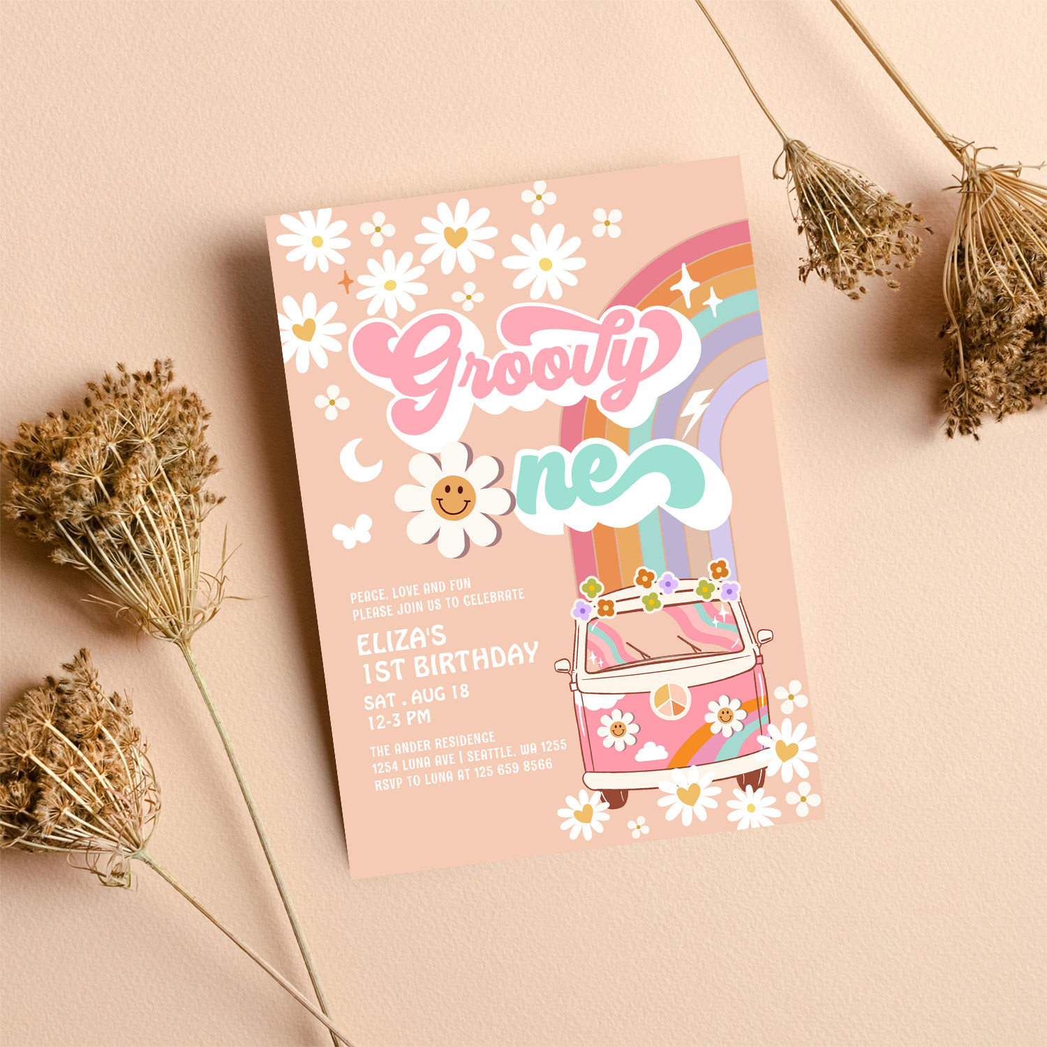 Groovy One Pink Daisy Rainbow Van 1st Birthday Invitation - Related products