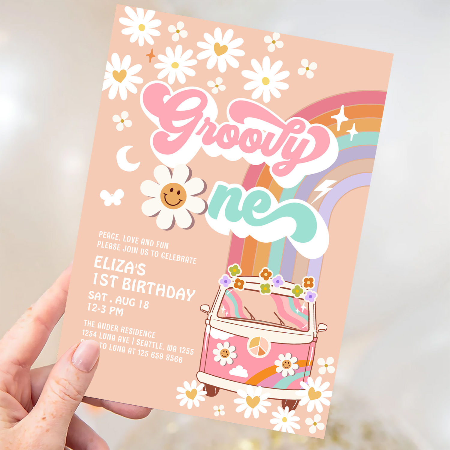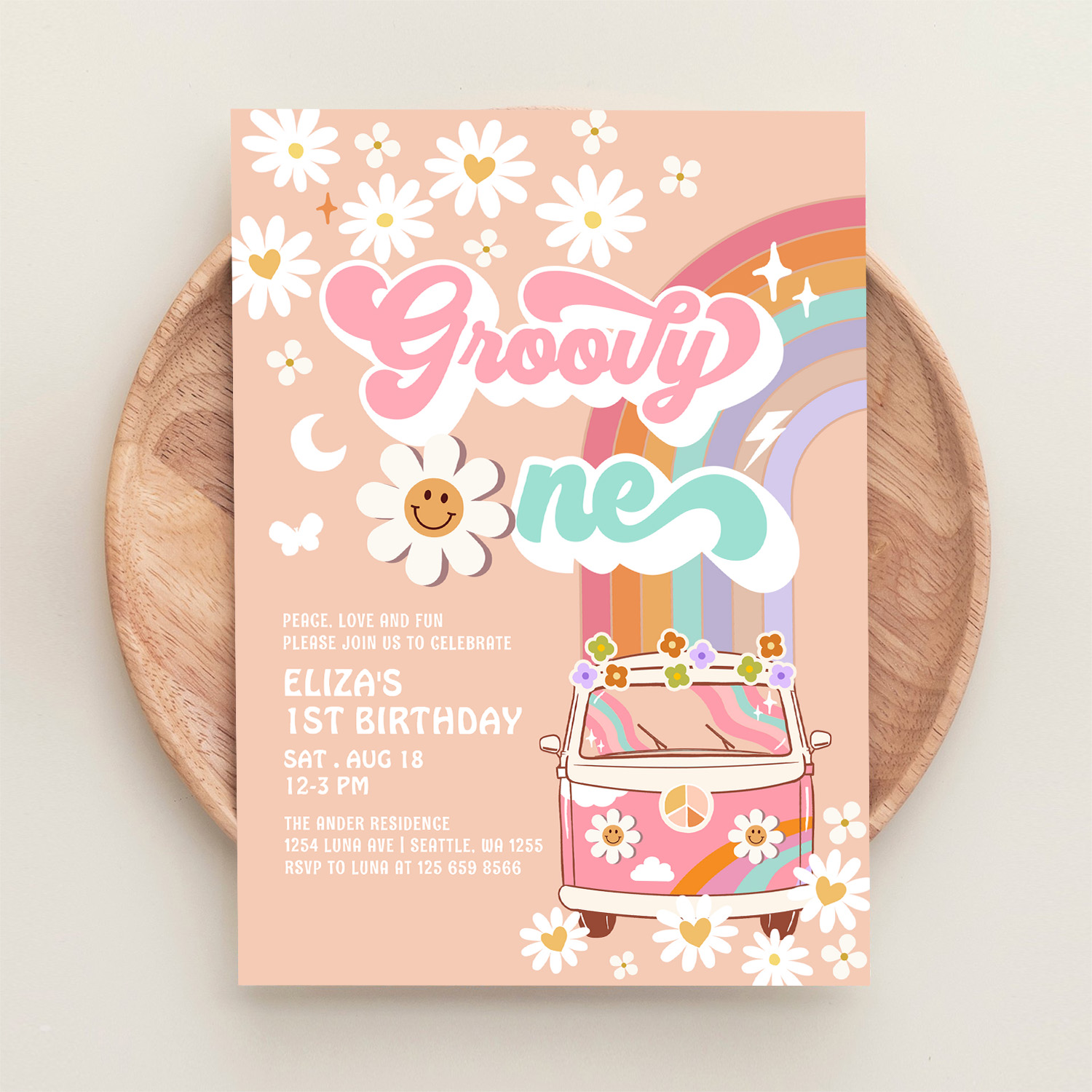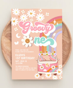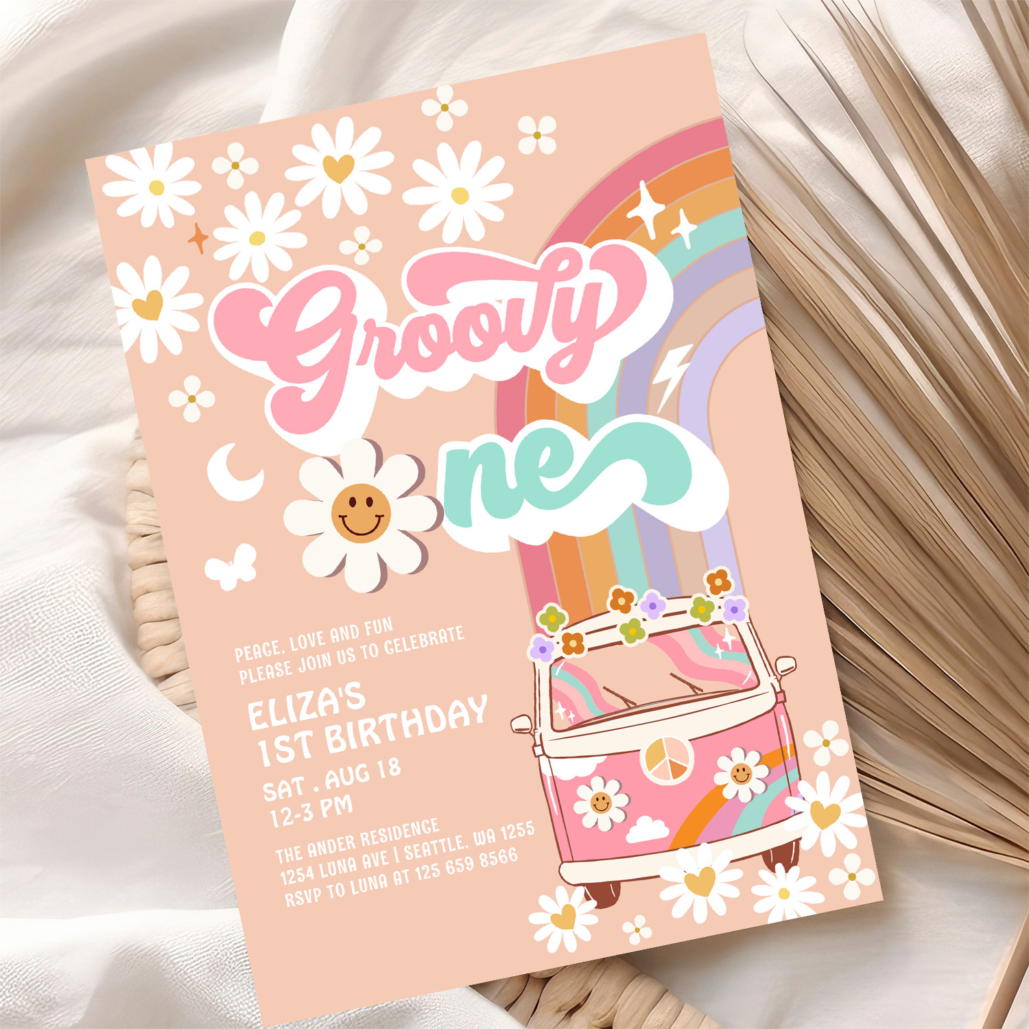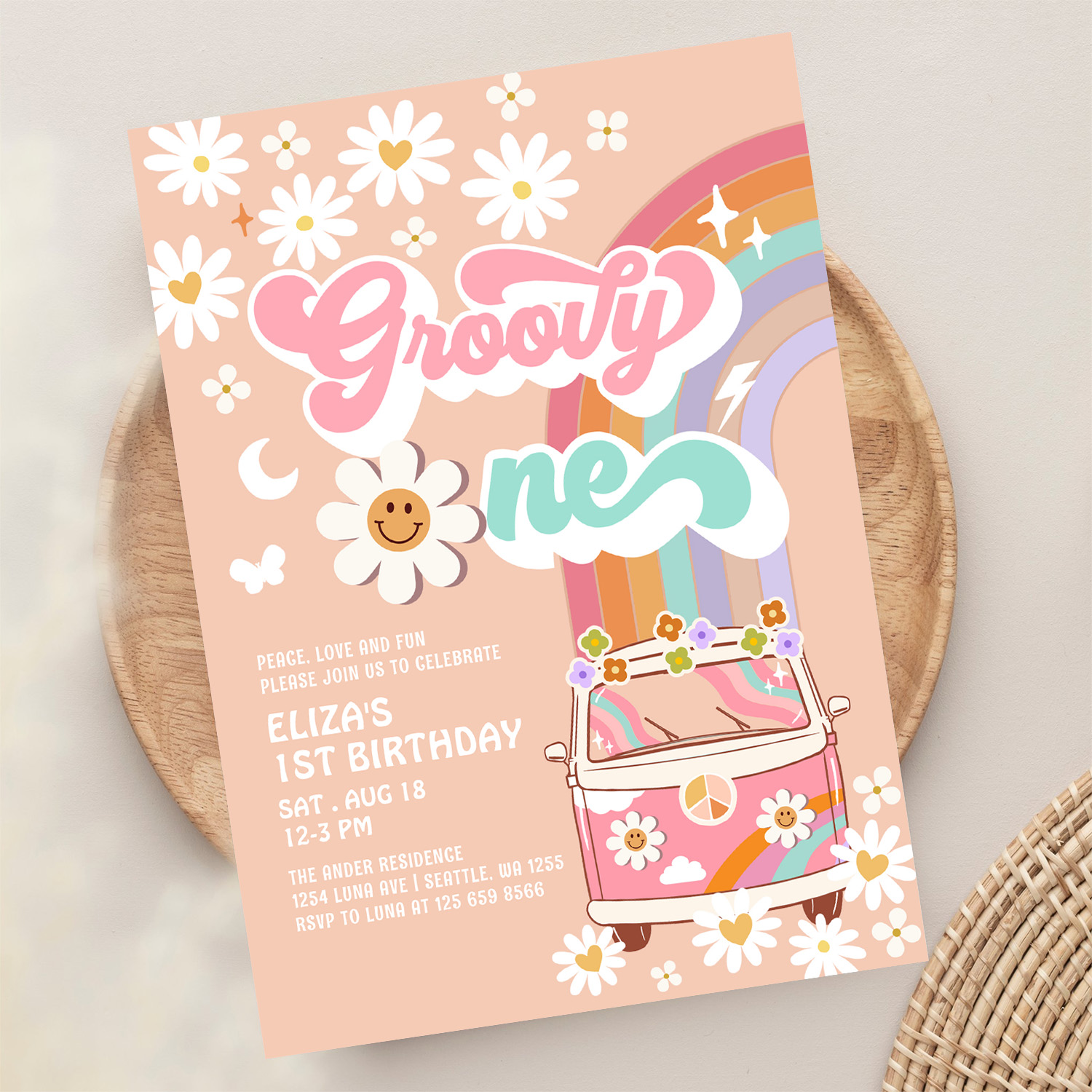 Groovy One Pink Daisy Rainbow Van 1st Birthday Invitation - Related products