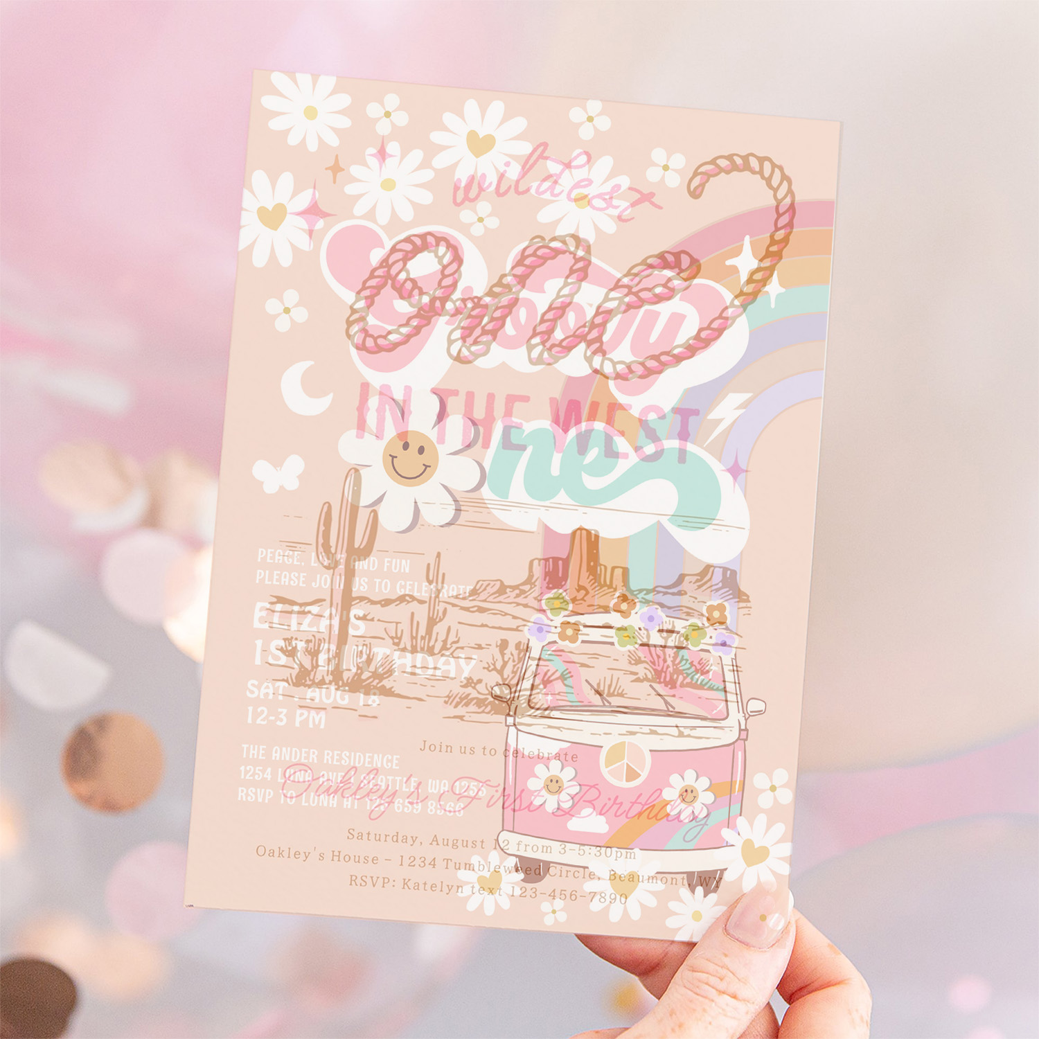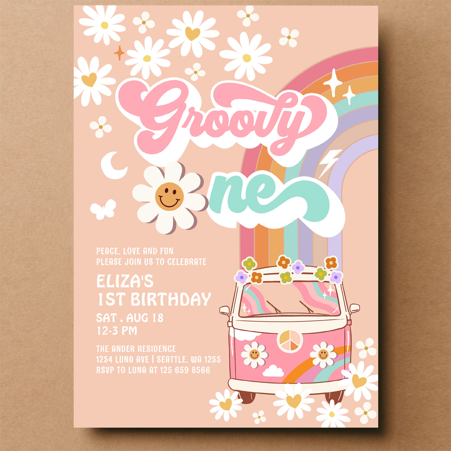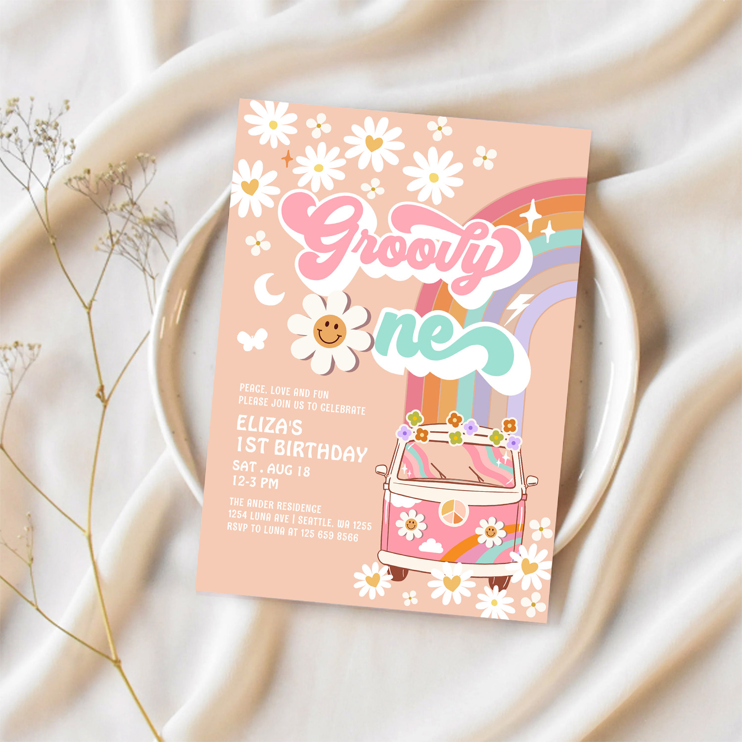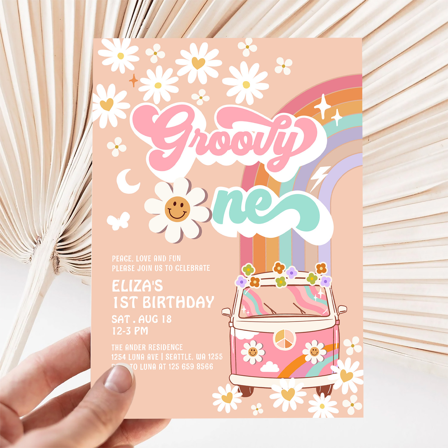 Groovy One Pink Daisy Rainbow Van 1st Birthday Invitation - Related products