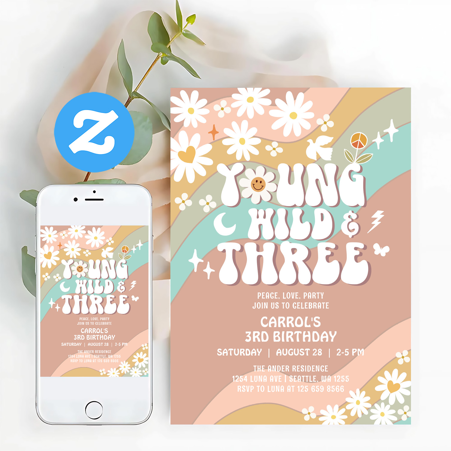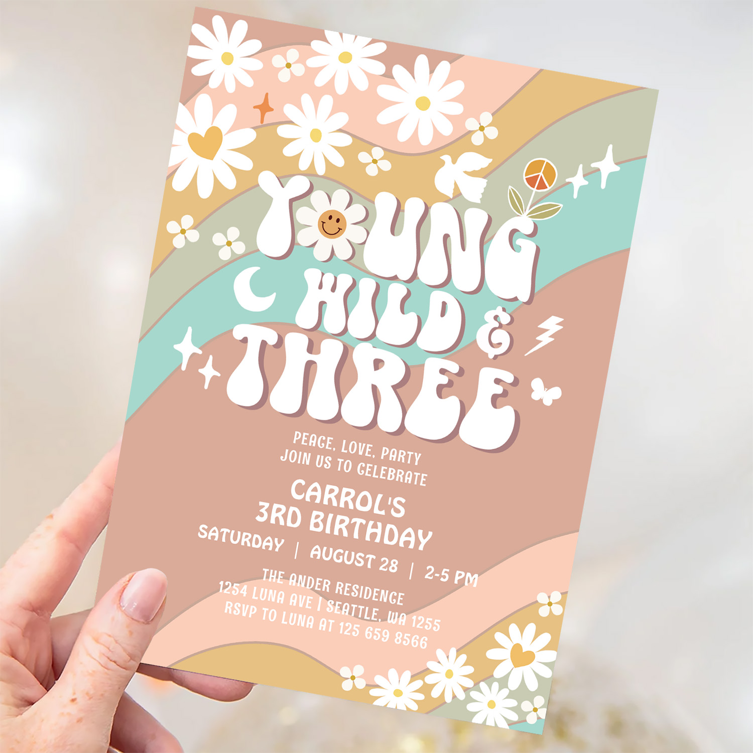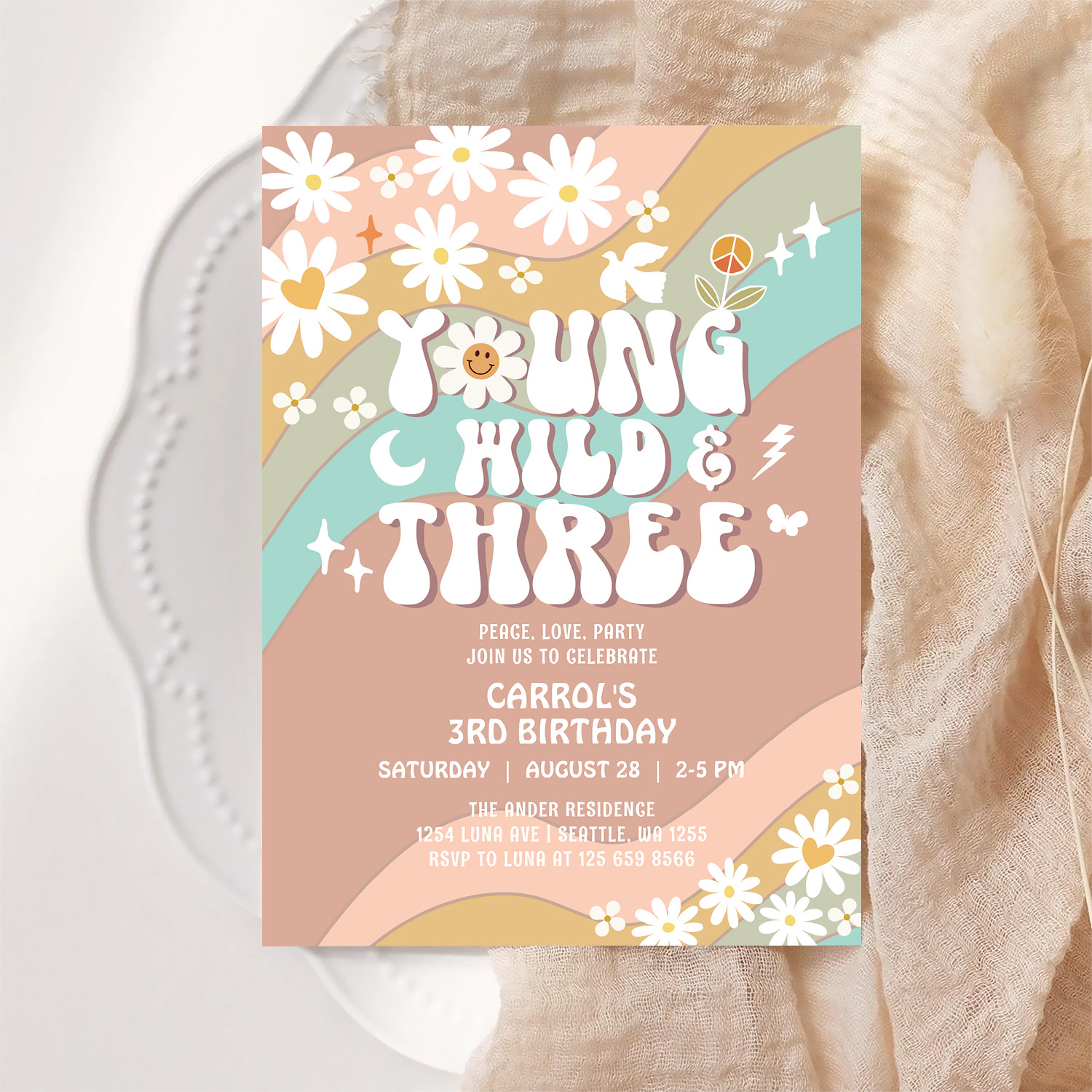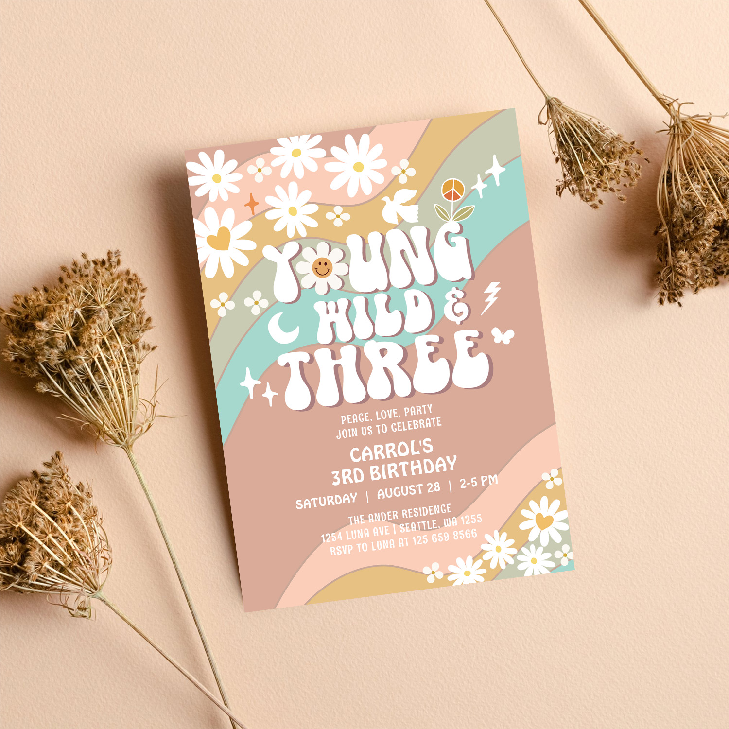 Groovy Young Wild And Three 3rd Birthday Invitation