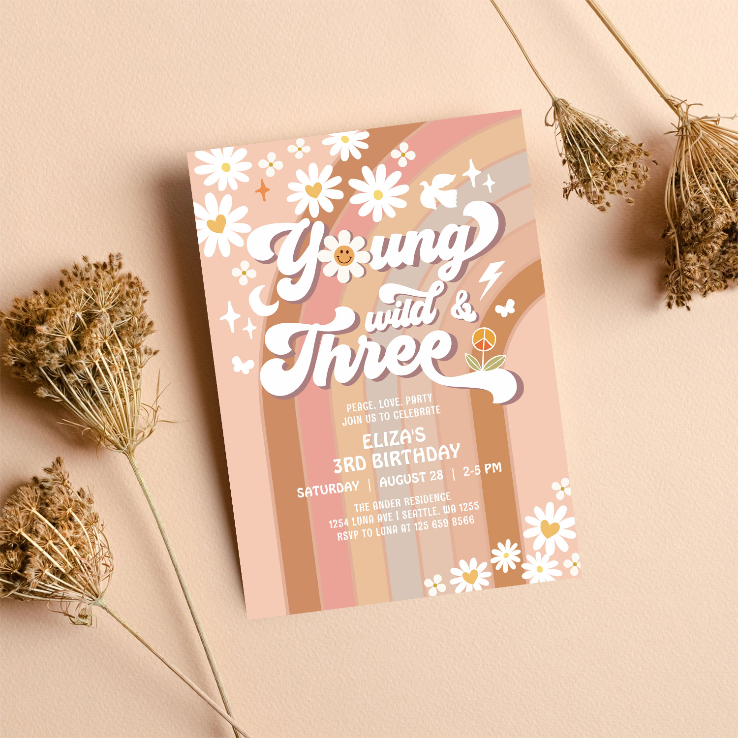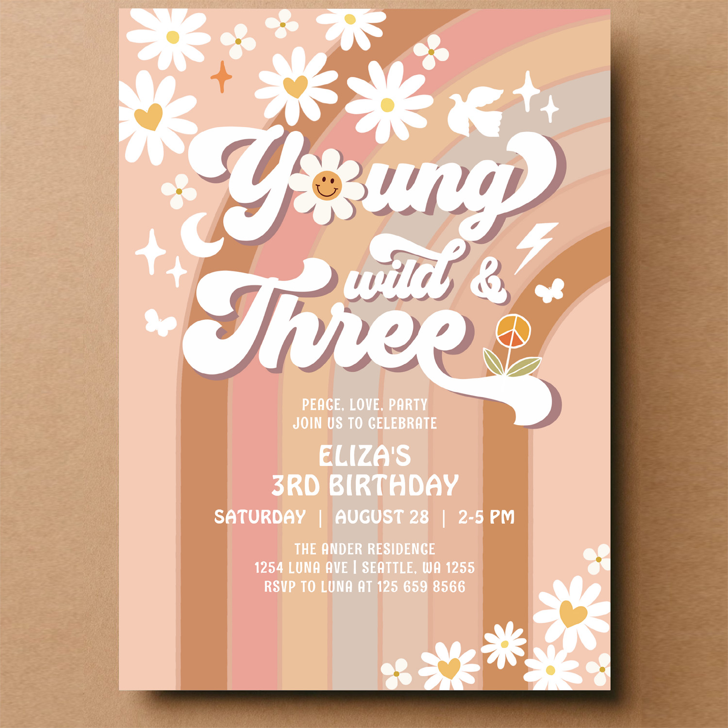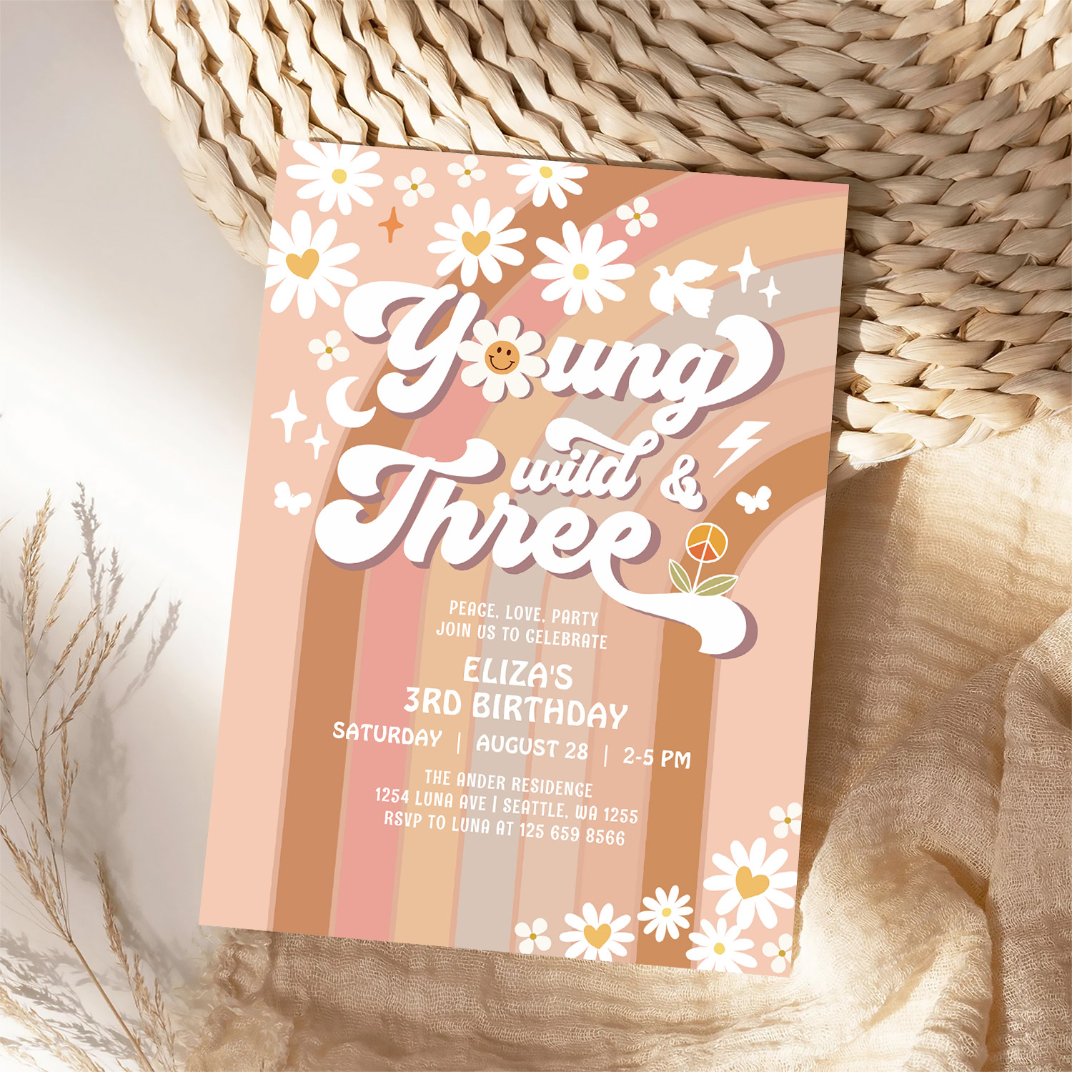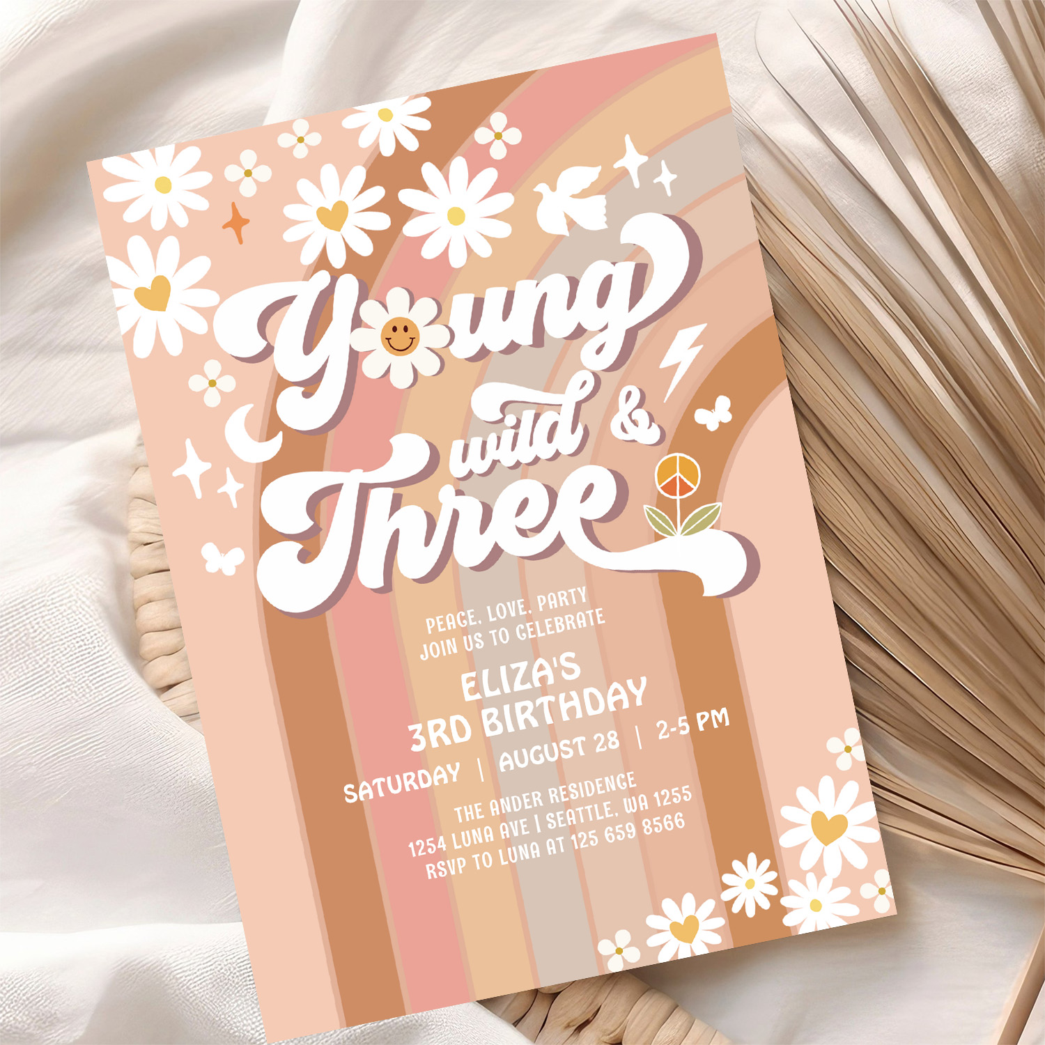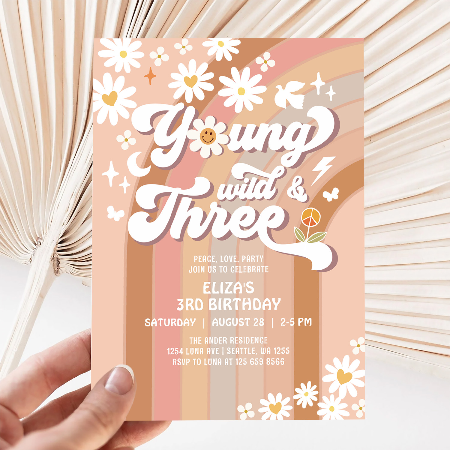 Groovy Young Wild And Three Mauve 3rd Birthday Invitation