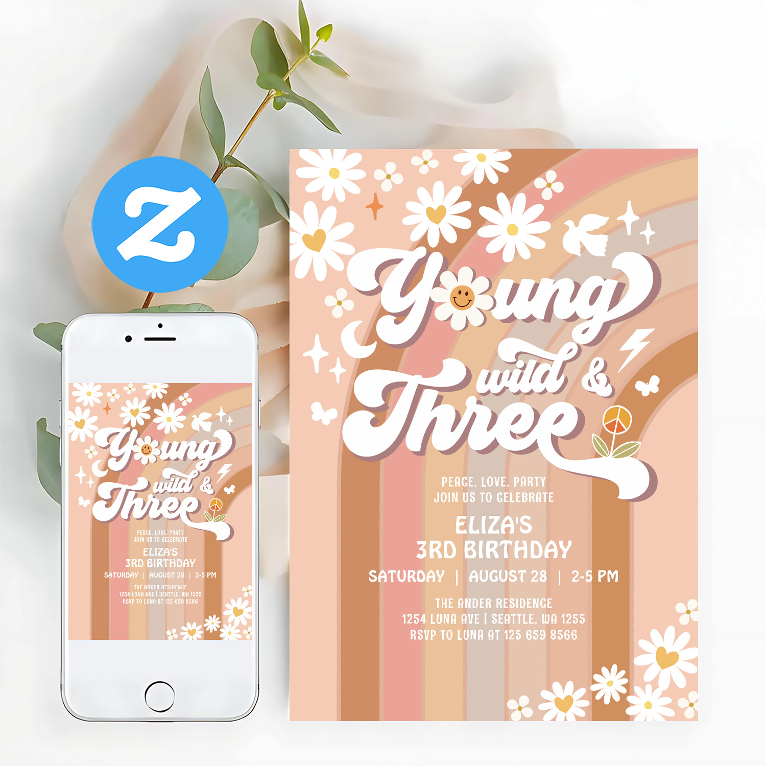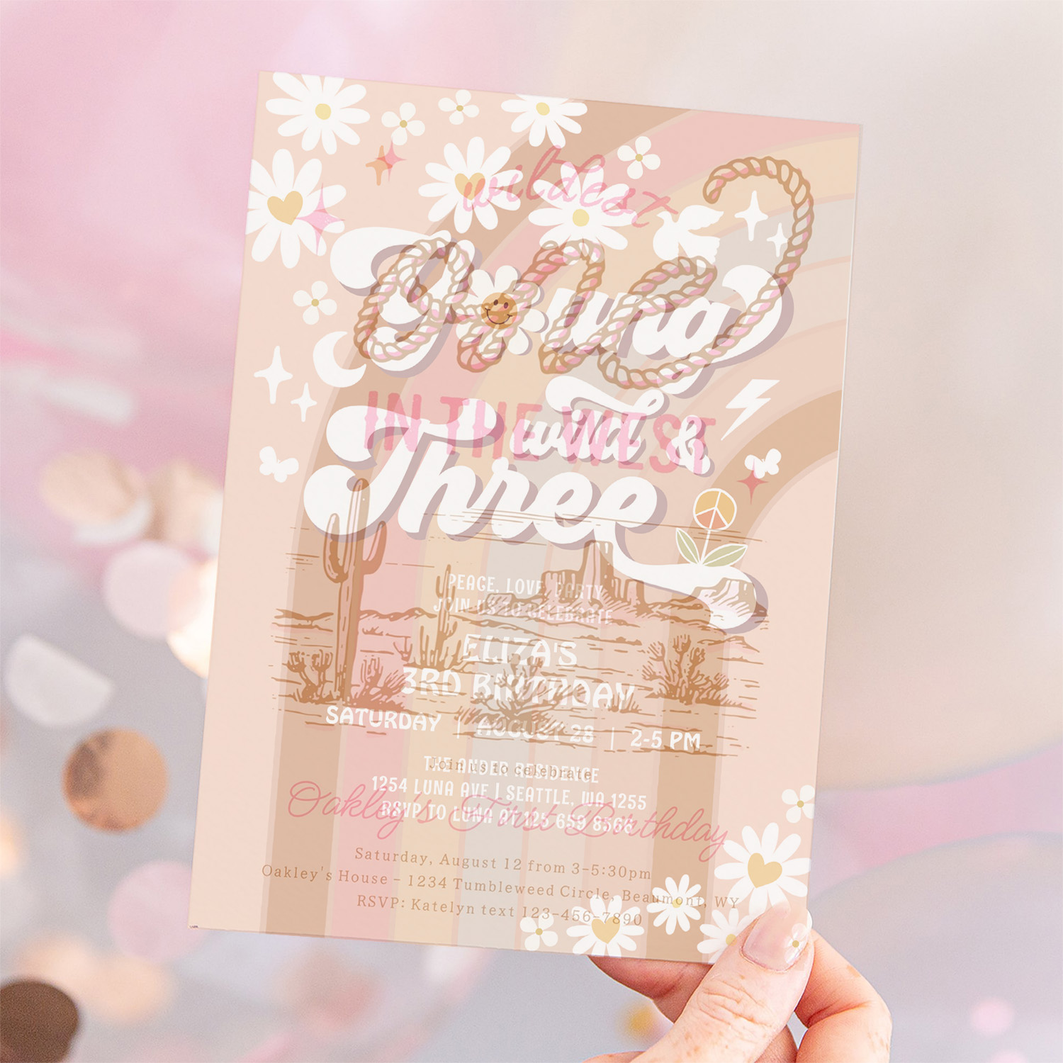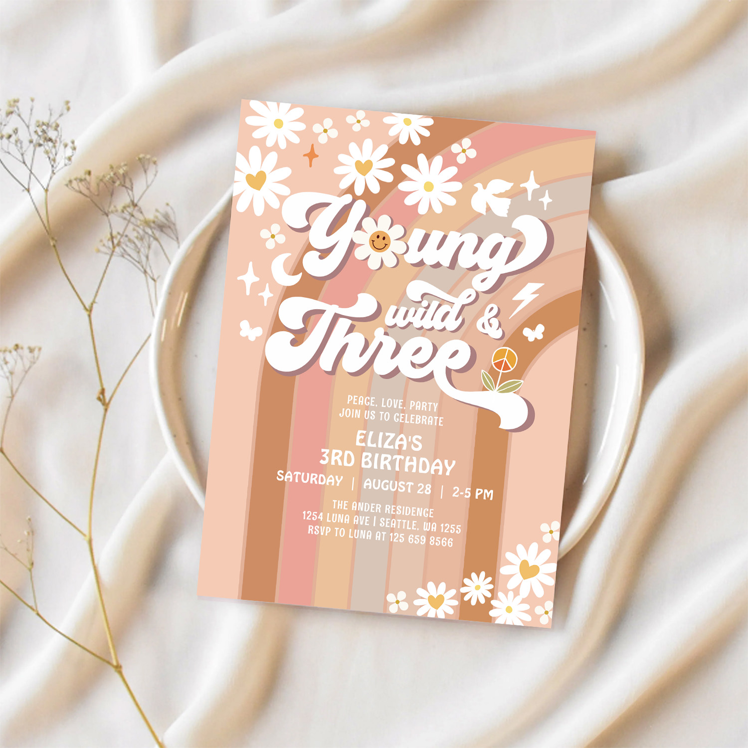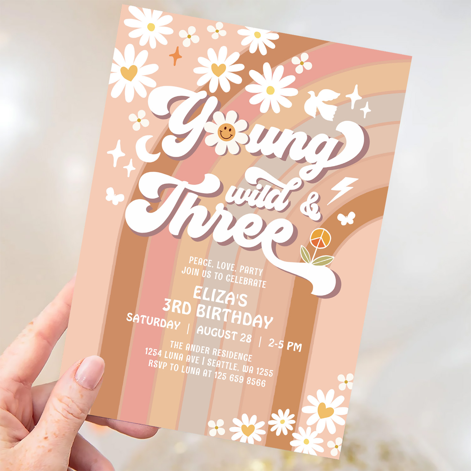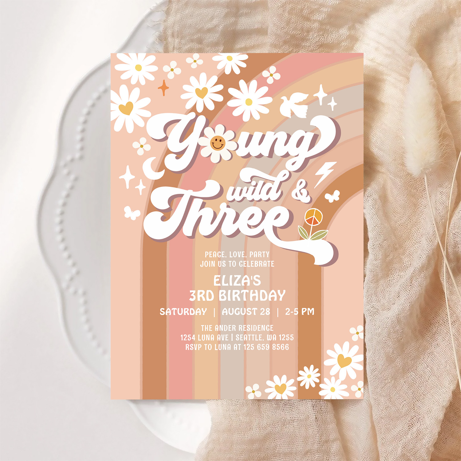 Groovy Young Wild And Three Mauve 3rd Birthday Invitation