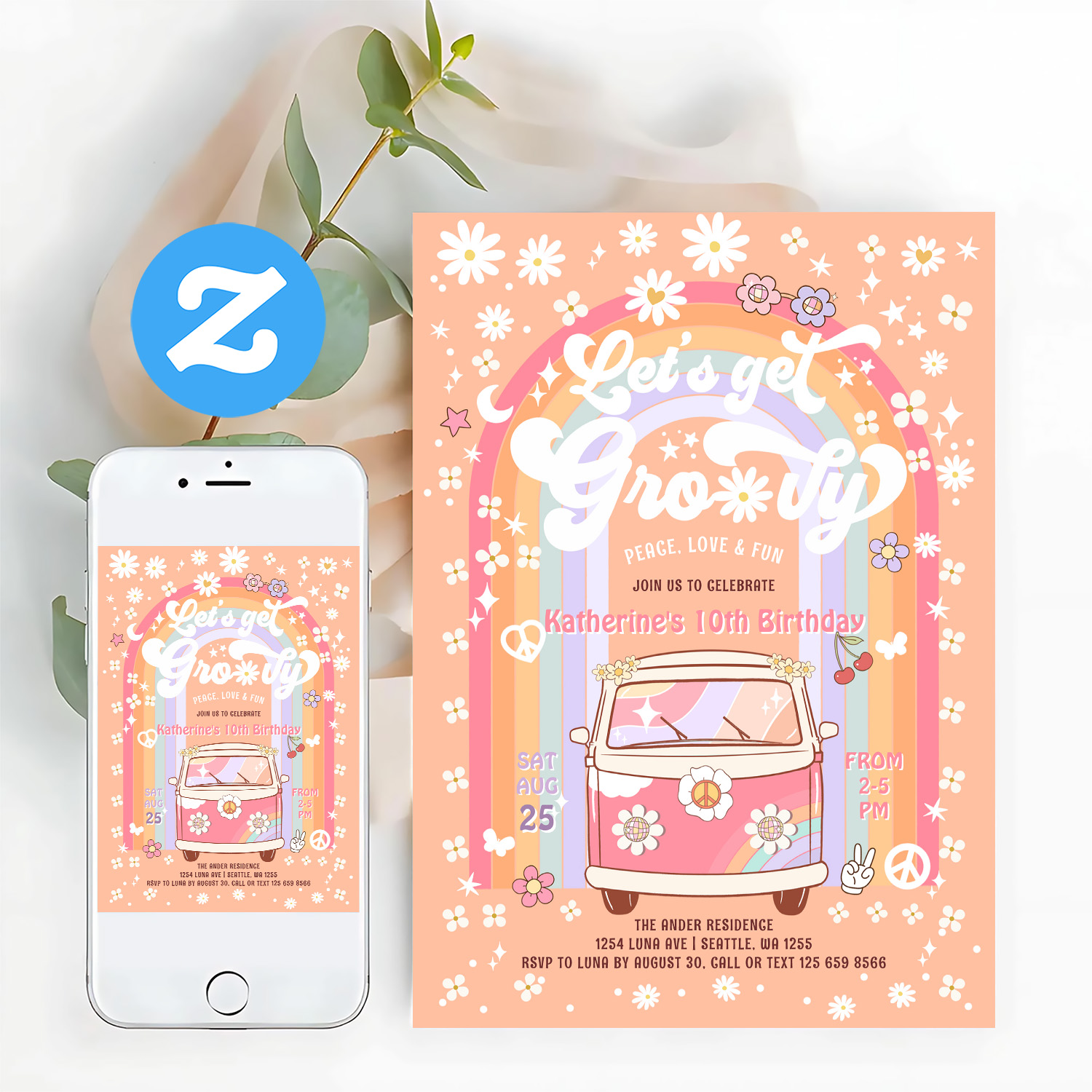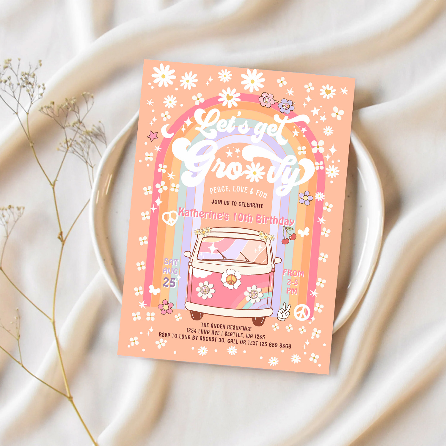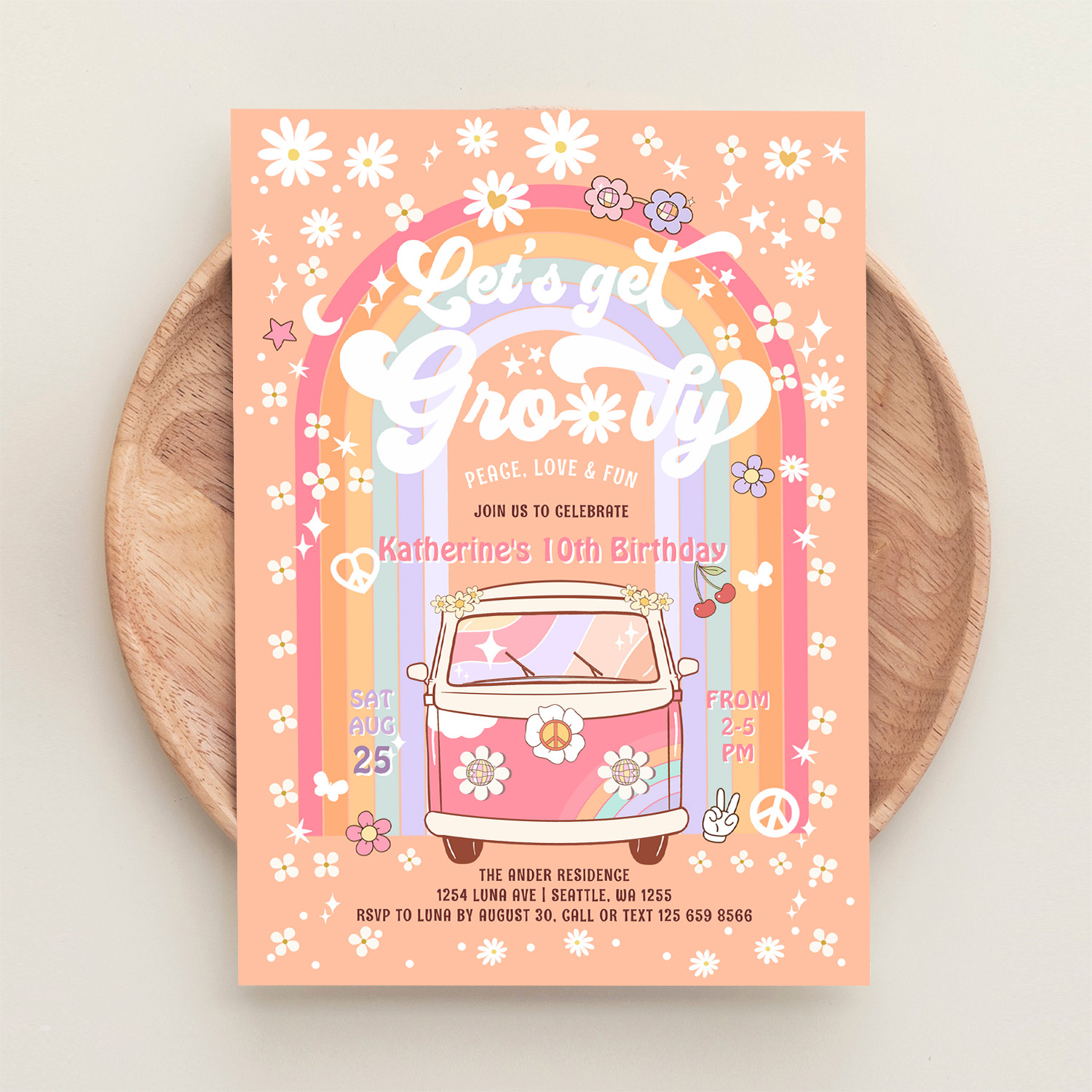 Lets Get Groovy Van Daisy Hippie 70S Birthday Invitation - Related products