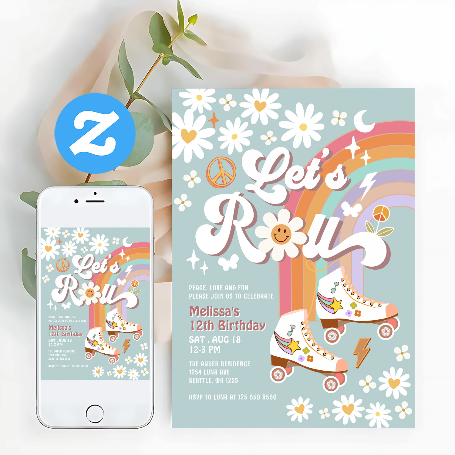 Lets Roll Retro Groovy Blue Roller Skate Birthday Invitation