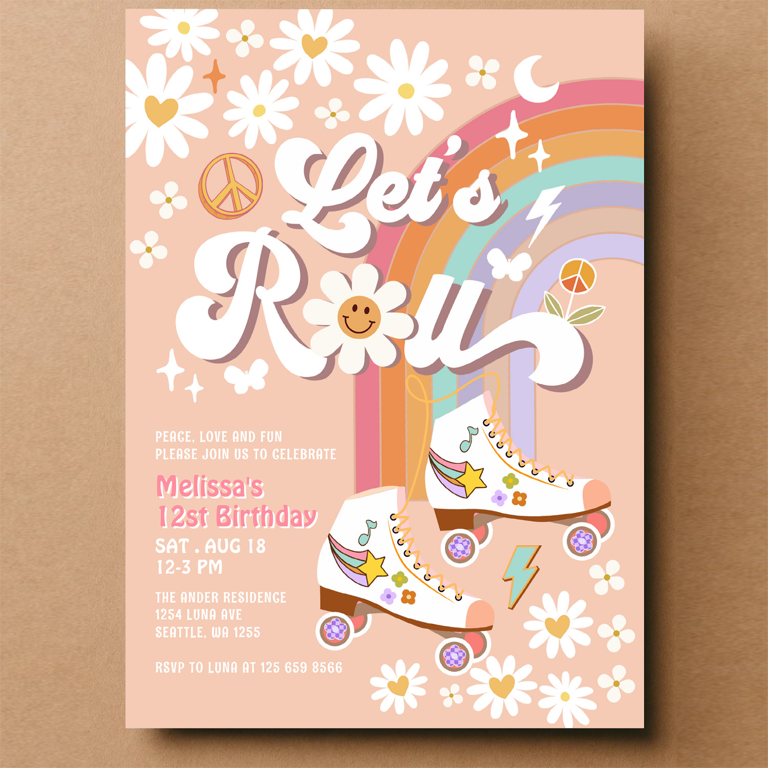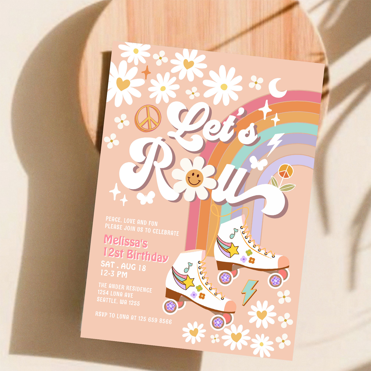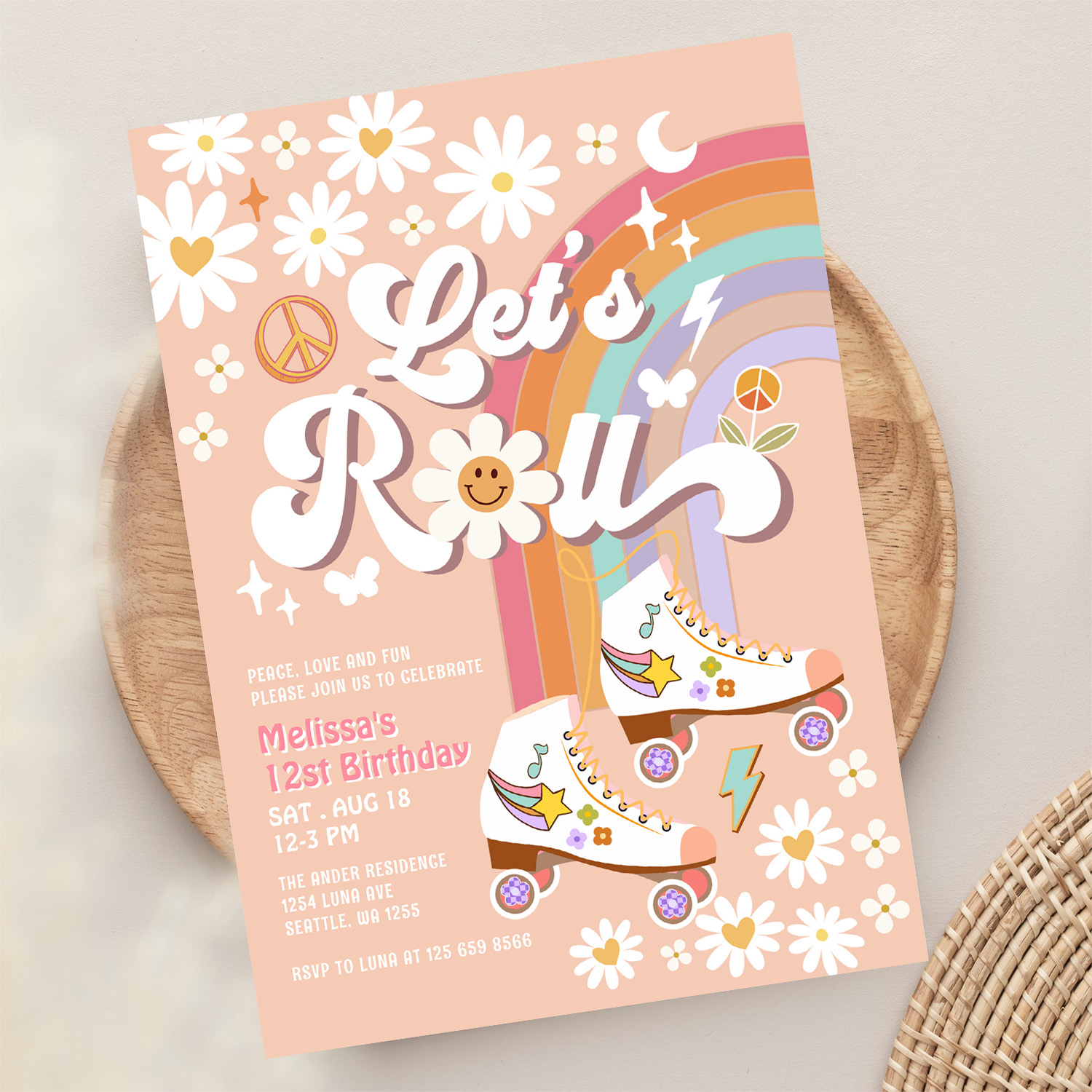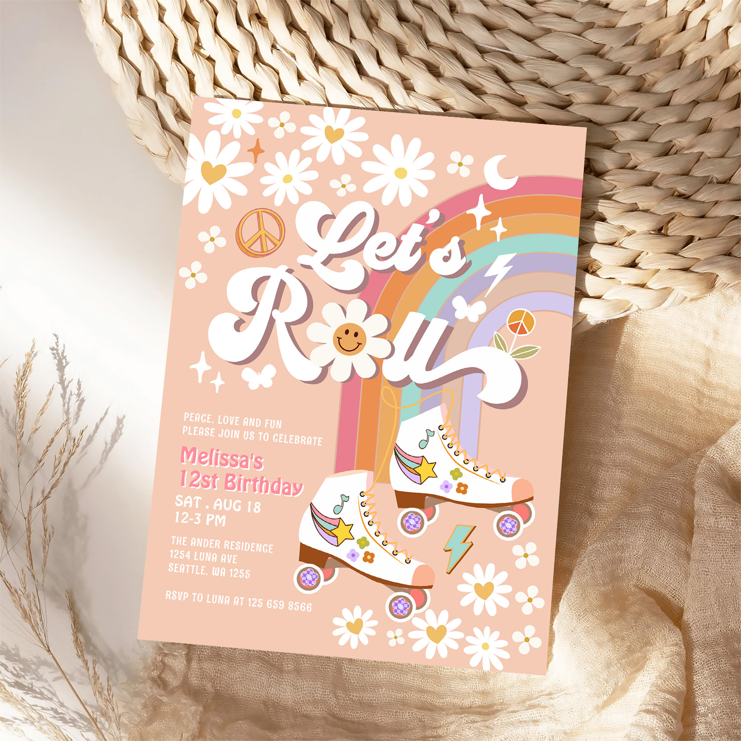 Lets Roll Retro Groovy Roller Skate Daisy Birthday Invitation